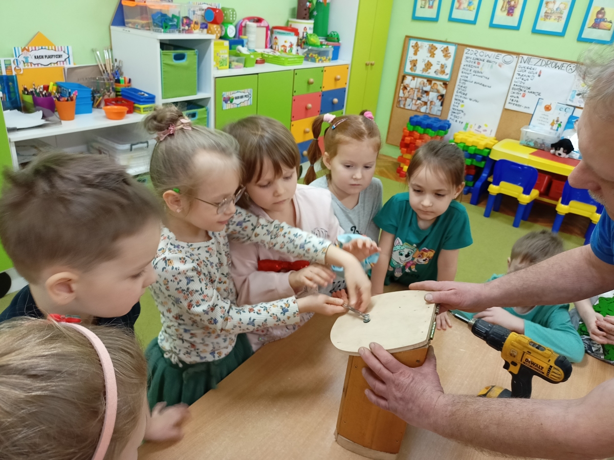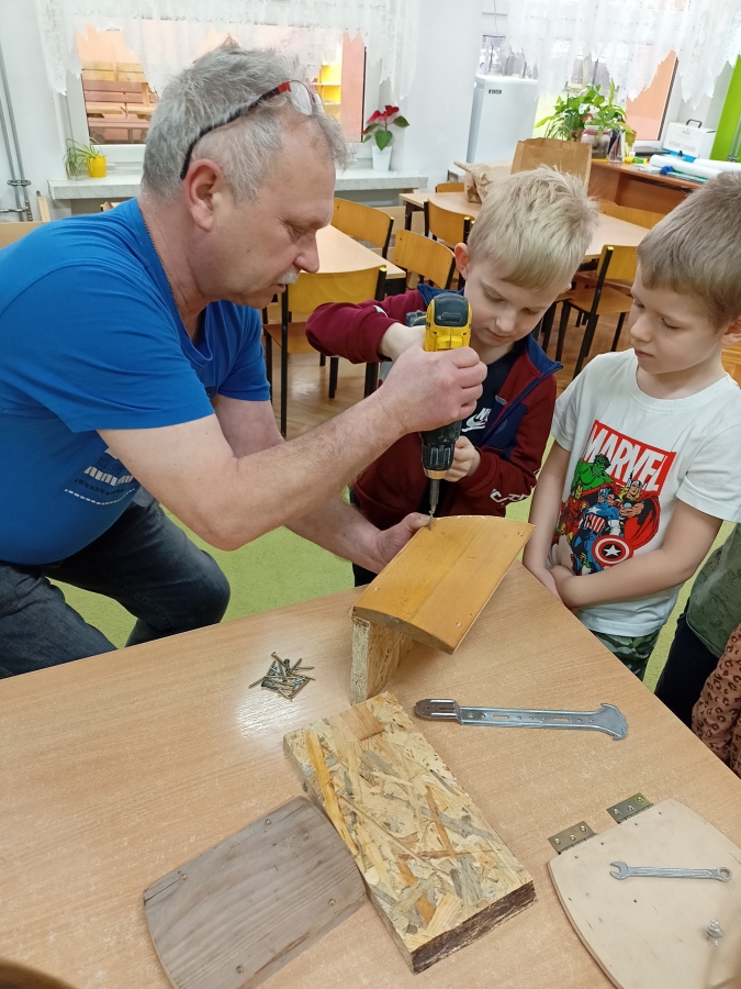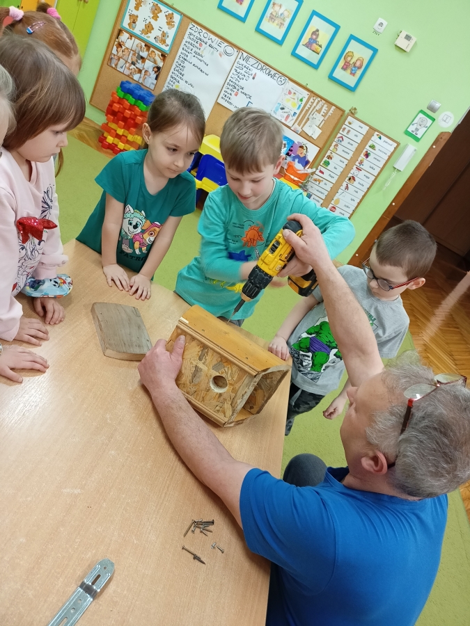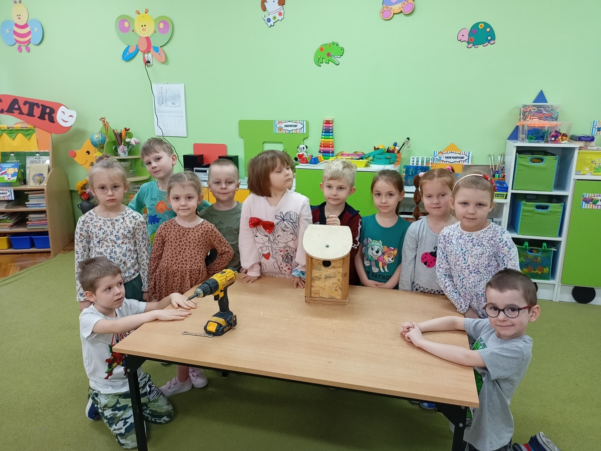 Przedszkolaki z grupy IV „Stokrotki” wzięły udział w tegorocznej edycji konkursu pt. „Zaprośmy ptaki do Tarnowa”, którego organizatorem jest Urząd Miasta Tarnowa przy współpracy z Zespołem Parków Krajobrazowych Województwa Małopolskiego. Celem podjętych w ramach konkursu działań było: aktywizacja dzieci, zachęcanie do podejmowania działań na rzecz środowiska, kształtowanie świadomości ekologicznej, zapoznanie z różnorodnością gatunkową ptaków, propagowanie aktywnych form ochrony ptaków, kształtowanie kreatywnego myślenia w aspekcie ochrony środowiska naturalnego, rozwijanie zamiłowań do przyrody poprzez zachęcanie dzieci do obserwacji ornitologicznych w najbliższym otoczeniu. Dzieci aktywnie uczestniczyły w samodzielnym budowaniu budki lęgowej dla ptaków. We wspólnym tworzeniu projektu pomagał nam konserwator – Pan Grzegorz. Domek dla ptaków został zawieszony w naszym ogrodzie przedszkolnym, zapraszając tym samym ptaki do jego zamieszkania. Prowadzone obserwacje przyrodnicze są okazją do dalszej obserwacji, słuchania śpiewu ptaków, a także oczekiwania na pisklęta. Podjęte działania przyniosły nam wiele miłych chwil i dużo radości.