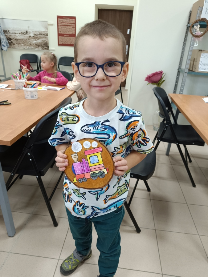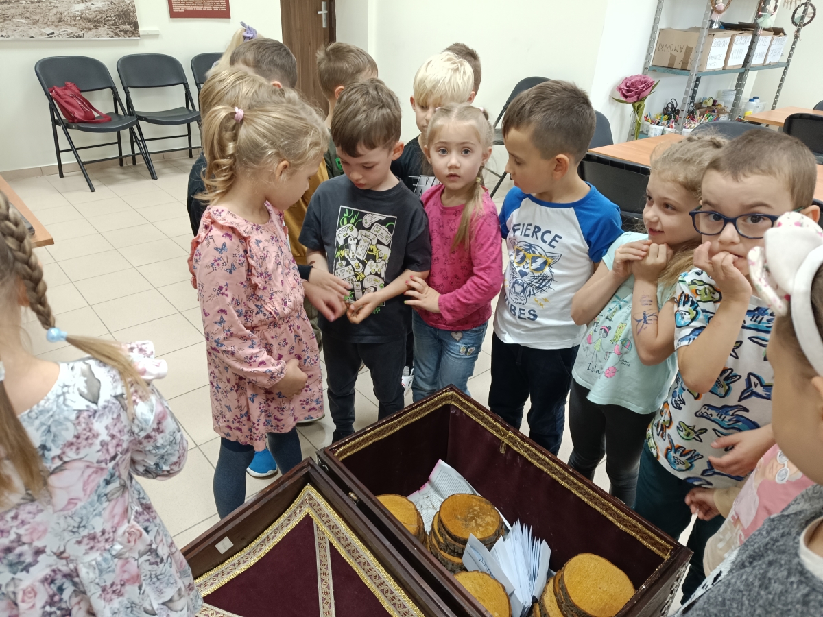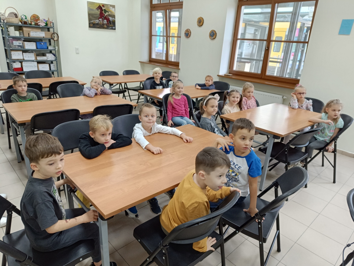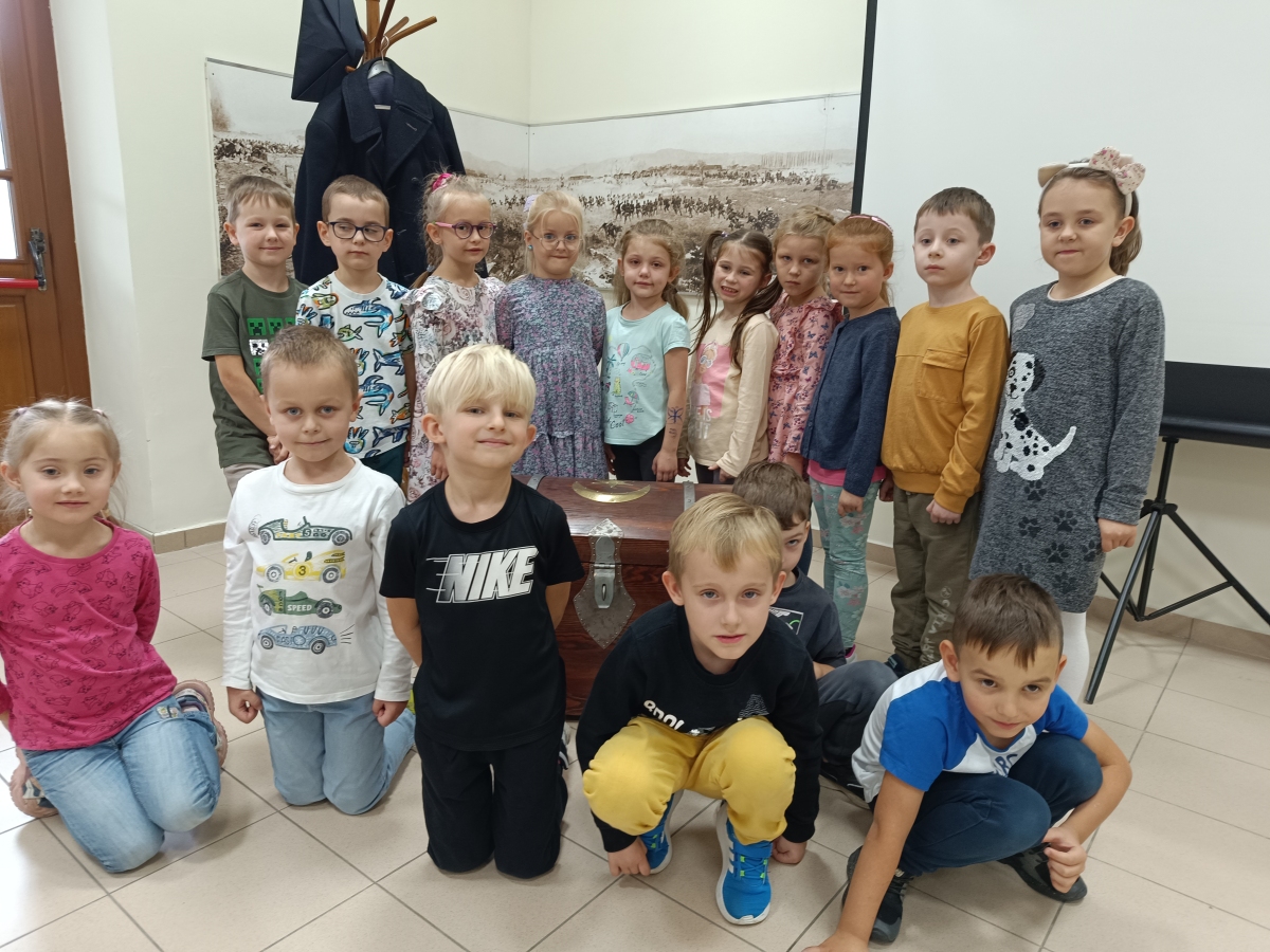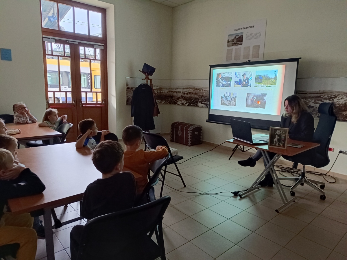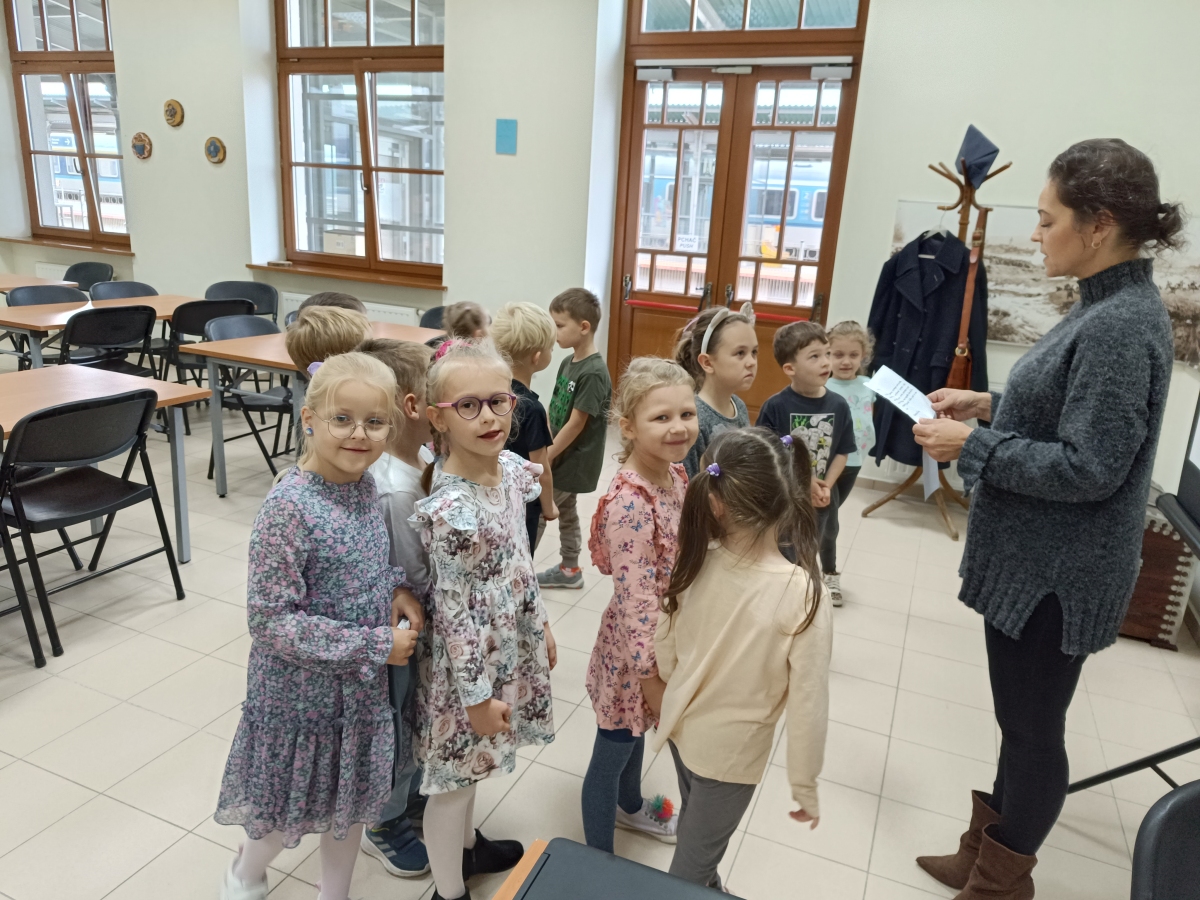 Dnia 13.10.2023 dzieci z grupy „Stokrotki” wzięły udział w lekcji muzealnej pt. „Zagadki Pana Kolejarza” zorganizowanej przez Muzeum Okręgowe w Tarnowie Oddział Galeria „Panorama”. Przedszkolaki obejrzały prezentację multimedialnej, dzięki której poznały różne rodzaje pociągów, lokomotyw oraz pracowników kolei. Kolejarz pan Alojzy ze swoim psem Bazylem ukrył dla dzieci listy, a w nich zadania i zagadki. Po ich znalezieniu i wykonaniu „Stokrotki” otrzymały szyfr do skrzyni, a w niej był schowany klucz do lokomotywy. Były tam również drewniane krążki i obrazki z lokomotywą, które po pokolorowaniu dzieci zabrał sobie do domu. Ciekawa forma i treść zajęć dostarczyła przedszkolakom wielu wiadomości i pozytywnych wrażeń.