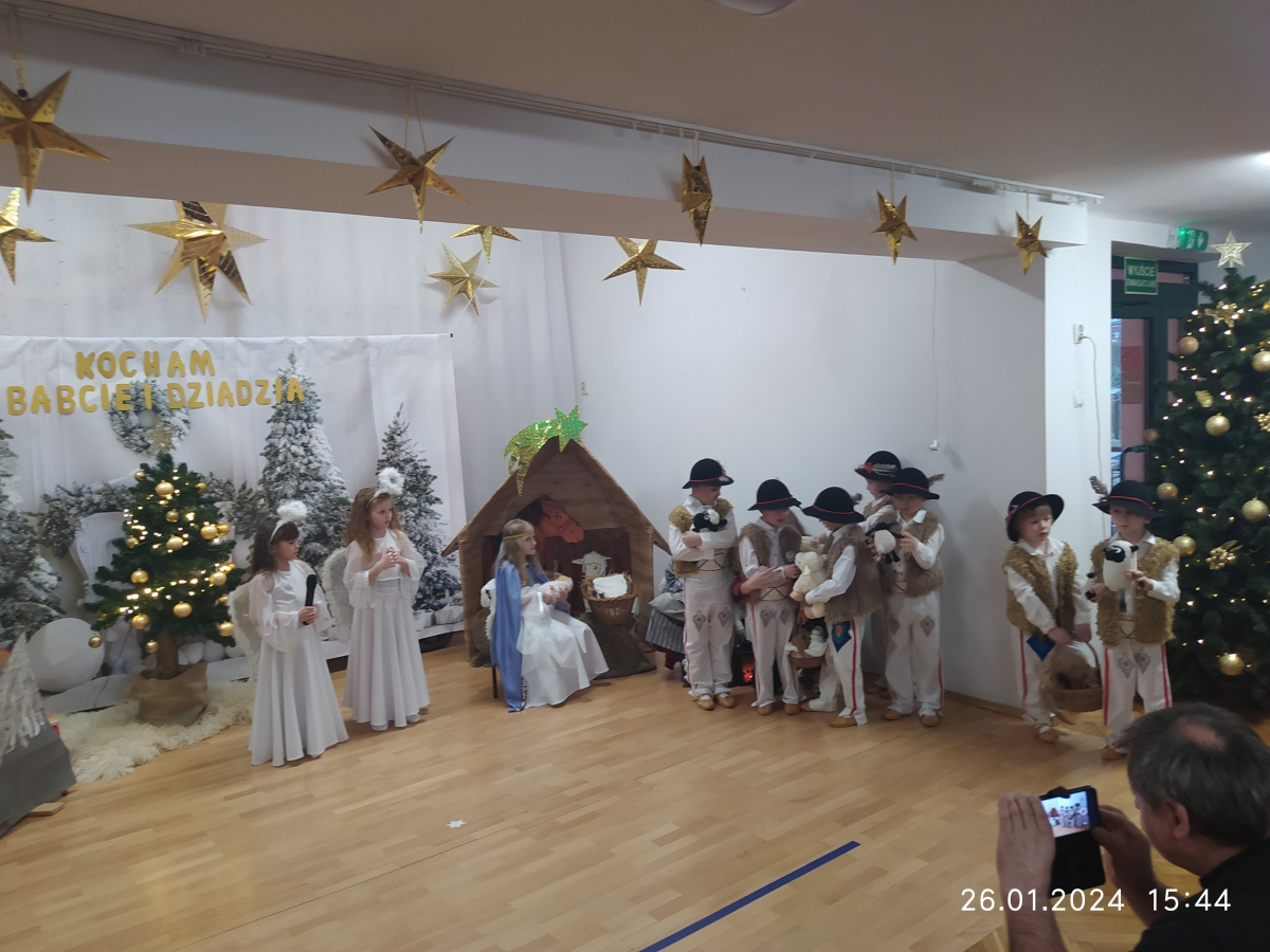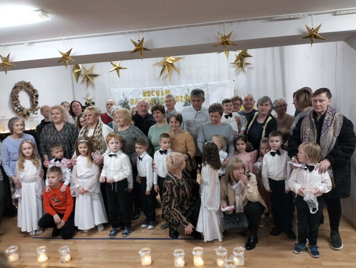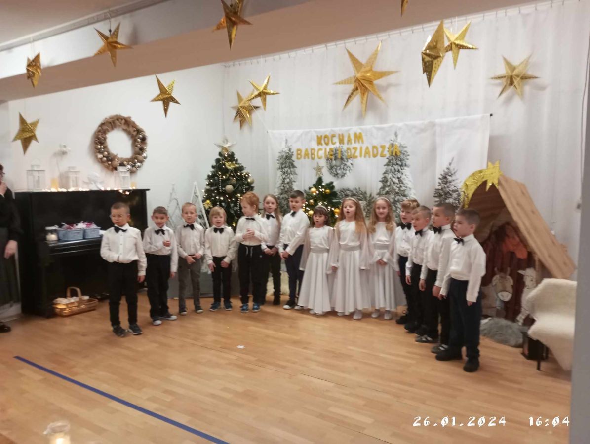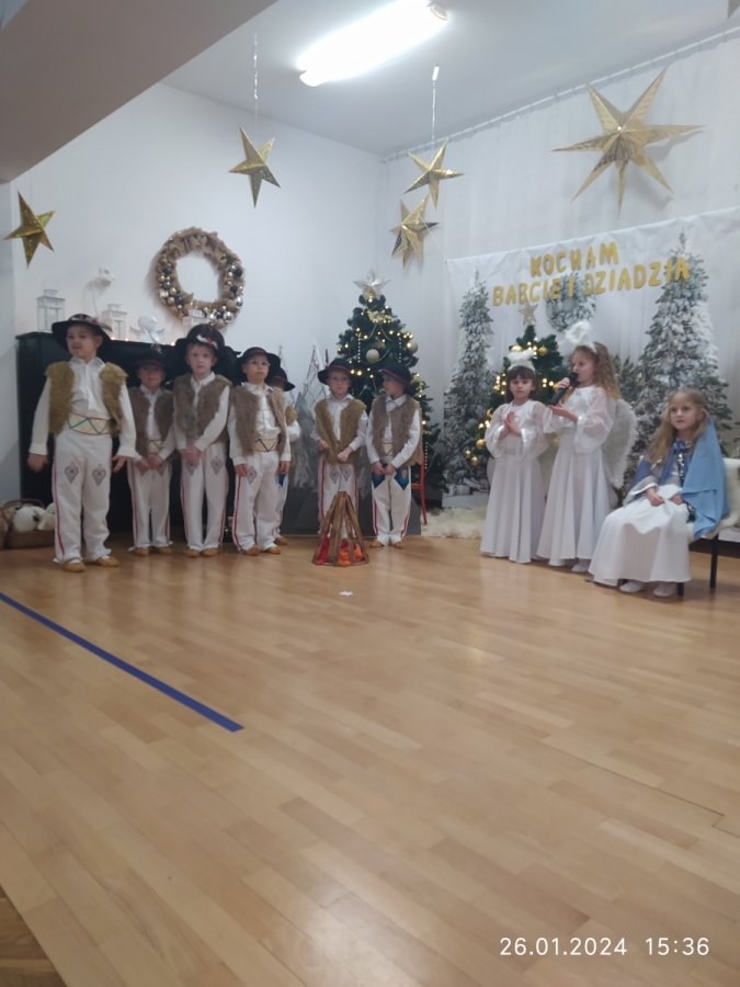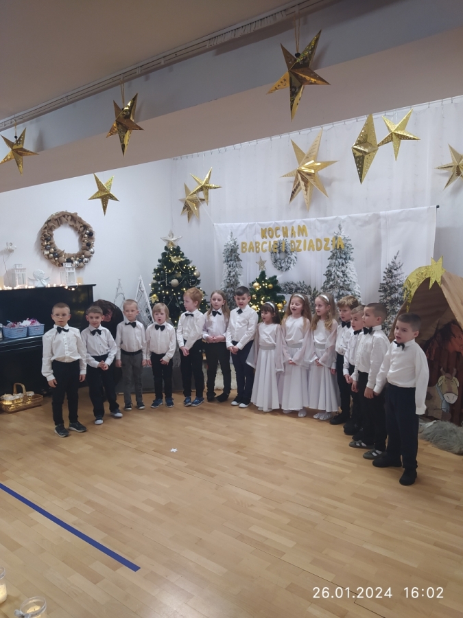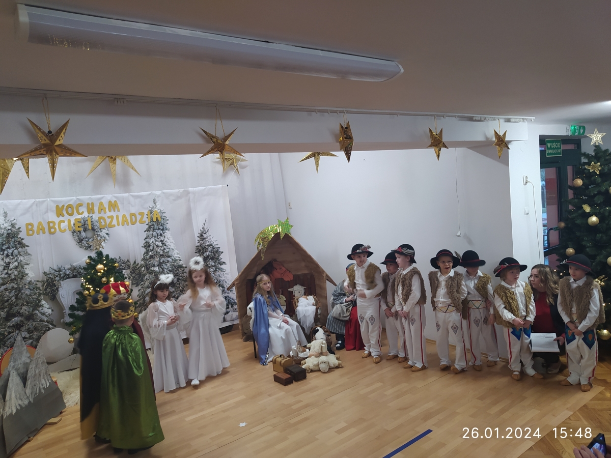 Goście zaproszeni na uroczystość Dnia Babci i Dziadka przez dzieci z gr. VI, obejrzeli “Jasełka”, a życzenia dzieci wyraziły w piosenkach i wierszach dedykowanych ukochanym Babciom i Dziadziom. Uroczystość zakończyła się wspólnym zdjęciem i wręczeniem przygotowanych laurek. Występ dzieci wywołał radość, dumę i zadowolenie, ale też niejedna łezka wzruszenia pojawiła się na twarzach zgromadzonych widzów.