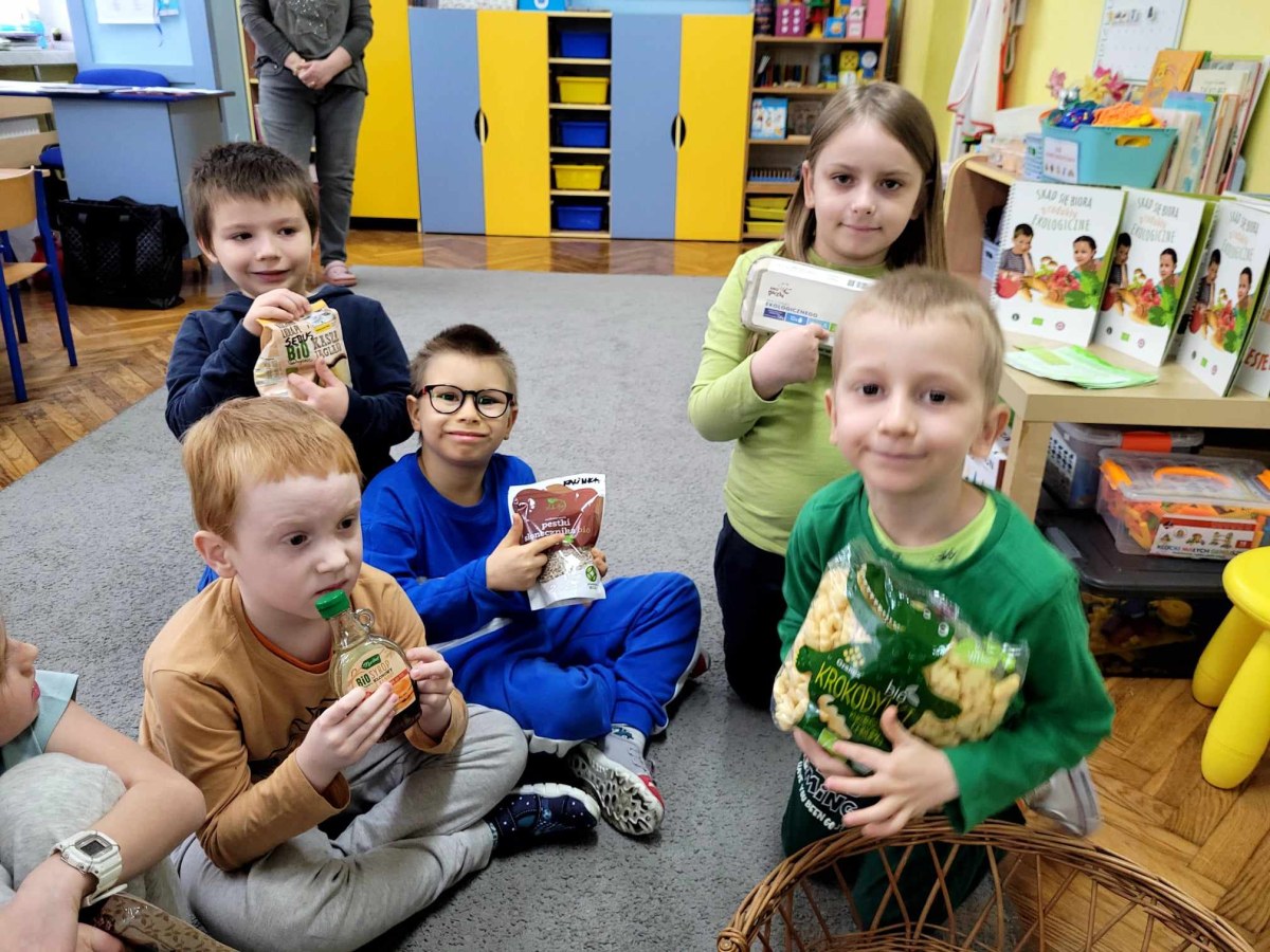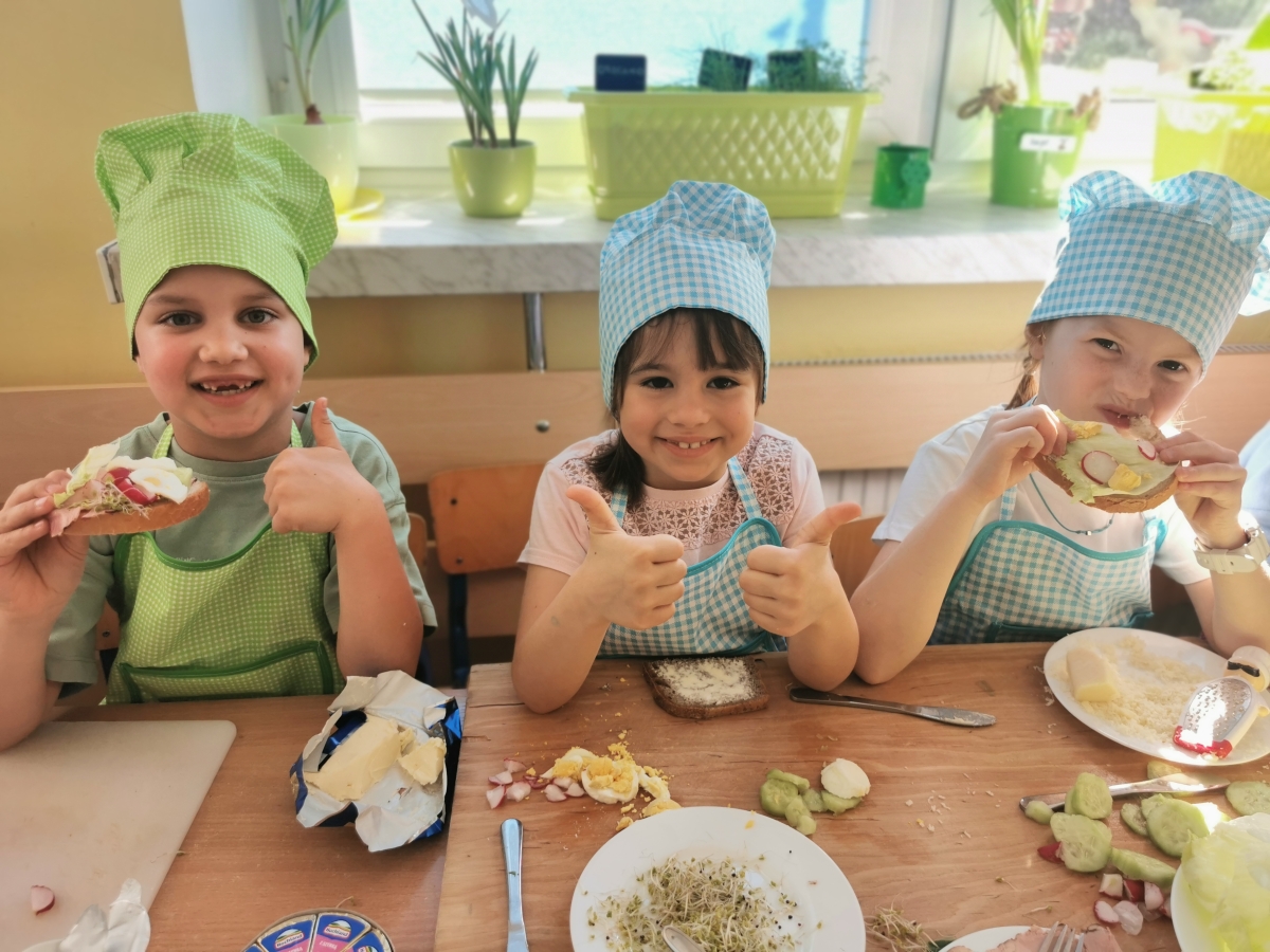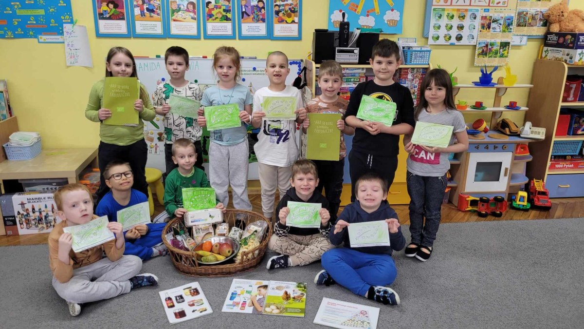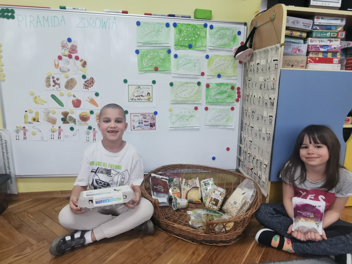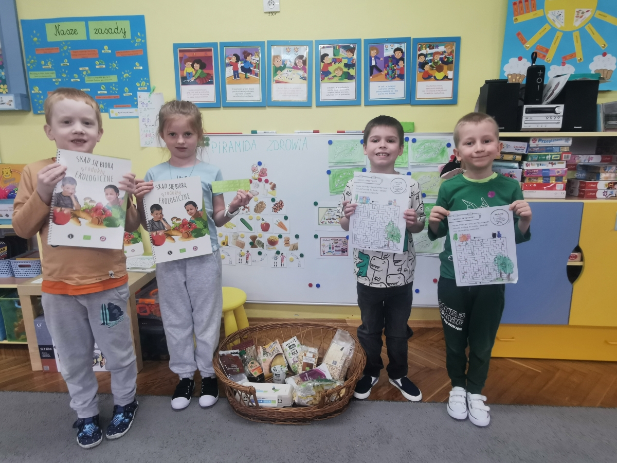 Grupa VI i w tym roku realizowała ekologiczno – zdrowotny program edukacyjny pt.: „Skąd się biorą produkty ekologiczne”. Celem programu jest zwiększanie świadomości i wiedzy na temat rolnictwa ekologicznego oraz budowanie właściwych nawyków żywieniowych od najmłodszych lat. Zajęcia Słoneczka zaczęły od oglądnięcia filmu animowanego „Skąd się biorą produkty ekologiczne”. Następnie założyliśmy w sali kącik zdrowej żywności, do którego każdy mógł przynieść z domu ekologiczny produkt z zielonym listkiem. Następnie degustowaliśmy nasze zdrowe produkty i wszyscy jednogłośnie stwierdzili, że ekologiczne = smaczne. Klasyfikowaliśmy produkty ze względu na zdrowe i nie służące naszemu zdrowiu, by kolejno ułożyć piramidę zdrowego żywienia, utrwalając w ten sposób zasady zdrowego i racjonalnego odżywiania. Na koniec cyklu naszych zajęć wykonaliśmy zdrowe kanapki, wykorzystując szczypiorek i cebulkę z własnej hodowli. Teraz już wiemy, skąd się biorą produkty ekologiczne, dlaczego warto je wybierać i jakie są zalecenia by zdrowo żyć.