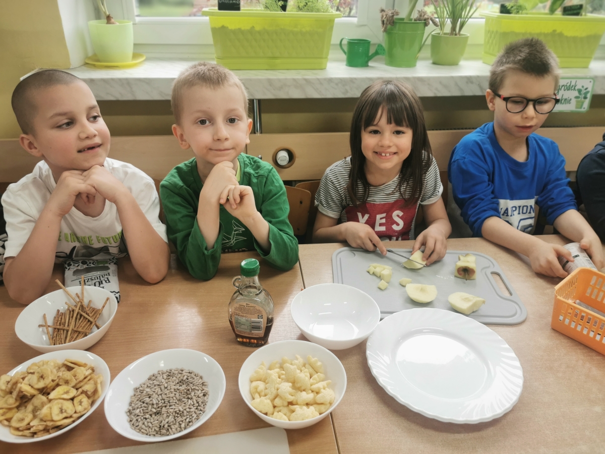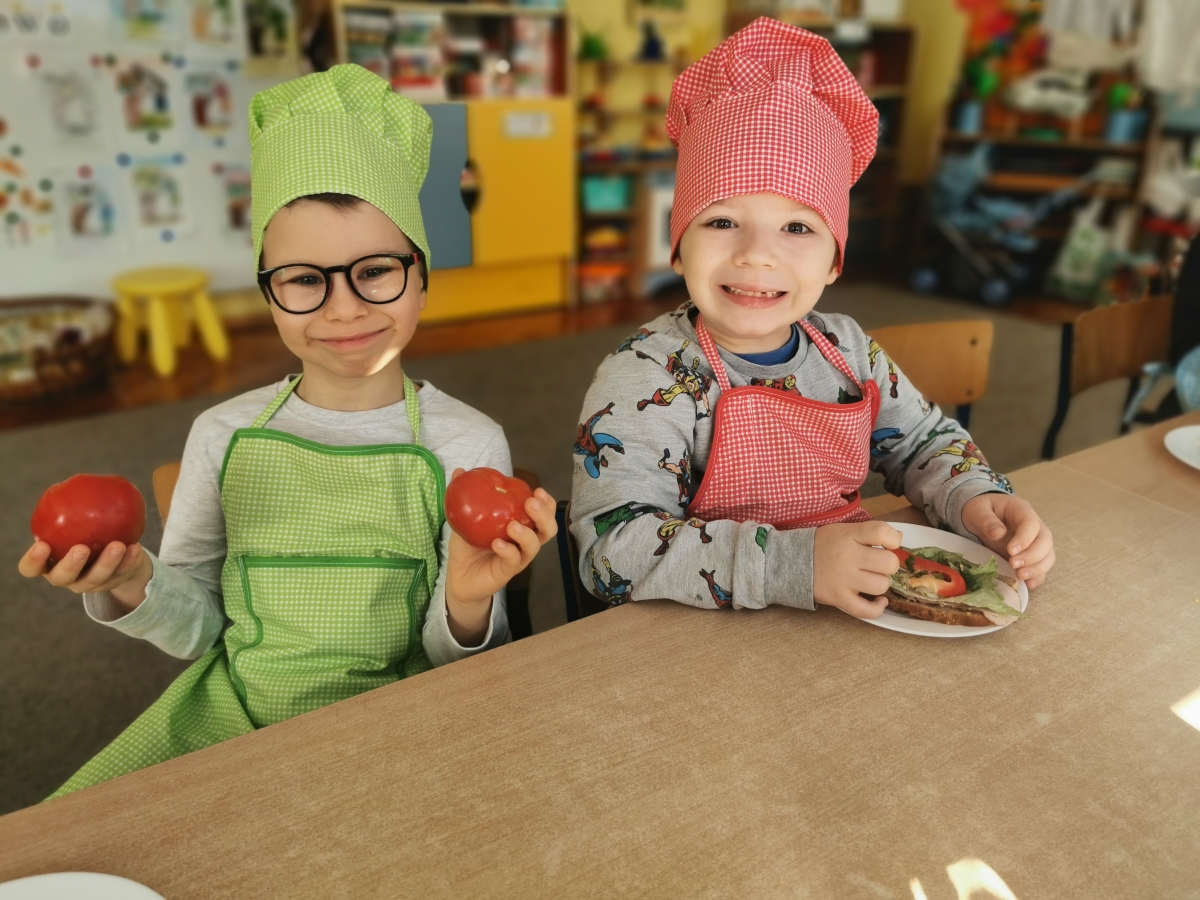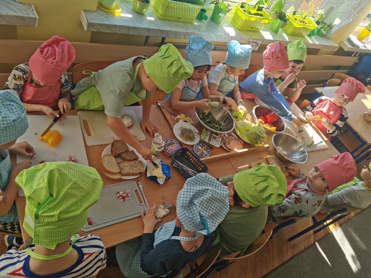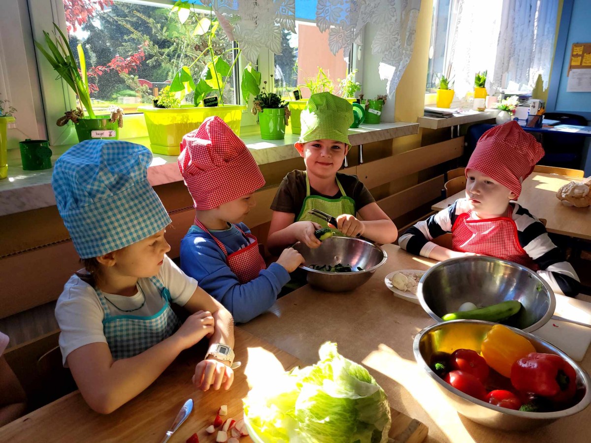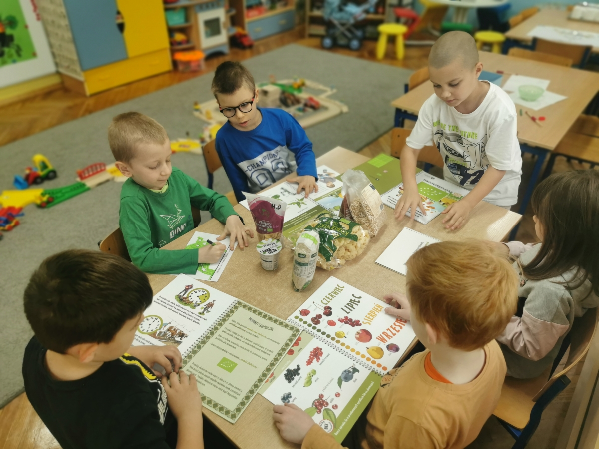 Grupa VI i w tym roku realizowała ekologiczno – zdrowotny program edukacyjny pt.: „Skąd się biorą produkty ekologiczne”. Celem programu jest zwiększanie świadomości i wiedzy na temat rolnictwa ekologicznego oraz budowanie właściwych nawyków żywieniowych od najmłodszych lat. Zajęcia Słoneczka zaczęły od oglądnięcia filmu animowanego „Skąd się biorą produkty ekologiczne”. Następnie założyliśmy w sali kącik zdrowej żywności, do którego każdy mógł przynieść z domu ekologiczny produkt z zielonym listkiem. Następnie degustowaliśmy nasze zdrowe produkty i wszyscy jednogłośnie stwierdzili, że ekologiczne = smaczne. Klasyfikowaliśmy produkty ze względu na zdrowe i nie służące naszemu zdrowiu, by kolejno ułożyć piramidę zdrowego żywienia, utrwalając w ten sposób zasady zdrowego i racjonalnego odżywiania. Na koniec cyklu naszych zajęć wykonaliśmy zdrowe kanapki, wykorzystując szczypiorek i cebulkę z własnej hodowli. Teraz już wiemy, skąd się biorą produkty ekologiczne, dlaczego warto je wybierać i jakie są zalecenia by zdrowo żyć.