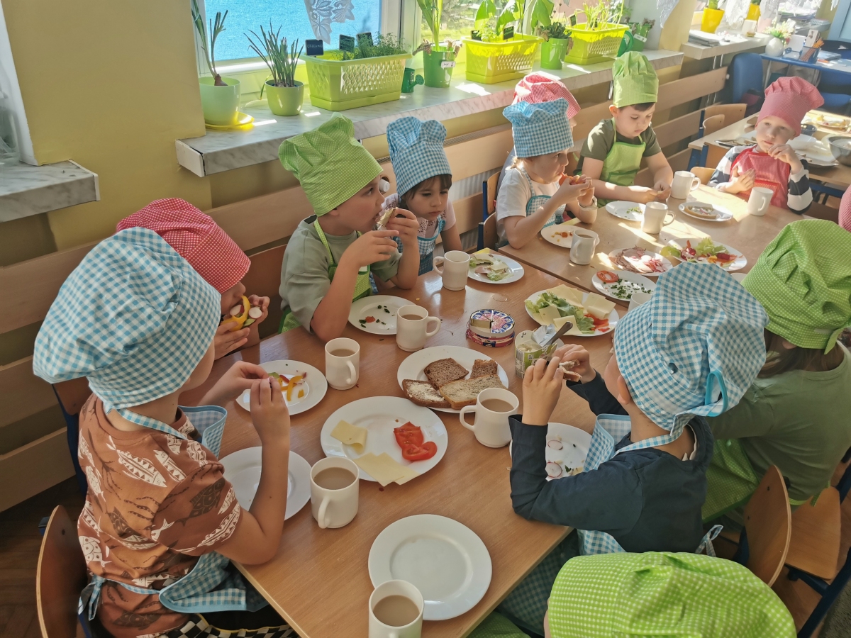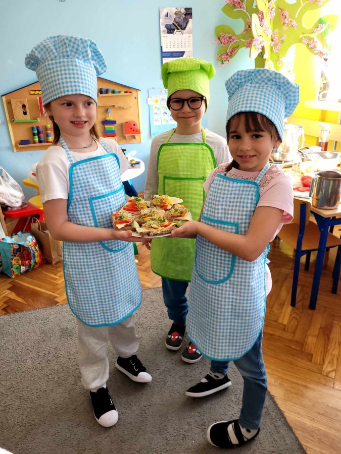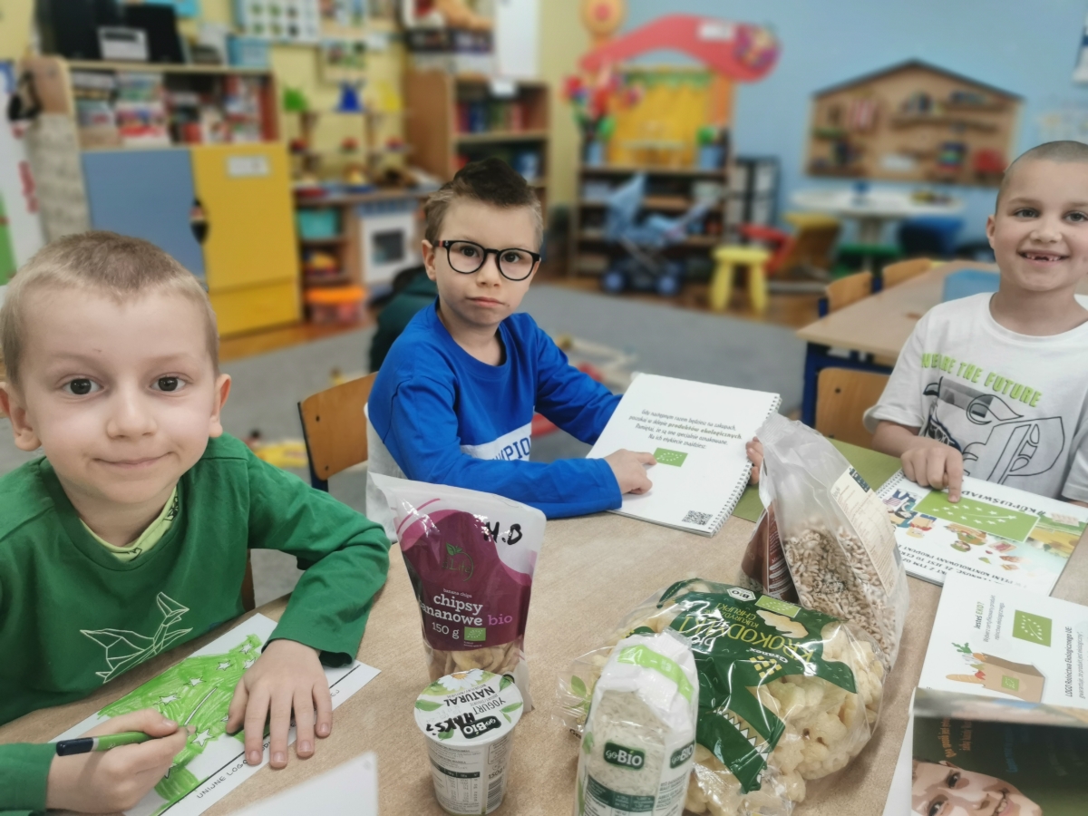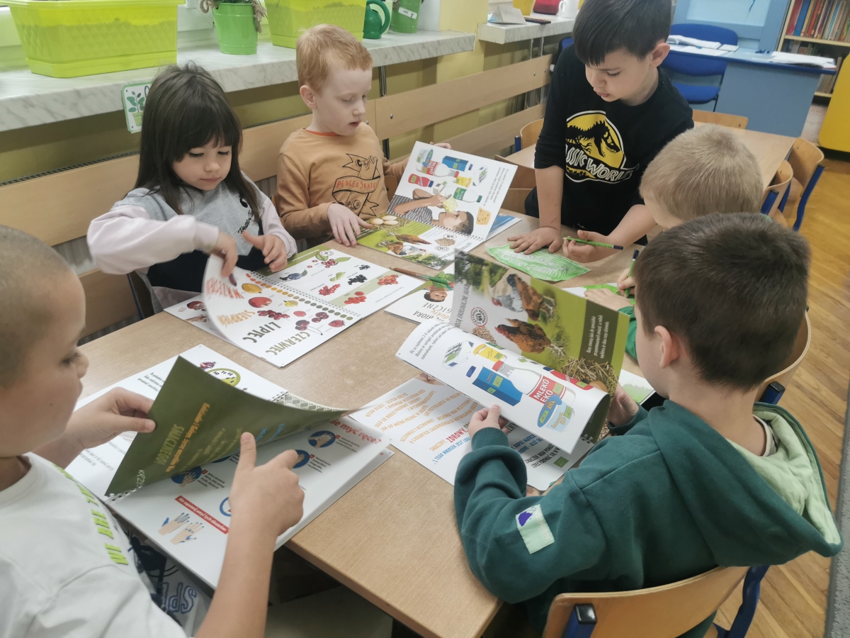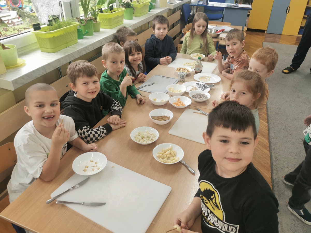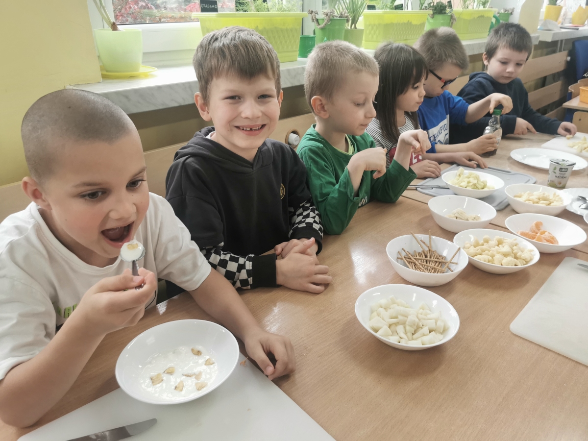 Grupa VI i w tym roku realizowała ekologiczno – zdrowotny program edukacyjny pt.: „Skąd się biorą produkty ekologiczne”. Celem programu jest zwiększanie świadomości i wiedzy na temat rolnictwa ekologicznego oraz budowanie właściwych nawyków żywieniowych od najmłodszych lat. Zajęcia Słoneczka zaczęły od oglądnięcia filmu animowanego „Skąd się biorą produkty ekologiczne”. Następnie założyliśmy w sali kącik zdrowej żywności, do którego każdy mógł przynieść z domu ekologiczny produkt z zielonym listkiem. Następnie degustowaliśmy nasze zdrowe produkty i wszyscy jednogłośnie stwierdzili, że ekologiczne = smaczne. Klasyfikowaliśmy produkty ze względu na zdrowe i nie służące naszemu zdrowiu, by kolejno ułożyć piramidę zdrowego żywienia, utrwalając w ten sposób zasady zdrowego i racjonalnego odżywiania. Na koniec cyklu naszych zajęć wykonaliśmy zdrowe kanapki, wykorzystując szczypiorek i cebulkę z własnej hodowli. Teraz już wiemy, skąd się biorą produkty ekologiczne, dlaczego warto je wybierać i jakie są zalecenia by zdrowo żyć.