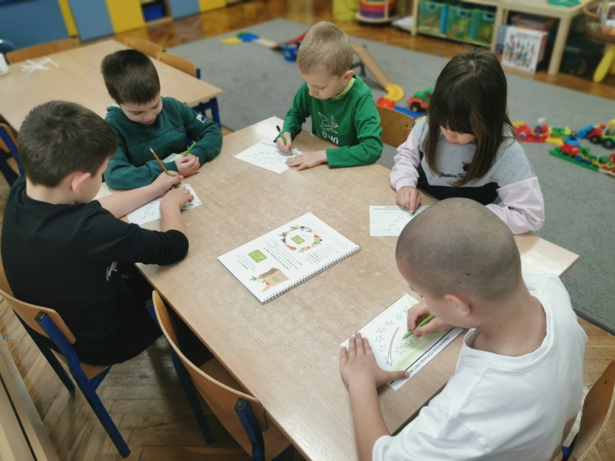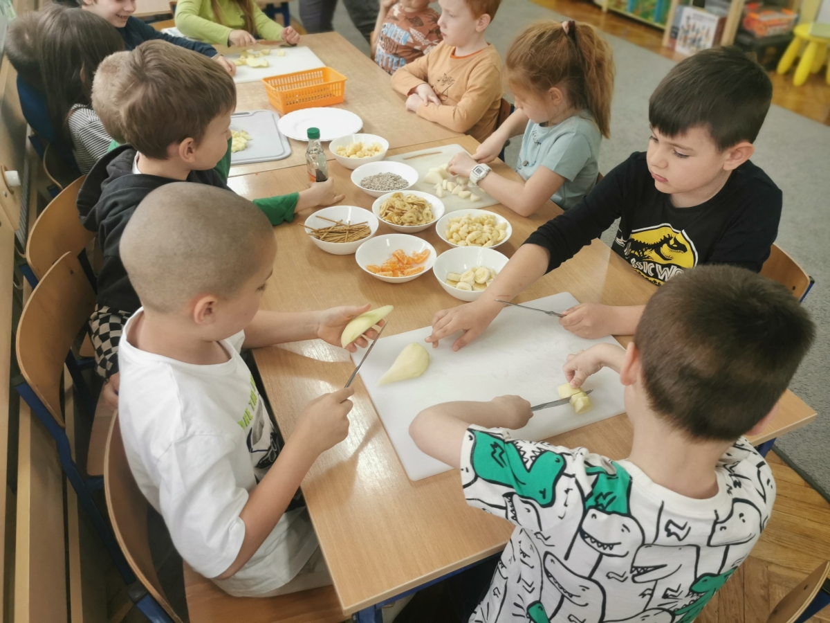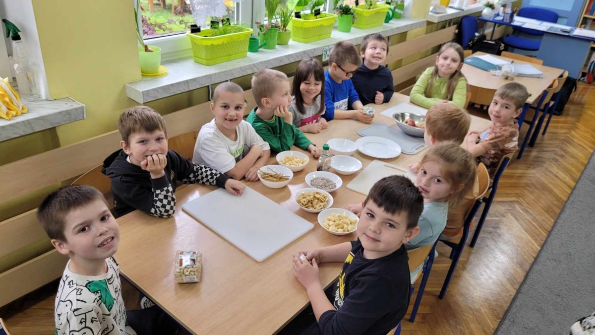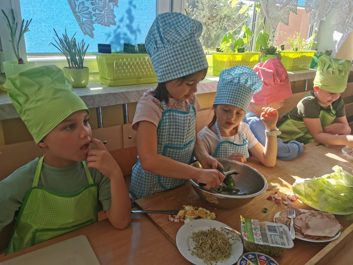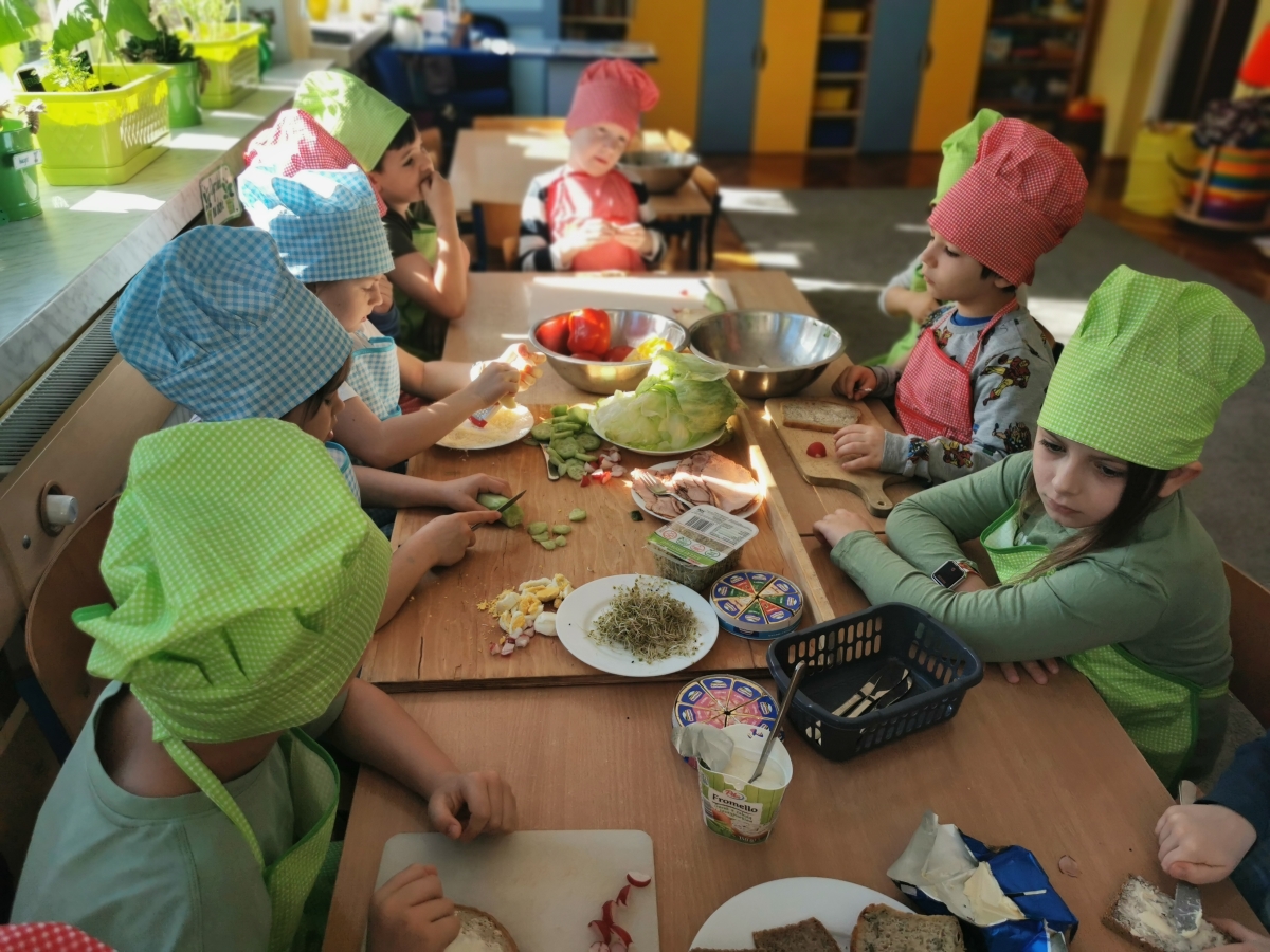Grupa VI i w tym roku realizowała ekologiczno – zdrowotny program edukacyjny pt.: „Skąd się biorą produkty ekologiczne”. Celem programu jest zwiększanie świadomości i wiedzy na temat rolnictwa ekologicznego oraz budowanie właściwych nawyków żywieniowych od najmłodszych lat. Zajęcia Słoneczka zaczęły od oglądnięcia filmu animowanego „Skąd się biorą produkty ekologiczne”. Następnie założyliśmy w sali kącik zdrowej żywności, do którego każdy mógł przynieść z domu ekologiczny produkt z zielonym listkiem. Następnie degustowaliśmy nasze zdrowe produkty i wszyscy jednogłośnie stwierdzili, że ekologiczne = smaczne. Klasyfikowaliśmy produkty ze względu na zdrowe i nie służące naszemu zdrowiu, by kolejno ułożyć piramidę zdrowego żywienia, utrwalając w ten sposób zasady zdrowego i racjonalnego odżywiania. Na koniec cyklu naszych zajęć wykonaliśmy zdrowe kanapki, wykorzystując szczypiorek i cebulkę z własnej hodowli. Teraz już wiemy, skąd się biorą produkty ekologiczne, dlaczego warto je wybierać i jakie są zalecenia by zdrowo żyć.