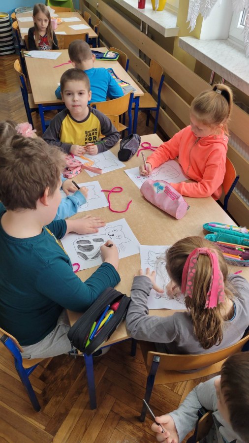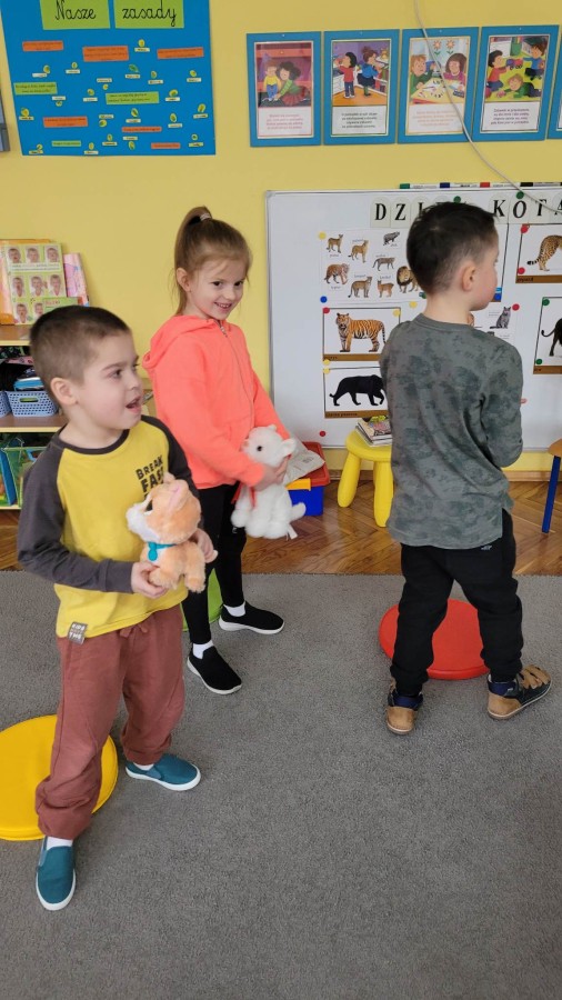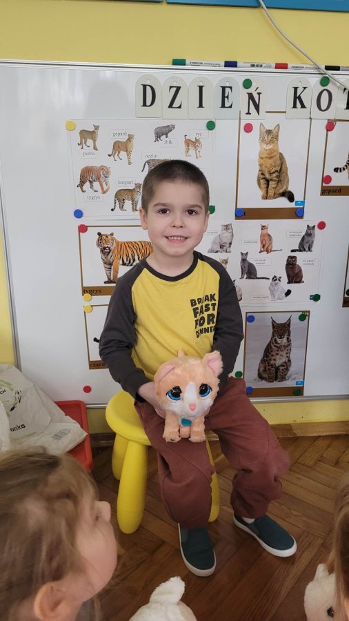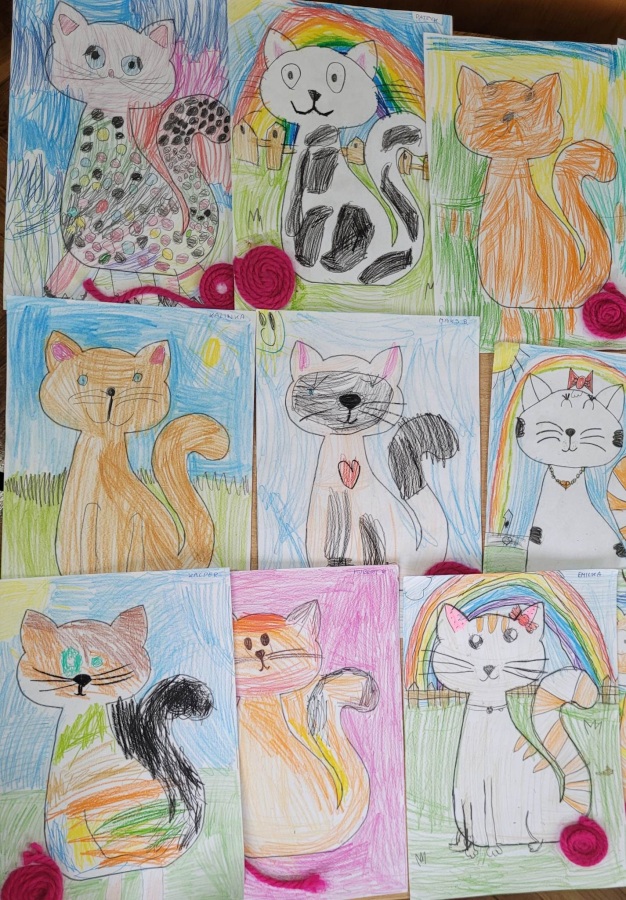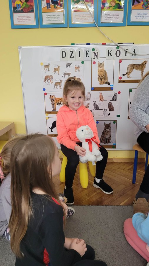 Dzień Kota Słoneczka zaczęły od przyniesienia z domu kocich maskotek, figurek, książek związanych z kotami, aby lepiej poznać zwyczaje tych wyjątkowych zwierząt. Były wesołe „kocie zabawy”, rozwiązywanie zagadek o kotach, zabawy z włóczką, wykonywanie kociego portretu, a także śpiewanie kocich piosenek. Celem przeprowadzonych zajęć było rozwijanie empatii; uwrażliwianie na potrzeby zwierząt oraz przekazanie informacji na temat prawidłowej opieki nad zwierzętami.
