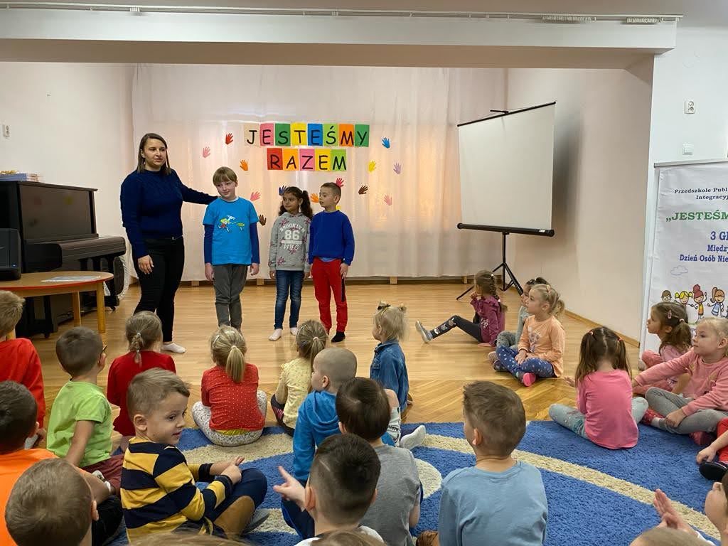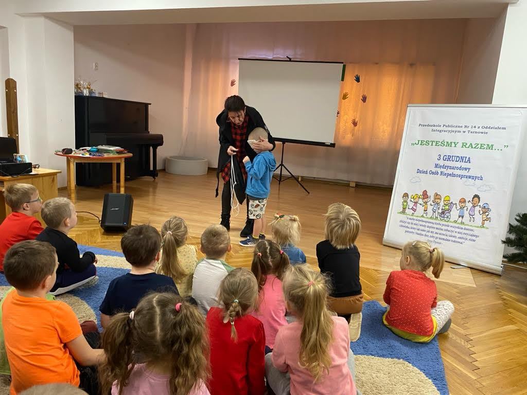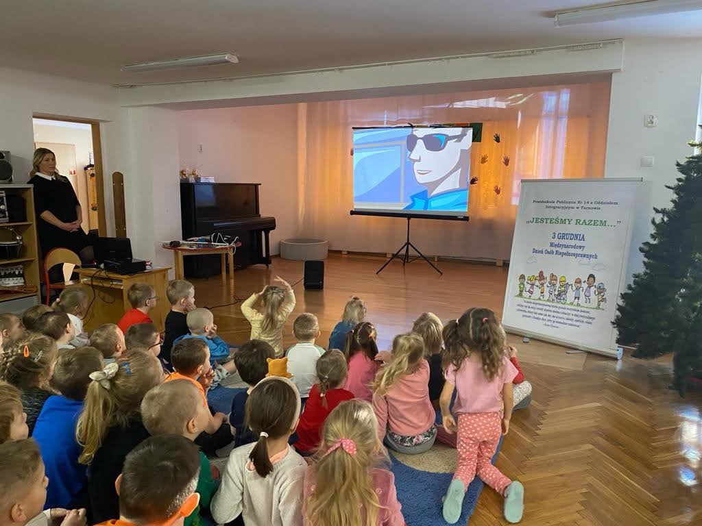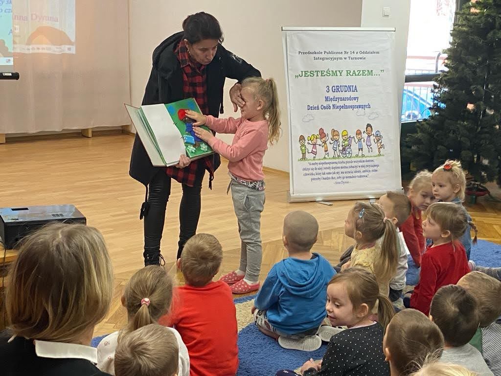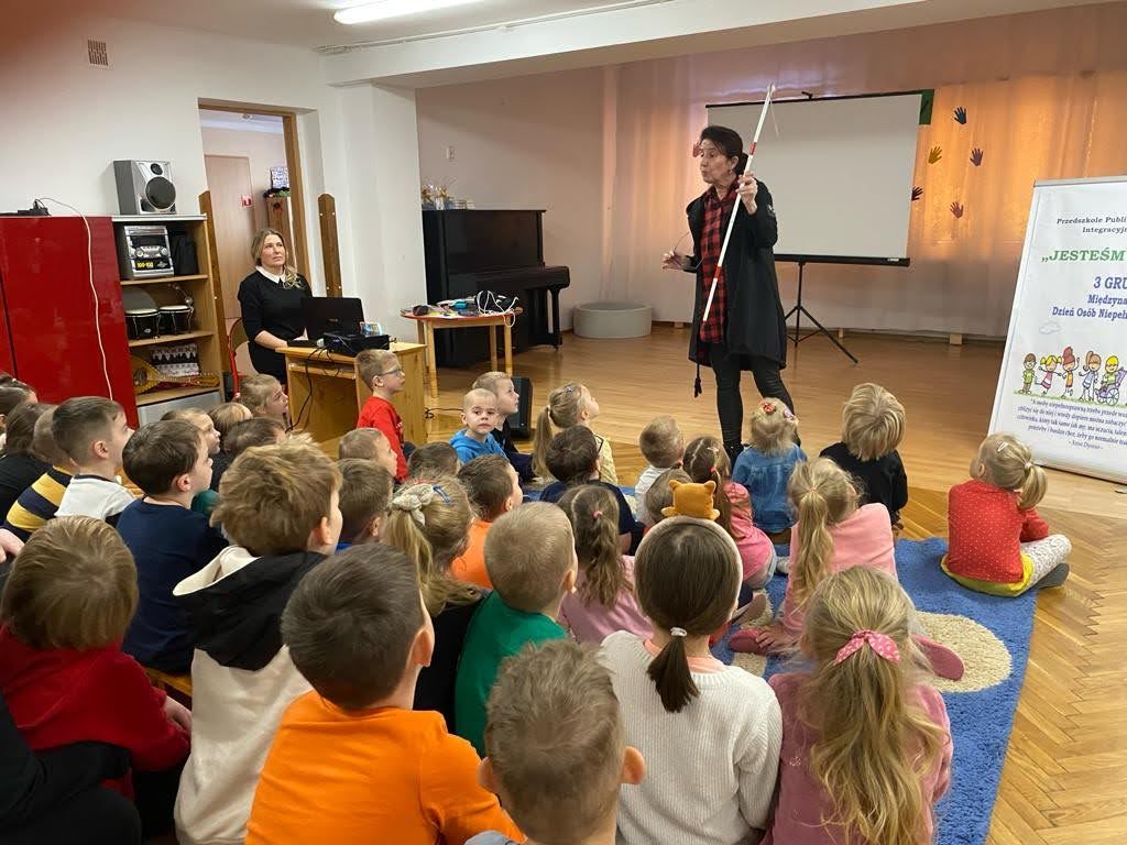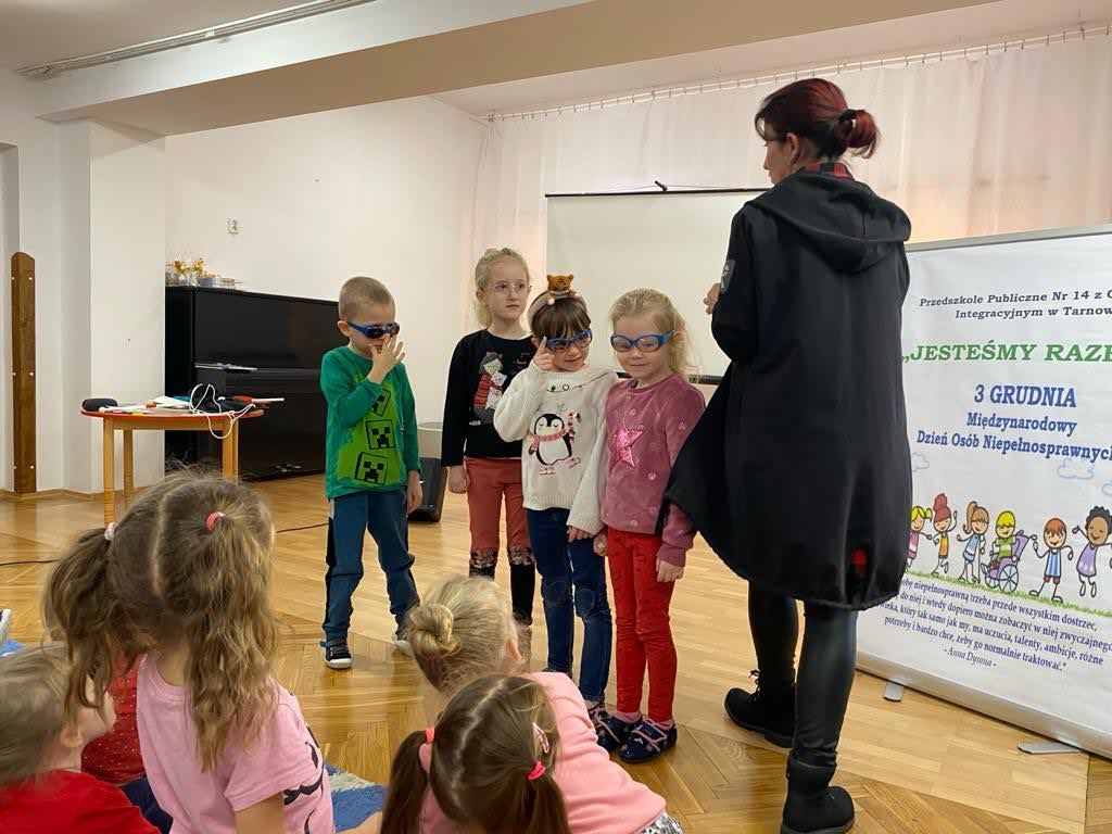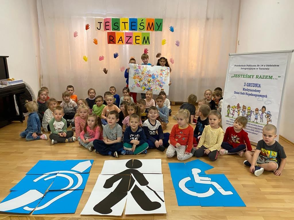 Dziś był szczególny dzień… Grupa III, IV i VI integracyjna obchodziła Międzynarodowy Dzień Osób Niepełnosprawnych . Hasłem przewodnim spotkania było hasło „Jesteśmy razem” !!! Zaproszenie do przedszkola przyjęła pani Jolanta Albin Albin, która wprowadziła nas w świat osób niewidomych i słabo widzących. Pani Jola przybliżyła dzieciom problemy z jakimi borykają się osoby niewidome, zademonstrowała sposób poruszania się z białą laską, opowiedziała o roli psa przewodnika. Dzieci miały okazję „wczuć się” w rolę osób niewidomych, zapoznały się z alfabetem Brailla oraz przyrządami ułatwiającymi funkcjonowanie osób niewidomych. Kolejnymi ważnymi gośćmi w dniu dzisiejszym były dzieci ze Szkoły dla Głuchych i Słabo Widzących z Tarnowa wraz z wychowawcą Bernadettą Olszówka . Z tej części spotkania nauczyliśmy się podstawowych zwrotów w języku migowym oraz alfabet języka migowego. Dziękujemy wszystkim za udział w tym ważnym dniu !!!