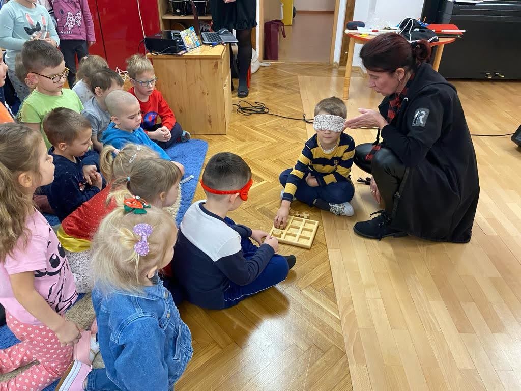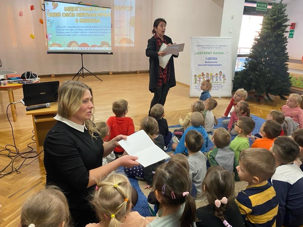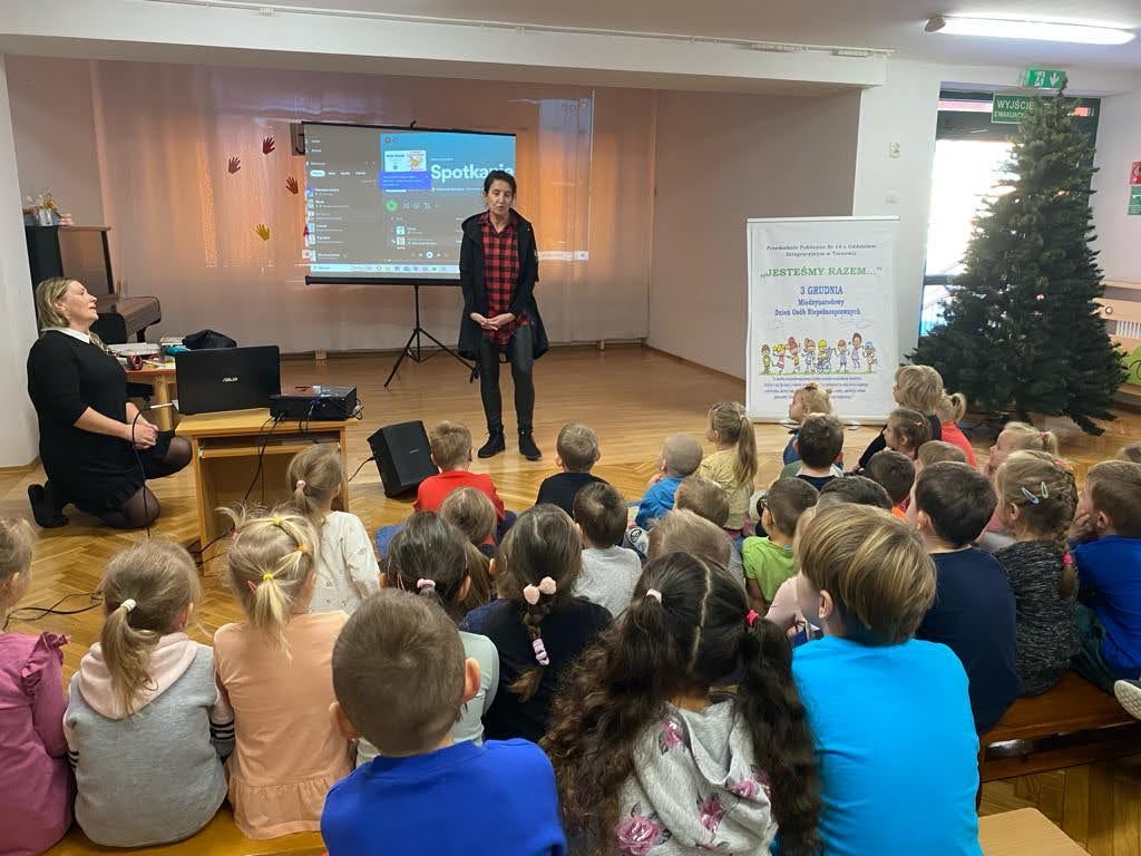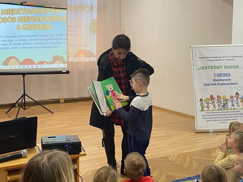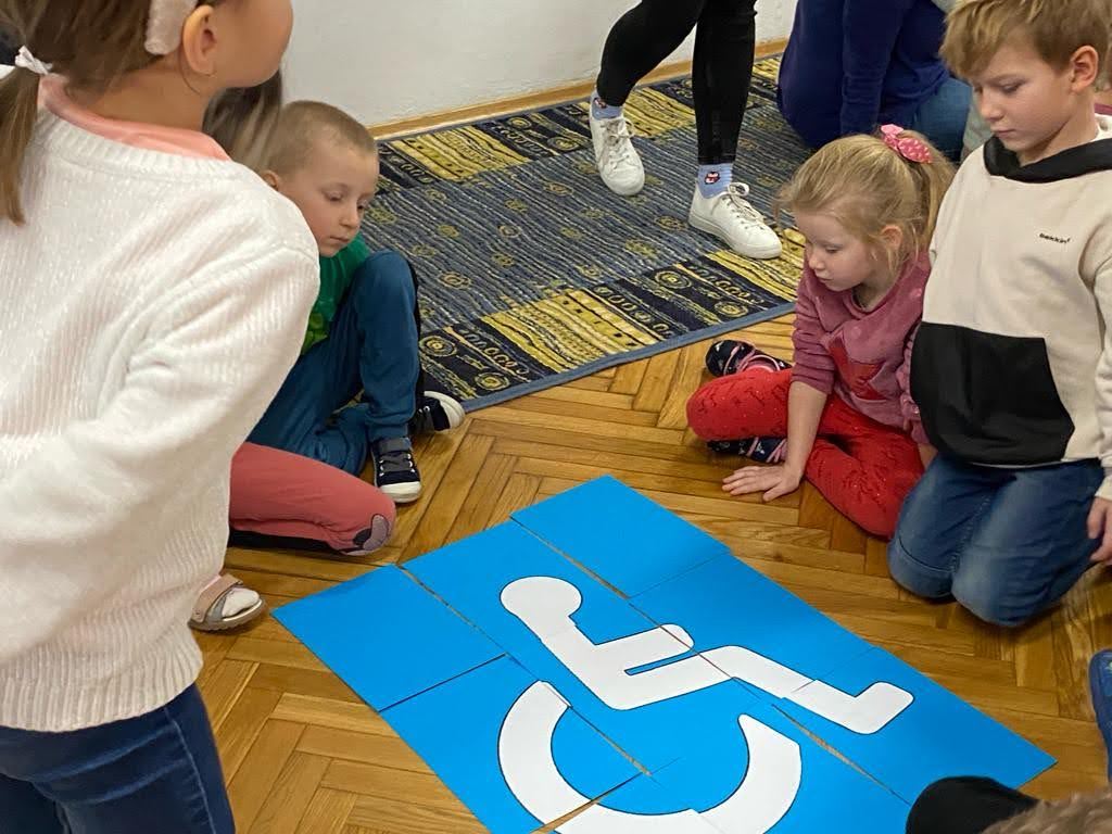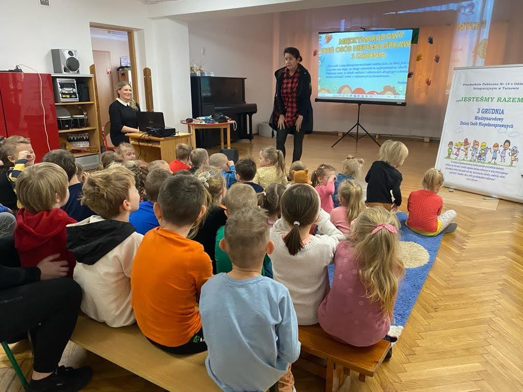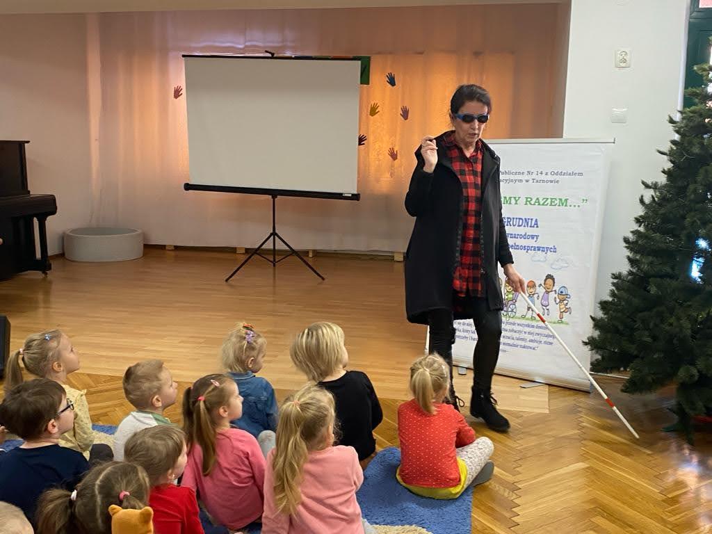 Dziś był szczególny dzień… Grupa III, IV i VI integracyjna obchodziła Międzynarodowy Dzień Osób Niepełnosprawnych . Hasłem przewodnim spotkania było hasło „Jesteśmy razem” !!! Zaproszenie do przedszkola przyjęła pani Jolanta Albin Albin, która wprowadziła nas w świat osób niewidomych i słabo widzących. Pani Jola przybliżyła dzieciom problemy z jakimi borykają się osoby niewidome, zademonstrowała sposób poruszania się z białą laską, opowiedziała o roli psa przewodnika. Dzieci miały okazję „wczuć się” w rolę osób niewidomych, zapoznały się z alfabetem Brailla oraz przyrządami ułatwiającymi funkcjonowanie osób niewidomych. Kolejnymi ważnymi gośćmi w dniu dzisiejszym były dzieci ze Szkoły dla Głuchych i Słabo Widzących z Tarnowa wraz z wychowawcą Bernadettą Olszówka . Z tej części spotkania nauczyliśmy się podstawowych zwrotów w języku migowym oraz alfabet języka migowego. Dziękujemy wszystkim za udział w tym ważnym dniu !!!