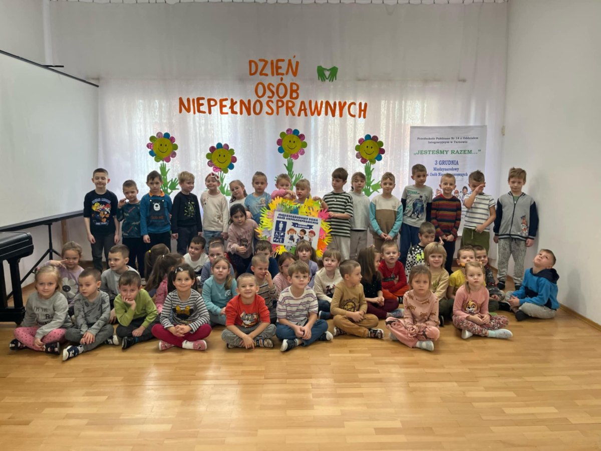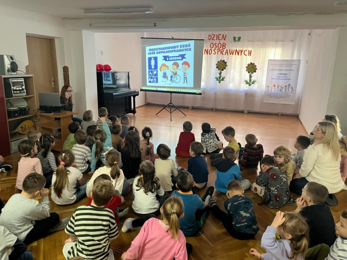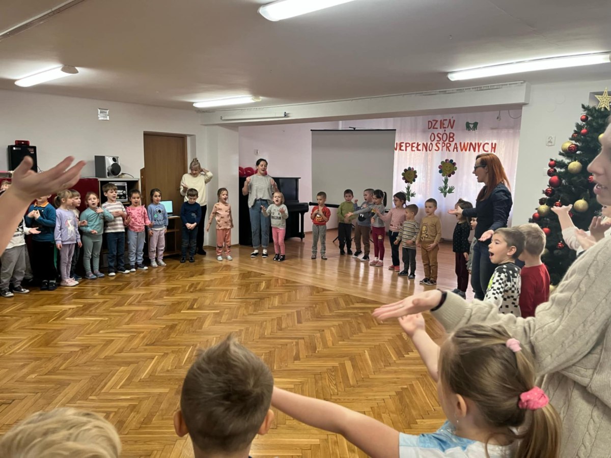 W dniu 3 grudnia, obchodziliśmy Międzynarodowy Dzień Osób Niepełnosprawnych. Dzieci z grupy IV, V i VI wzięły udział w obchodach tego dnia. Dzieci zostały zapoznane z krótkometrażowym filmem edukacyjnym o osobach z niepełnosprawnościami, poznały oraz układały puzzle przedstawiające znaki informacyjne dotyczących różnych niepełnosprawności, oraz dowiedziały się w jakich miejscach mogą się z nimi spotkać. Najmłodsi z ogromnym zaangażowaniem wypowiadali się w jaki sposób mogą pomagać i wspierać osoby niepełnosprawne. Każde z dzieci odrysowało i wycięło swoją dłoń, jako symbol pomocnych dłoni i umieściło na plakacie „Międzynarodowy Dzień Osób Niepełnosprawnych”. Na koniec wszyscy zaśpiewali i zatańczyli do piosenki „ Kto jeśli nie ty, kto jeśli nie my, kto jeśli nie ja, pomagać innym ma…”.