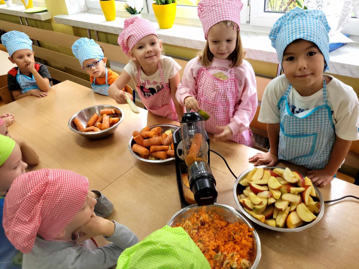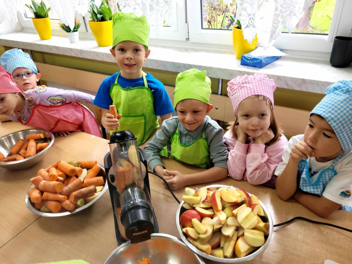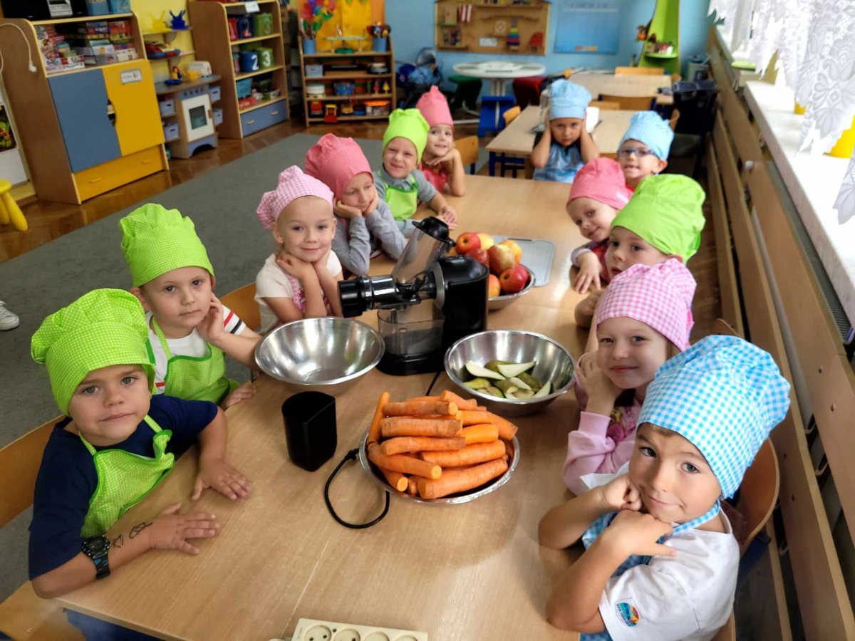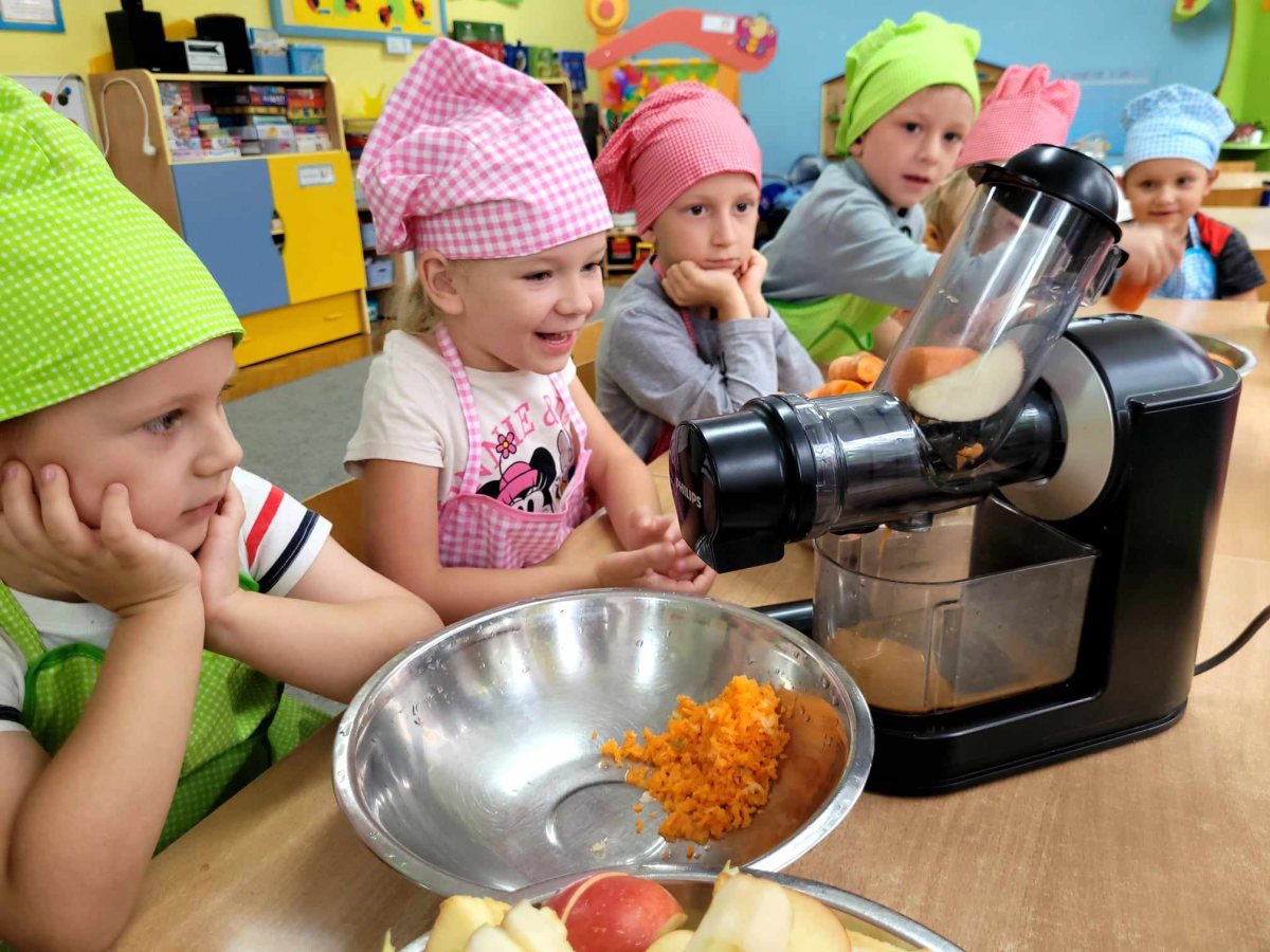 Kto zdrowe soki pije, ten długo żyje! Biedronki rozumieją potrzebę spożywania dużych ilości owoców oraz warzyw. Z myślą o witaminkach, postanowiliśmy zrobić sok. Dzieci ochoczo przyniosły do przedszkola marchewki i jabłka. Jednak zanim przystąpiliśmy do pracy, dzieci zapoznały się z urządzeniem do robienia soku – sokowirówką, jego działaniem i utrwalały sobie zasady bezpieczeństwa. Pozostało tylko wrzucenie składników do maszyny i sok gotowy! Wszystkim bardzo smakował, ponieważ wykonany był przez dzieci, bez dodatku cukru i bez konserwantów.