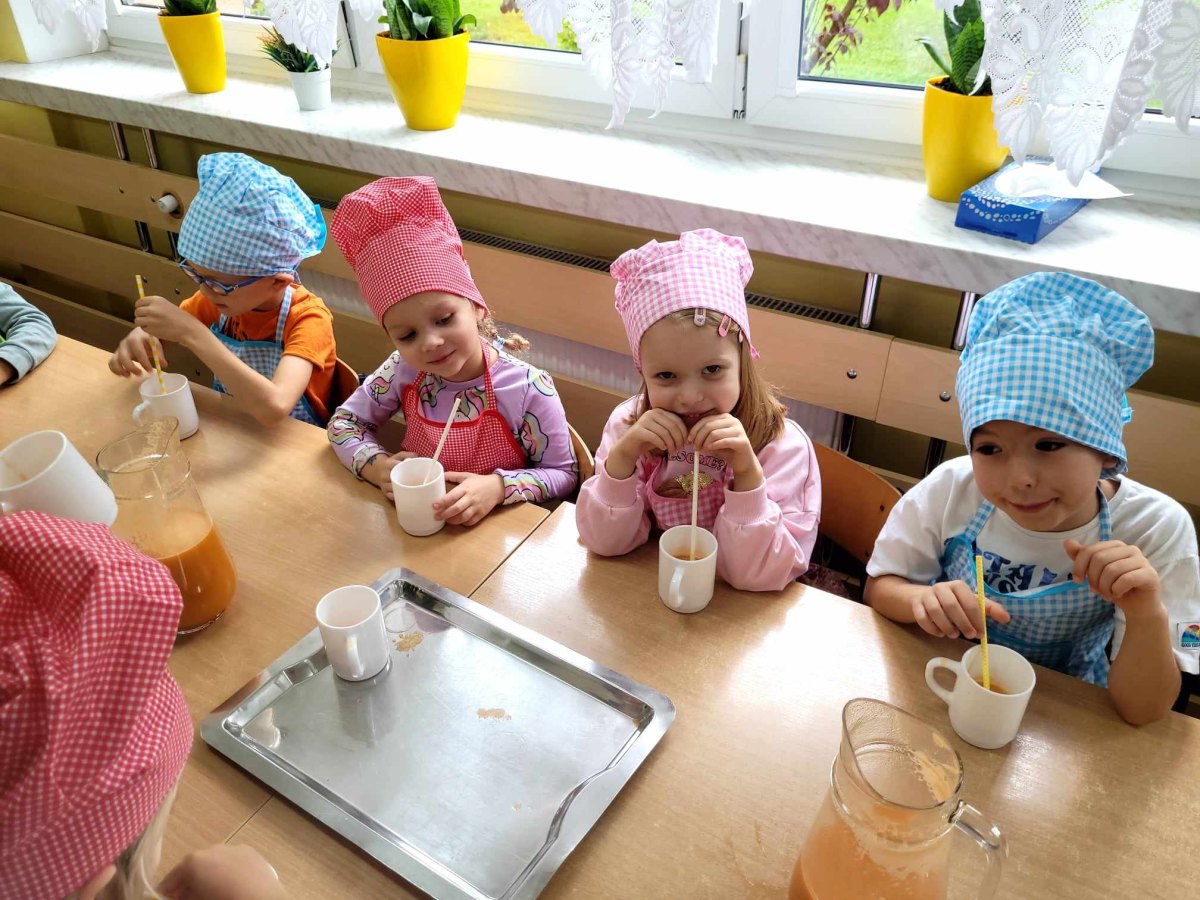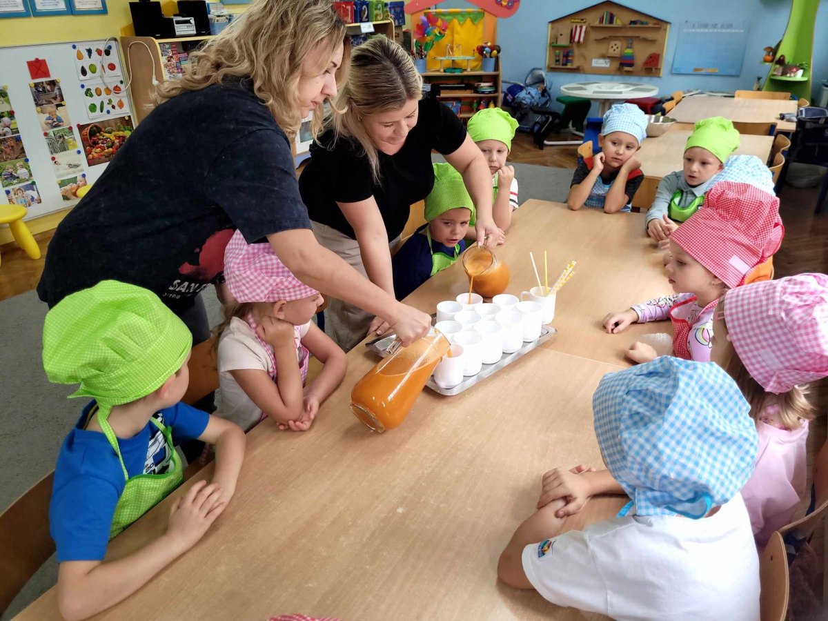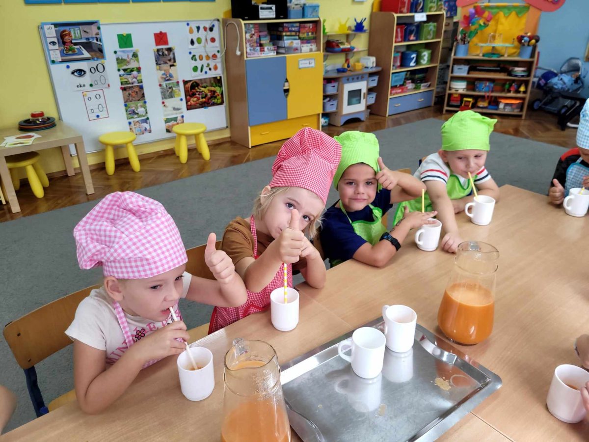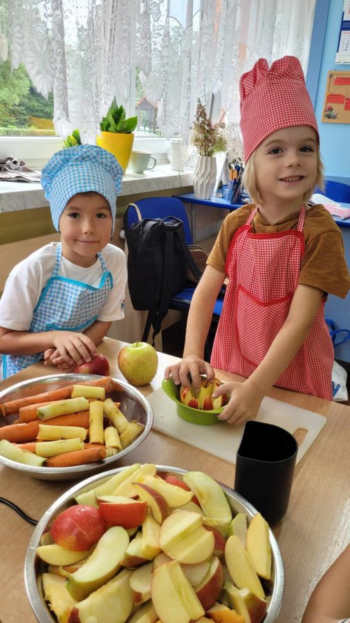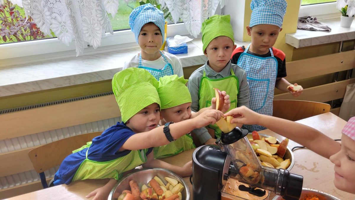 Kto zdrowe soki pije, ten długo żyje! Biedronki rozumieją potrzebę spożywania dużych ilości owoców oraz warzyw. Z myślą o witaminkach, postanowiliśmy zrobić sok. Dzieci ochoczo przyniosły do przedszkola marchewki i jabłka. Jednak zanim przystąpiliśmy do pracy, dzieci zapoznały się z urządzeniem do robienia soku – sokowirówką, jego działaniem i utrwalały sobie zasady bezpieczeństwa. Pozostało tylko wrzucenie składników do maszyny i sok gotowy! Wszystkim bardzo smakował, ponieważ wykonany był przez dzieci, bez dodatku cukru i bez konserwantów.