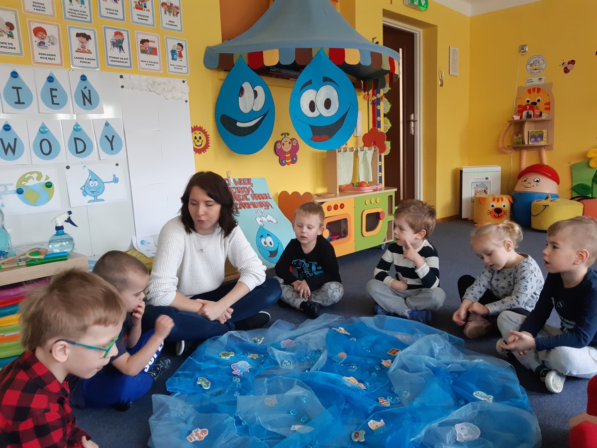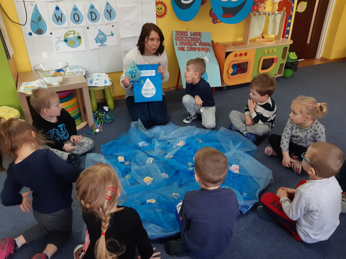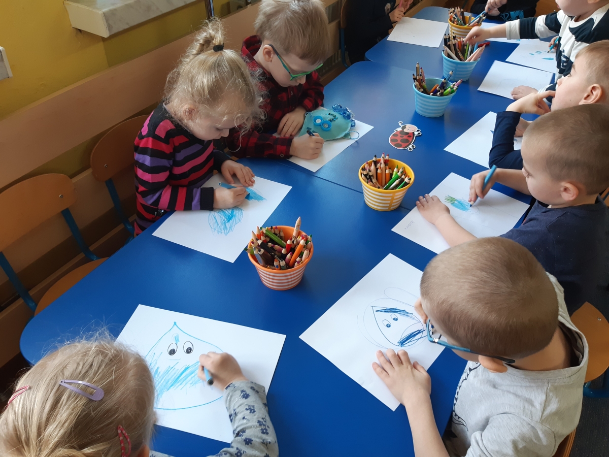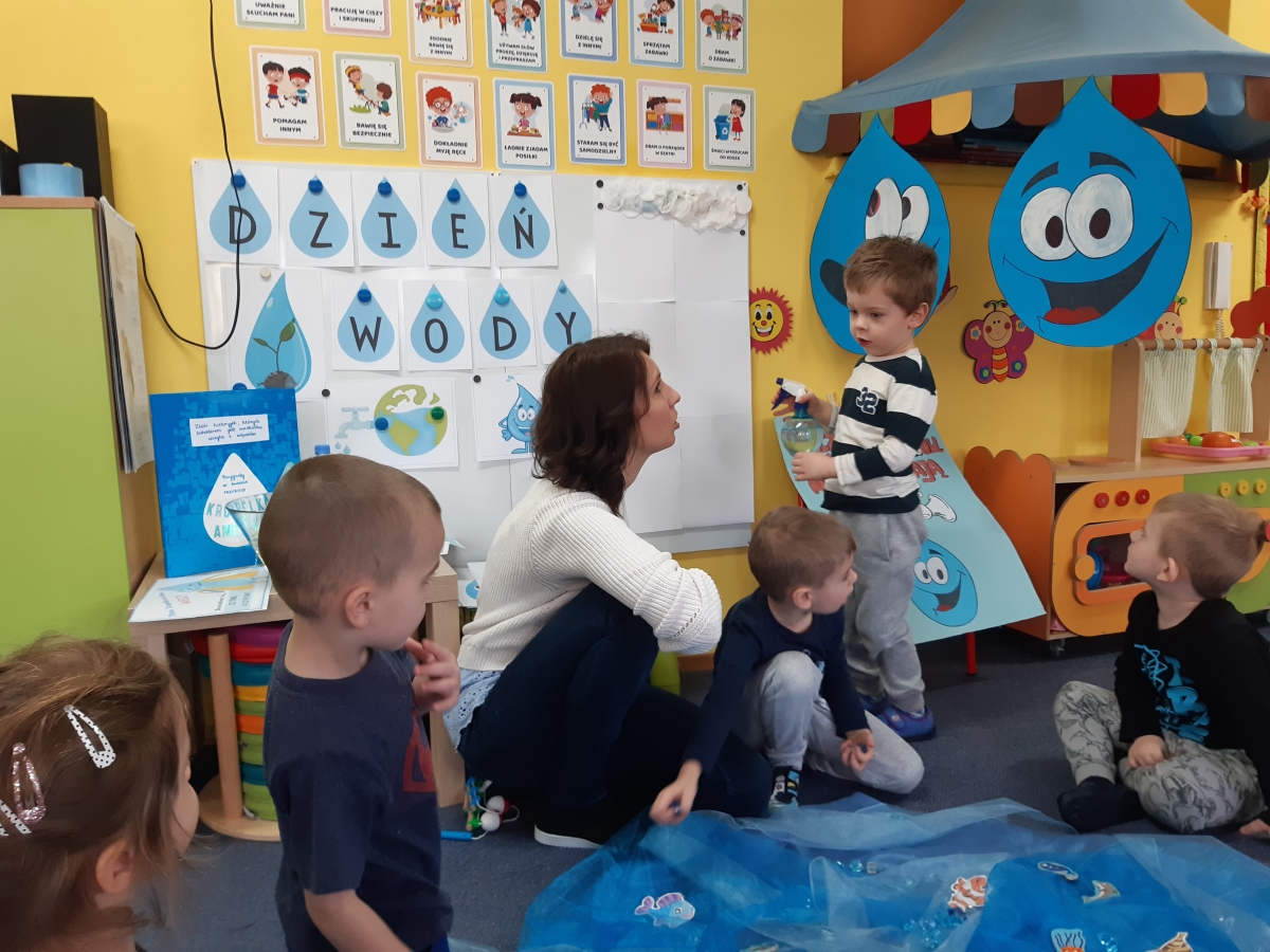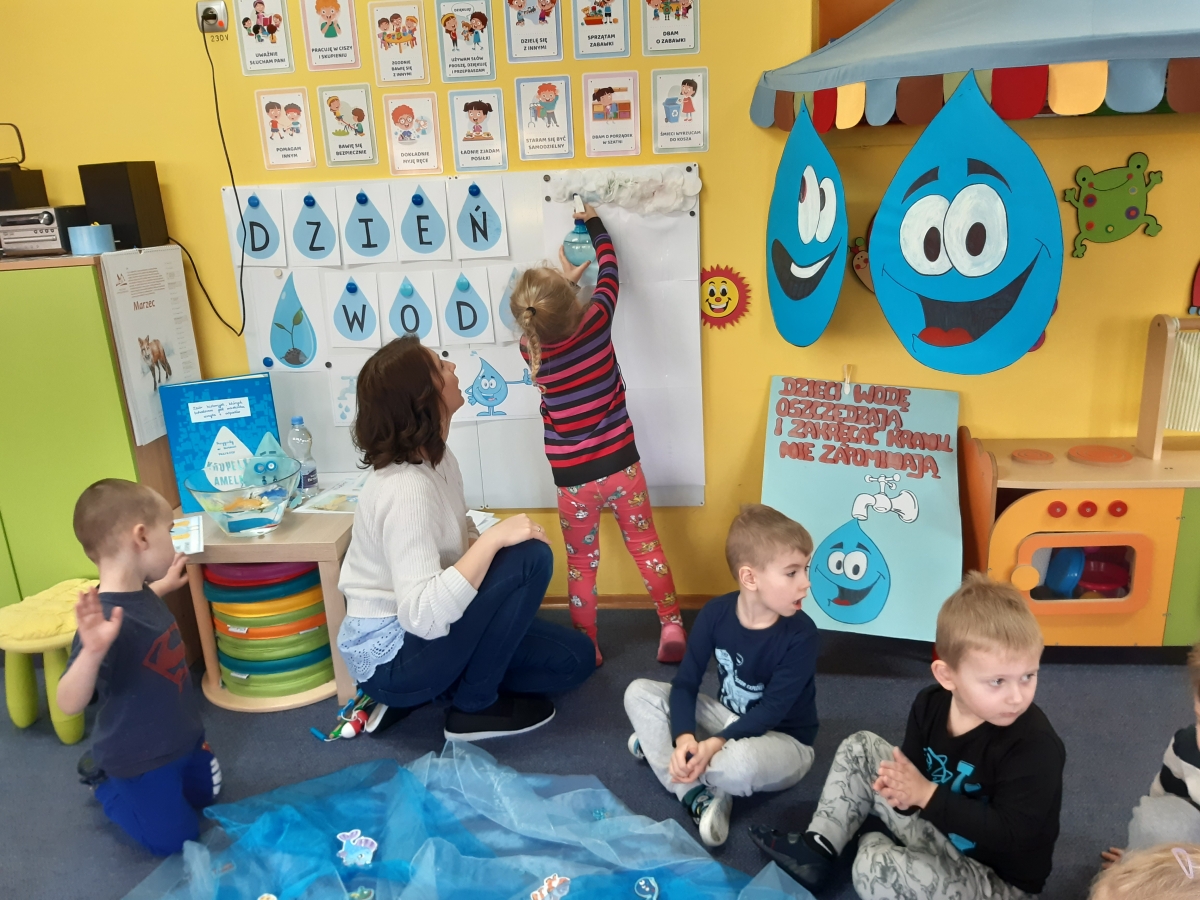 22 marca to Światowy Dzień Wody, który nietypowo i eksperymentalnie obchodziliśmy w grupie Biedronka. Celem głównym prowadzonych zajęć było poszerzenie wiedzy przyrodniczej o wodzie – jej znaczeniu dla ludzi, zwierząt i przyrody. Wspólnie zastanawialiśmy się również jak możemy oszczędzać wodę aby jej na świecie nie zabrakło. Najwięcej wrażeń dostarczyły wodne doświadczenia – „Co pływa a co tonie?”, „Kolorowy deszcz”, „Burza w szklance wody” a nawet „Wędrująca woda”. Ogromną ciekawość dzieci rozbudziło sensoryczne jeziorko, dzięki któremu mogliśmy sprawdzić swoje umiejętności zręcznościowe podczas łowienia rybek. Ten wyjątokwy dzień był także wspaniałą okazją do rozpoczęcia projektu ekologicznego – wędrującej maskotki Kropelki Amelki, której przygody będą ilustrowane przez dzieci z każdej grupy przedszkolnej. Czekamy z niecierpliwością na rezultat końcowy!