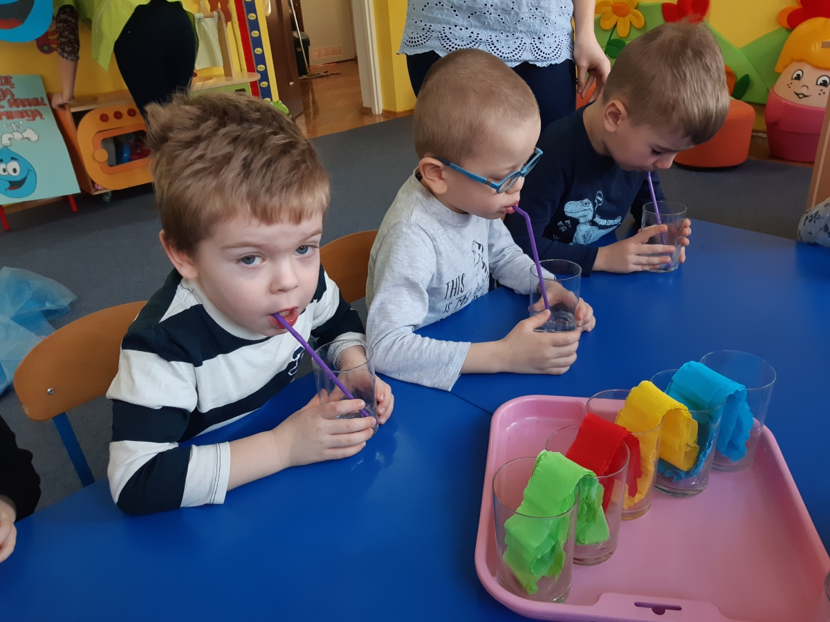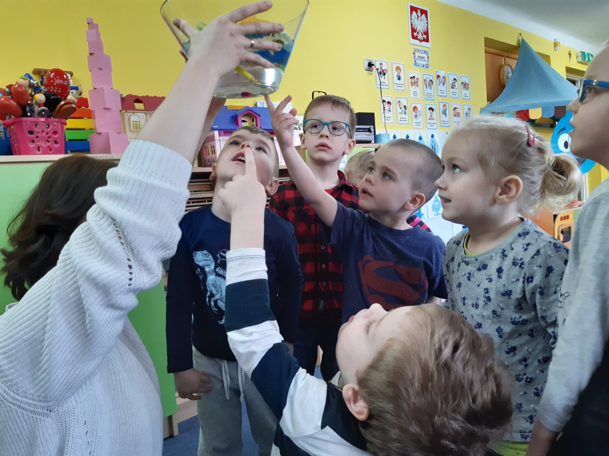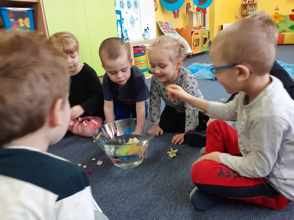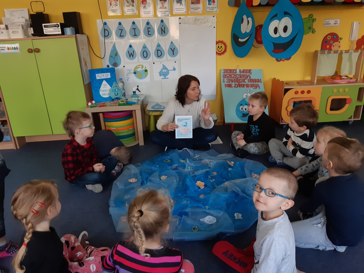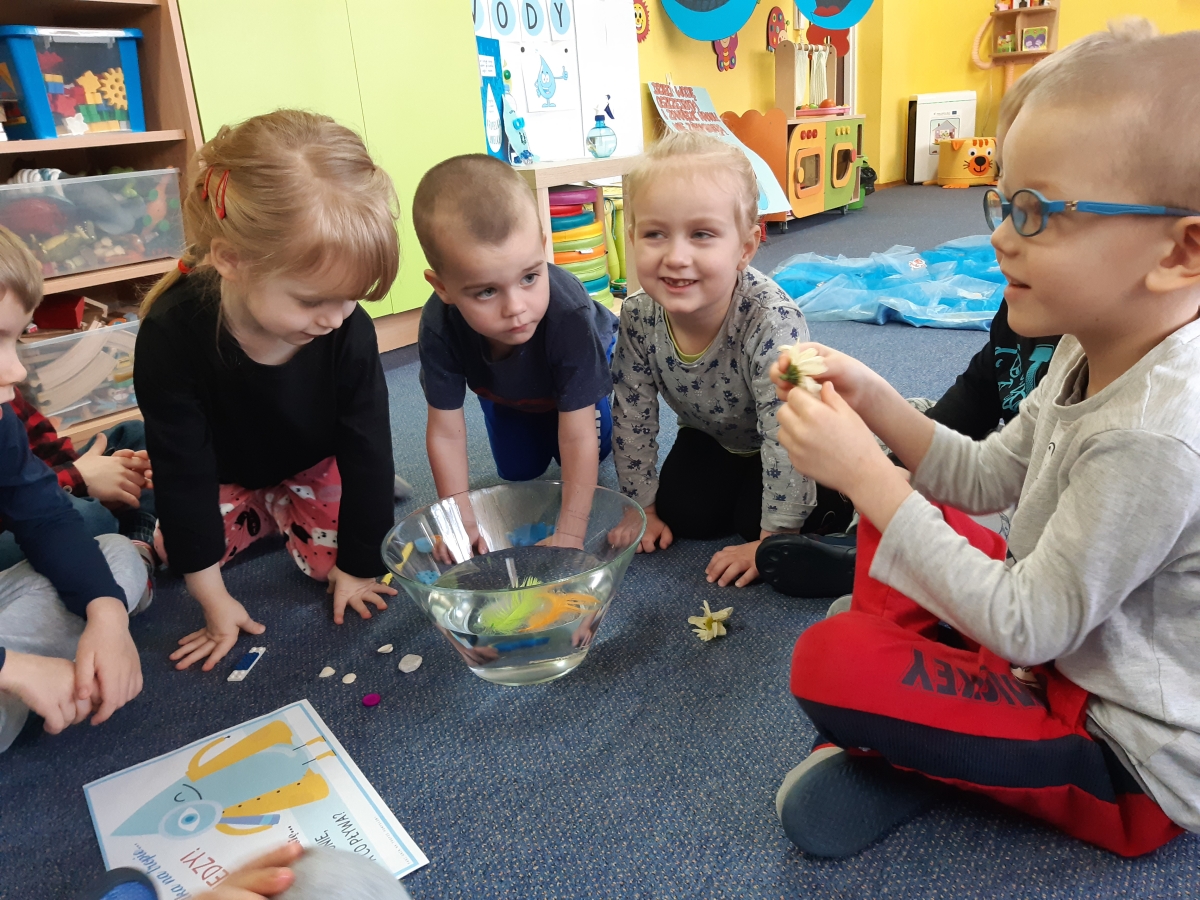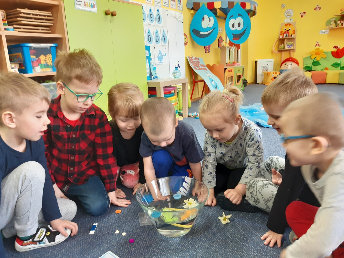 22 marca to Światowy Dzień Wody, który nietypowo i eksperymentalnie obchodziliśmy w grupie Biedronka. Celem głównym prowadzonych zajęć było poszerzenie wiedzy przyrodniczej o wodzie – jej znaczeniu dla ludzi, zwierząt i przyrody. Wspólnie zastanawialiśmy się również jak możemy oszczędzać wodę aby jej na świecie nie zabrakło. Najwięcej wrażeń dostarczyły wodne doświadczenia – „Co pływa a co tonie?”, „Kolorowy deszcz”, „Burza w szklance wody” a nawet „Wędrująca woda”. Ogromną ciekawość dzieci rozbudziło sensoryczne jeziorko, dzięki któremu mogliśmy sprawdzić swoje umiejętności zręcznościowe podczas łowienia rybek. Ten wyjątokwy dzień był także wspaniałą okazją do rozpoczęcia projektu ekologicznego – wędrującej maskotki Kropelki Amelki, której przygody będą ilustrowane przez dzieci z każdej grupy przedszkolnej. Czekamy z niecierpliwością na rezultat końcowy!