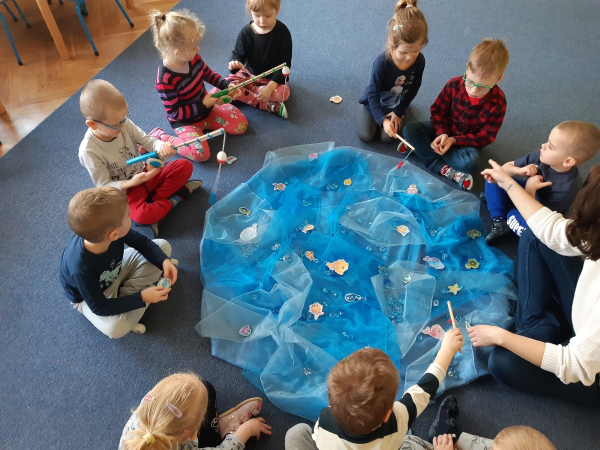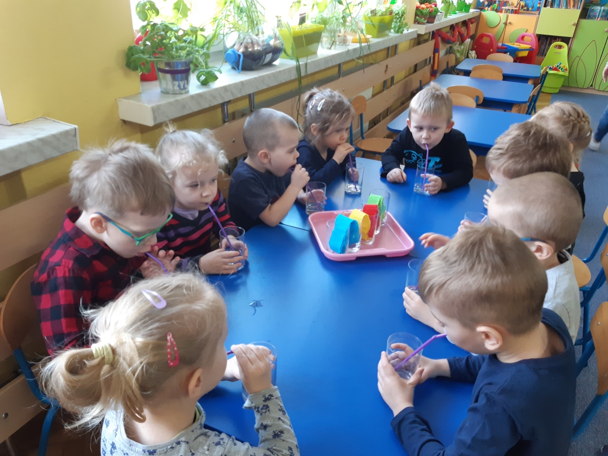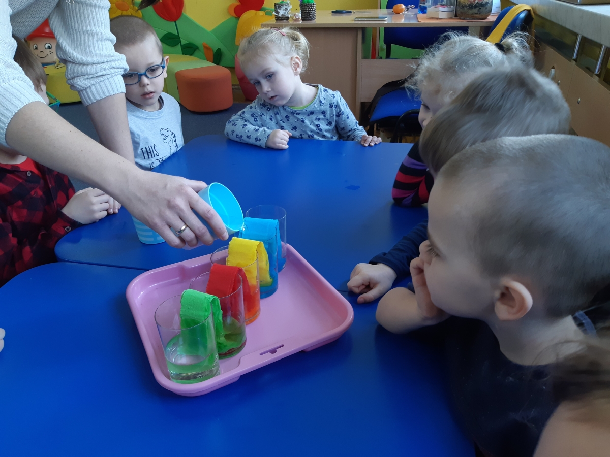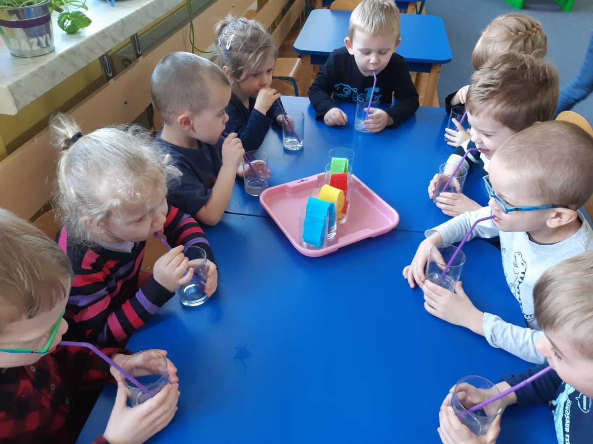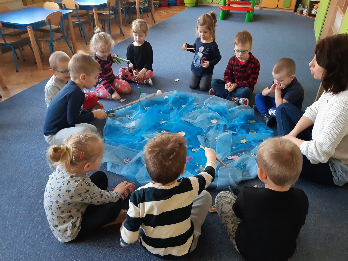 22 marca to Światowy Dzień Wody, który nietypowo i eksperymentalnie obchodziliśmy w grupie Biedronka. Celem głównym prowadzonych zajęć było poszerzenie wiedzy przyrodniczej o wodzie – jej znaczeniu dla ludzi, zwierząt i przyrody. Wspólnie zastanawialiśmy się również jak możemy oszczędzać wodę aby jej na świecie nie zabrakło. Najwięcej wrażeń dostarczyły wodne doświadczenia – „Co pływa a co tonie?”, „Kolorowy deszcz”, „Burza w szklance wody” a nawet „Wędrująca woda”. Ogromną ciekawość dzieci rozbudziło sensoryczne jeziorko, dzięki któremu mogliśmy sprawdzić swoje umiejętności zręcznościowe podczas łowienia rybek. Ten wyjątokwy dzień był także wspaniałą okazją do rozpoczęcia projektu ekologicznego – wędrującej maskotki Kropelki Amelki, której przygody będą ilustrowane przez dzieci z każdej grupy przedszkolnej. Czekamy z niecierpliwością na rezultat końcowy!