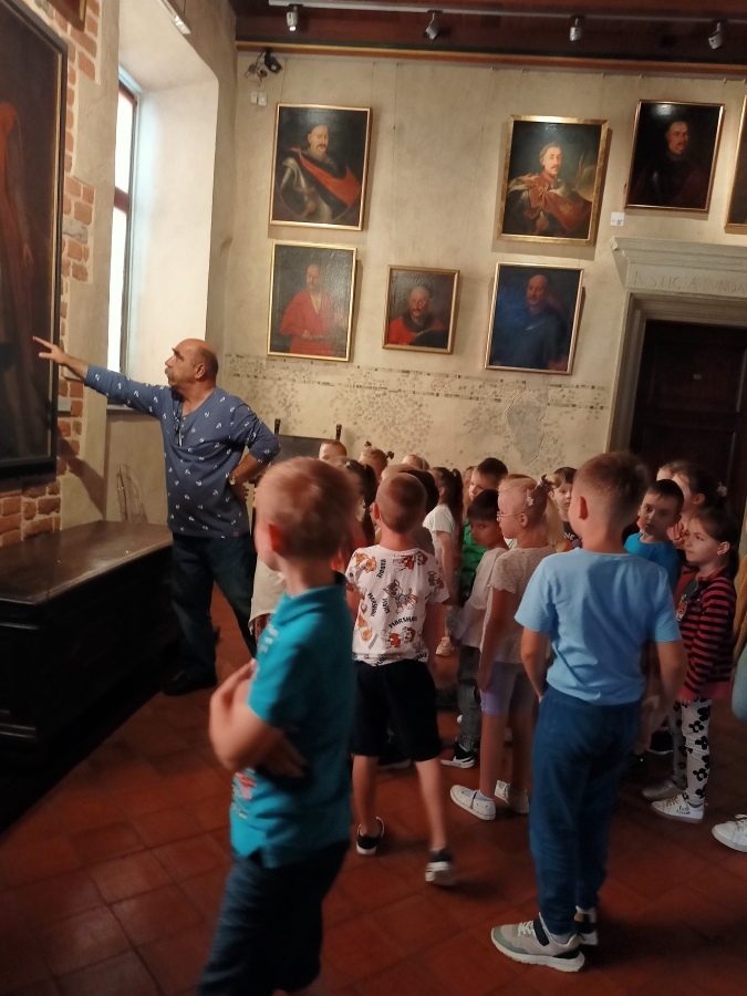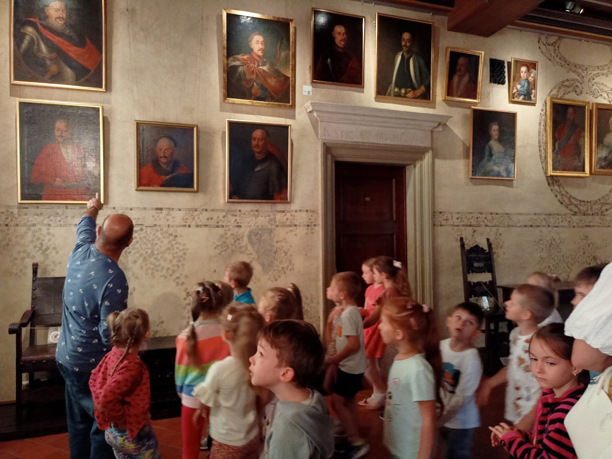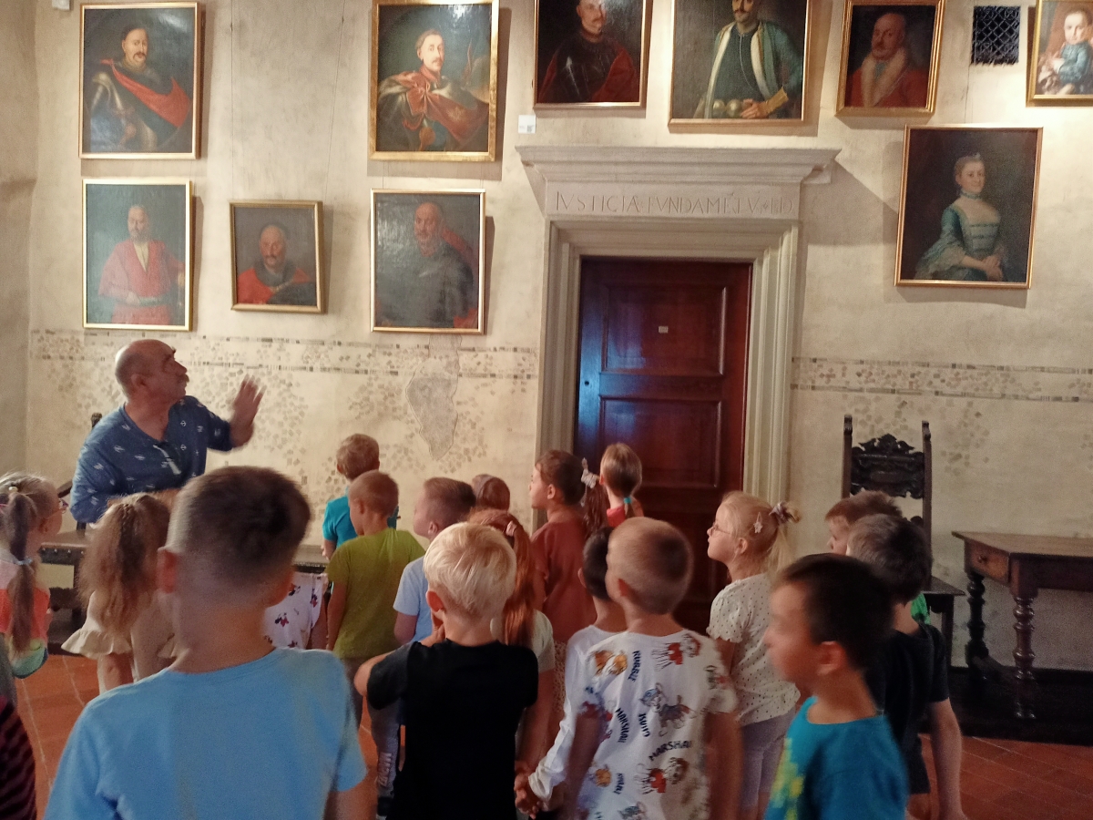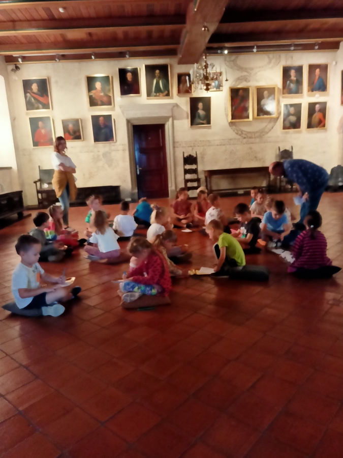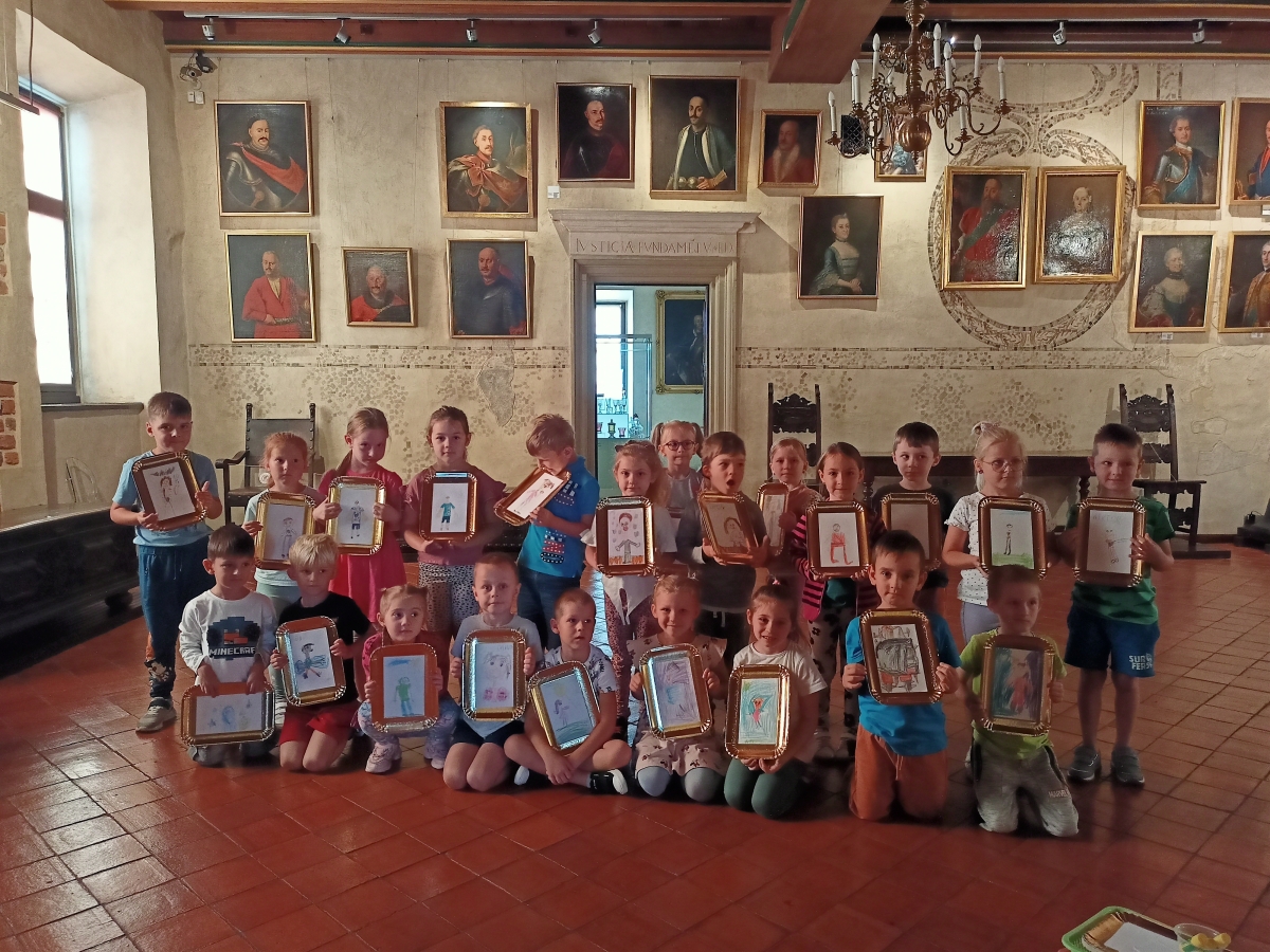 Dnia 27.09.2023 r. na sali Muzeum Okręgowego w Tarnowie, gdzie znajduje się jedna z największych kolekcji portretów sarmackich, dzieci z grupy V zobaczyły jak wyglądali i ubierali się dawni przodkowie. Zajęcia zostały podsumowane wykonaniem przestrzennego obrazka – portretu kolegi lub koleżanki z grupy, ozdobionego złotymi ramami. Były to drugie i bardzo ciekawe zajęcia muzealne z cyklu ,, Akademia pod maszkaronem “.