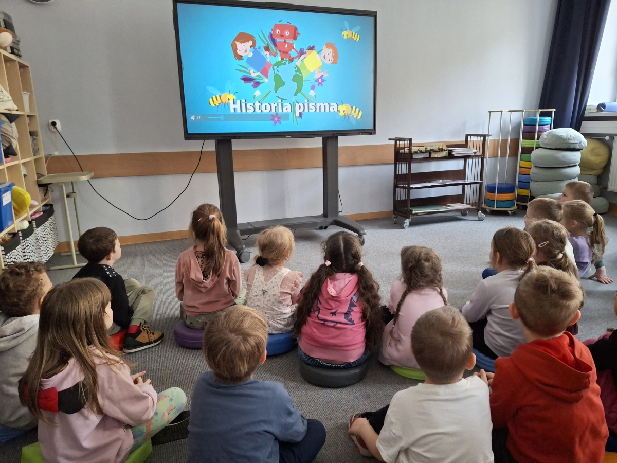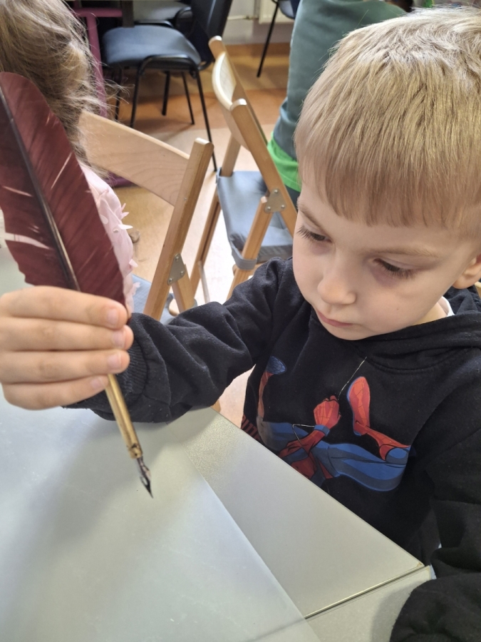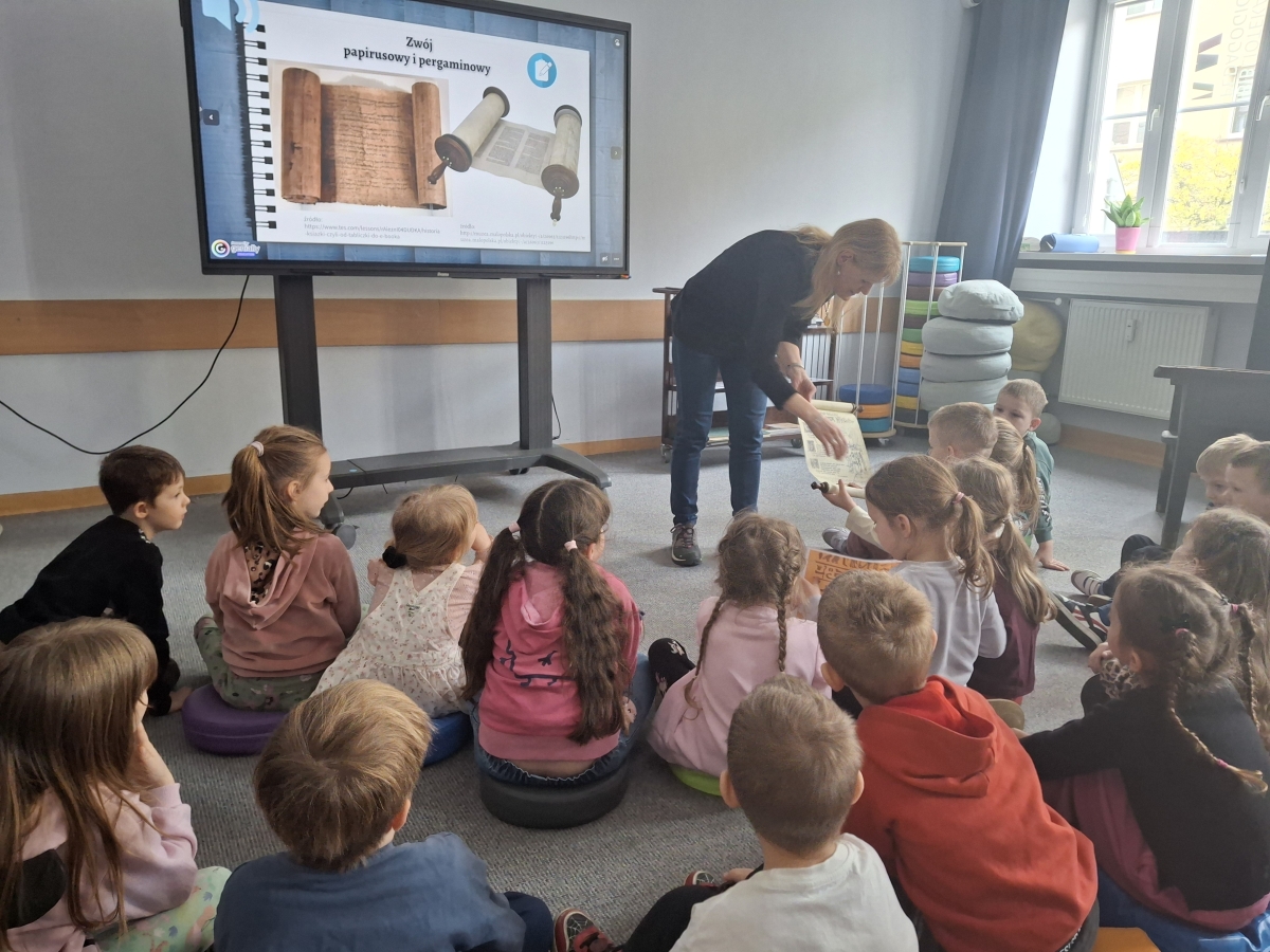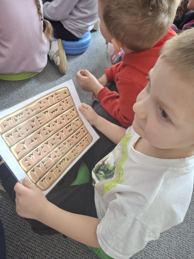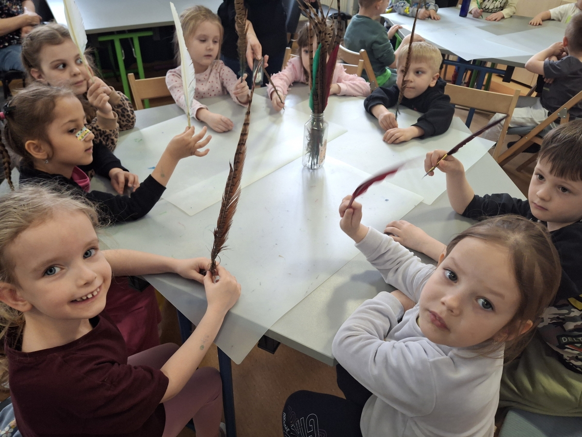 Dzieci z grupy ,,Żabki’’ wzięły udział w zajęciach edukacyjnych w Bibliotece Pedagogicznej w Tarnowie mających na celu poznanie rodzajów pisma oraz książek. Przedszkolaki wykazały bardzo duże zainteresowanie pismem piktograficznym /obrazkowym/, hieroglifami egipskimi. Nie znając liter potrafiły odczytać wiele obrazków i znaków. Pismo Braille’a i język migowy przybliżył dzieciom trudności z jakimi spotykają się ludzie niewidzący i niesłyszący. Samodzielnie mogły spróbować pisania z wykorzystaniem pisma klinowego. Poznały również różnego rodzaju narzędzia piśmiennicze zaczynając od gęsiego pióra.