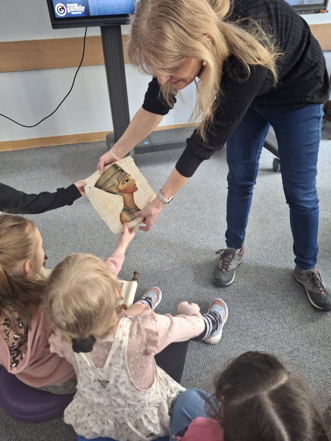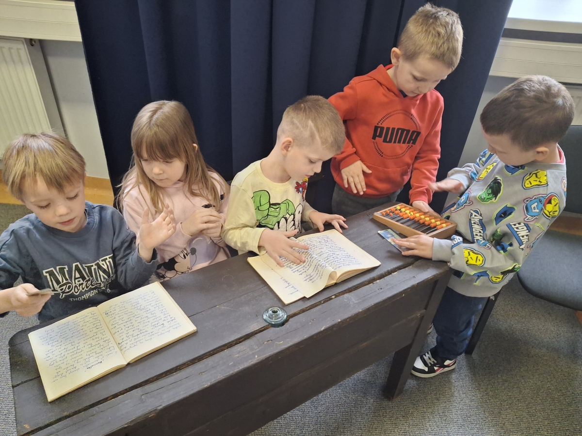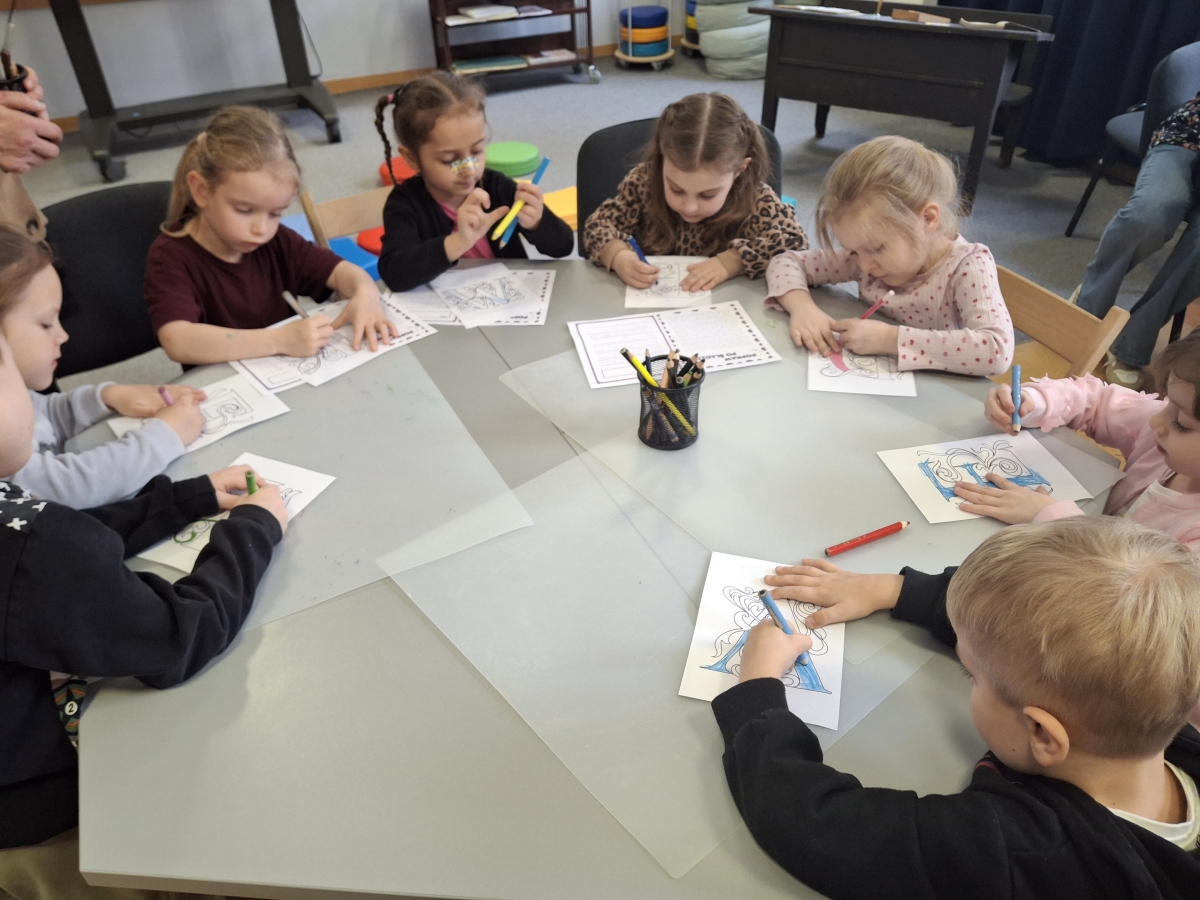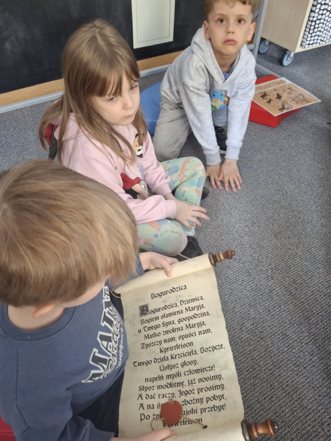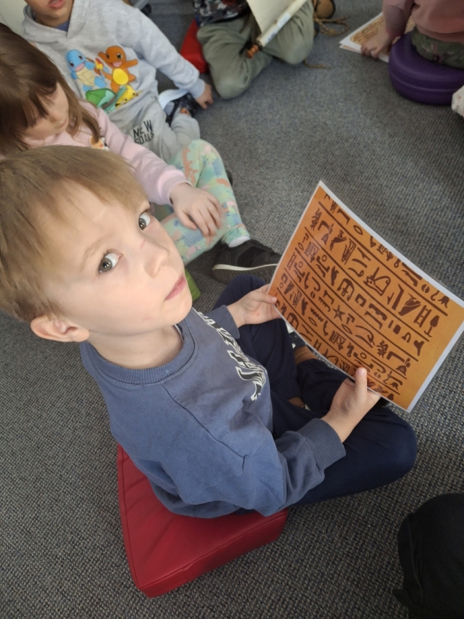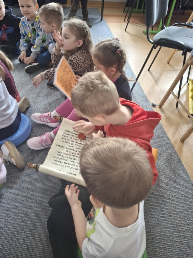 Dzieci z grupy ,,Żabki’’ wzięły udział w zajęciach edukacyjnych w Bibliotece Pedagogicznej w Tarnowie mających na celu poznanie rodzajów pisma oraz książek. Przedszkolaki wykazały bardzo duże zainteresowanie pismem piktograficznym /obrazkowym/, hieroglifami egipskimi. Nie znając liter potrafiły odczytać wiele obrazków i znaków. Pismo Braille’a i język migowy przybliżył dzieciom trudności z jakimi spotykają się ludzie niewidzący i niesłyszący. Samodzielnie mogły spróbować pisania z wykorzystaniem pisma klinowego. Poznały również różnego rodzaju narzędzia piśmiennicze zaczynając od gęsiego pióra.