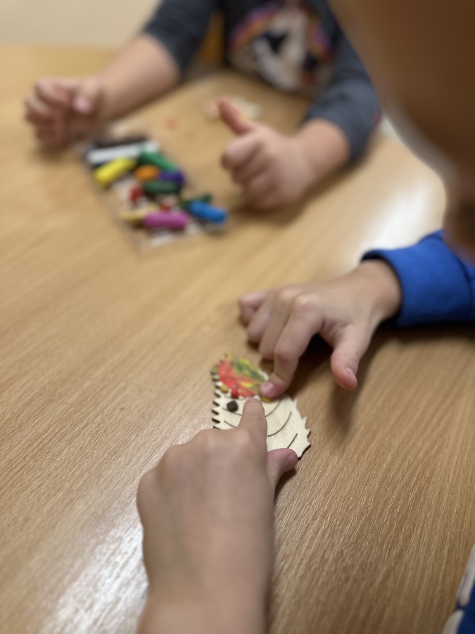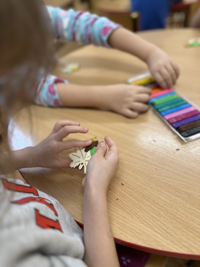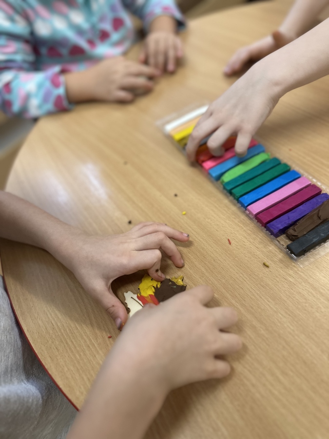 Podczas kolejnych zajęć kółka plastycznego dzieci odkrywały nowy, niezwykle ciekawy sposób tworzenia – „malowanie plasteliną”. Zamiast farb i pędzli użyły kolorowej plasteliny, którą rozmazywały palcami na sklejkach, tworząc barwne kompozycje inspirowane jesiennymi liśćmi. Dzięki tej technice dzieci rozwijały sprawność manualną, wyobraźnię oraz zmysł estetyczny. Zachęcamy do podziwiania wyjątkowego efektu dziecięcej twórczości.