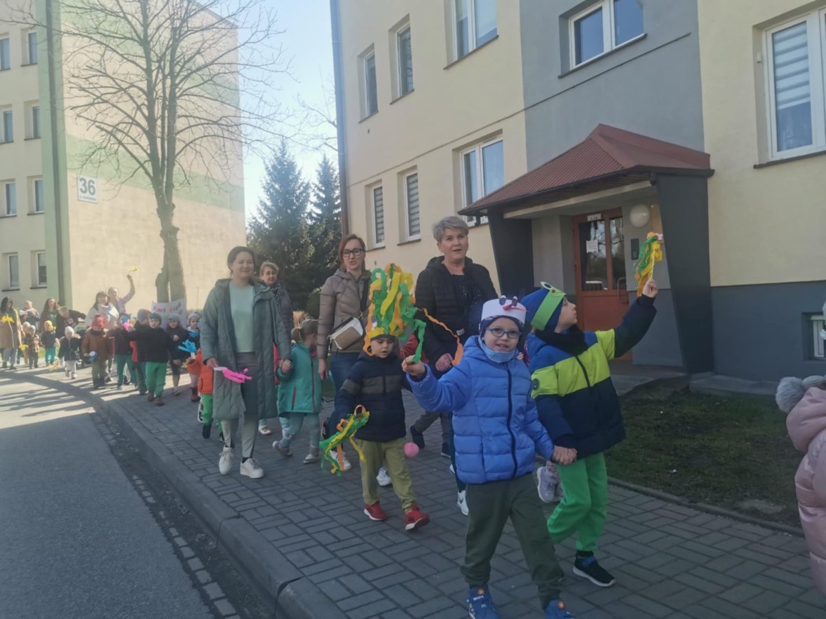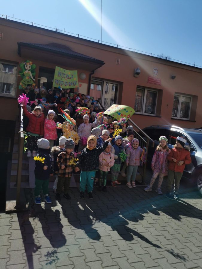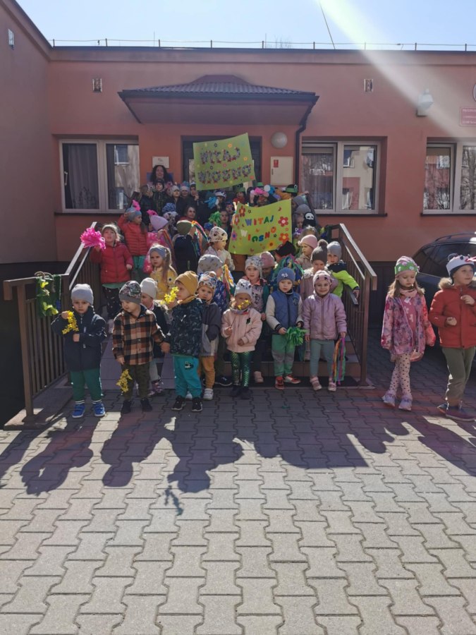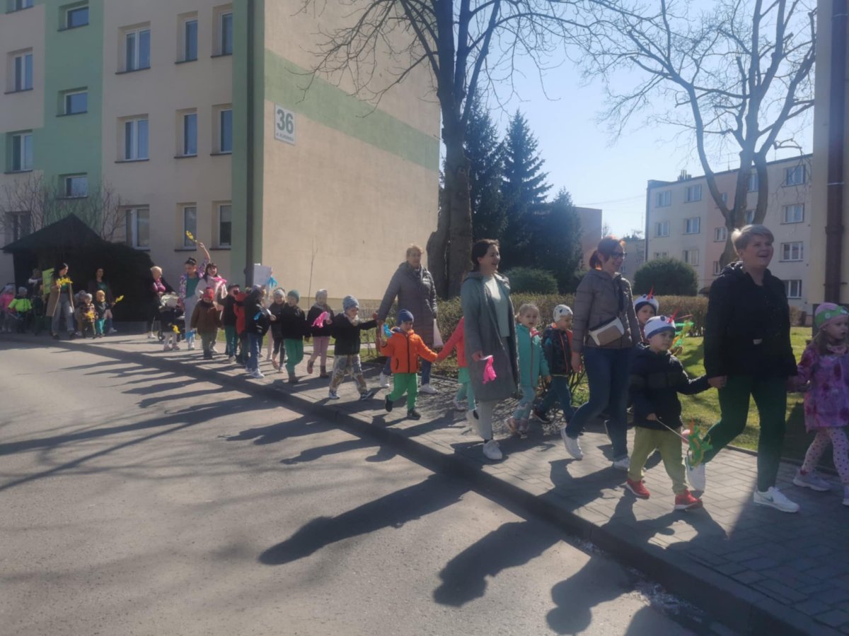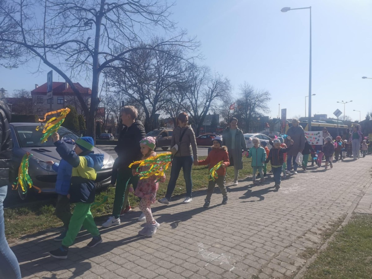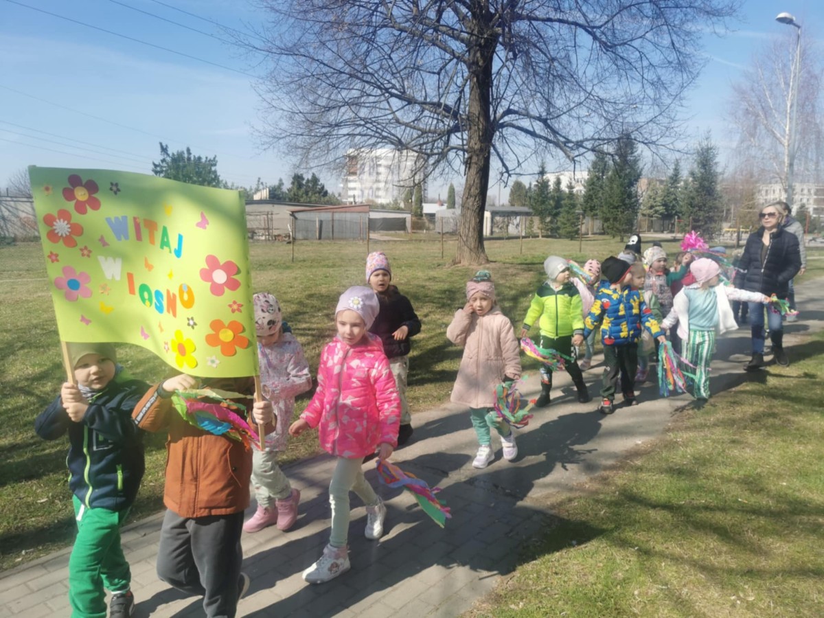 Dzień 21 marca w naszym przedszkolu był pełen był atrakcji i uśmiechów bowiem powitaliśmy nową porę roku – wiosnę. Pogoda od samego rana nam sprzyjała, więc ubrani na zielono, wyposażeni w opaski wiosenne, wianki i transparenty, wyruszyliśmy z barwnym pochodem po ulicach miasta. Poszukiwaliśmy oznak nowej pory roku. Dzieci z uśmiechem na twarzach szukały pierwszych pąków na drzewach, kwiatów, nasłuchiwały śpiewu ptaków. Nie zabrakło wiosennych piosenek oraz głośnych okrzyków, którymi pożegnaliśmy zimę. Uliczni przechodnie otrzymali od dzieci kwiatuszki z wiosennymi sentencjami Przyjście nowej pory roku jest doskonałą okazją do tego, by uzmysłowić dzieciom, jak wielkie bogactwo niesie ze sobą budząca się do życia przyroda. Do przedszkola wróciliśmy zmęczeni, ale szczęśliwi. Wiosna już tu jest, a my cieszymy się jej ciepłem i kolorami!