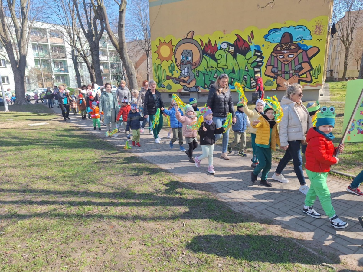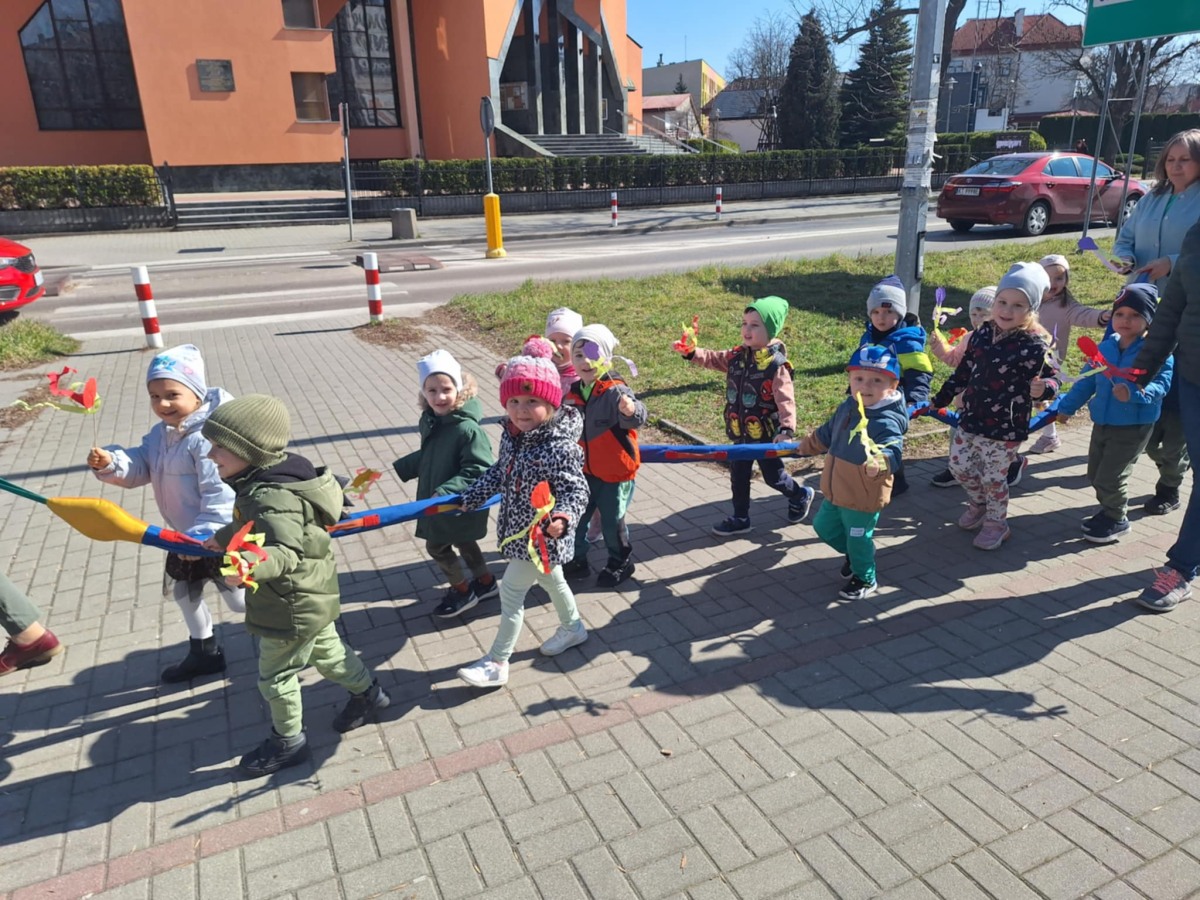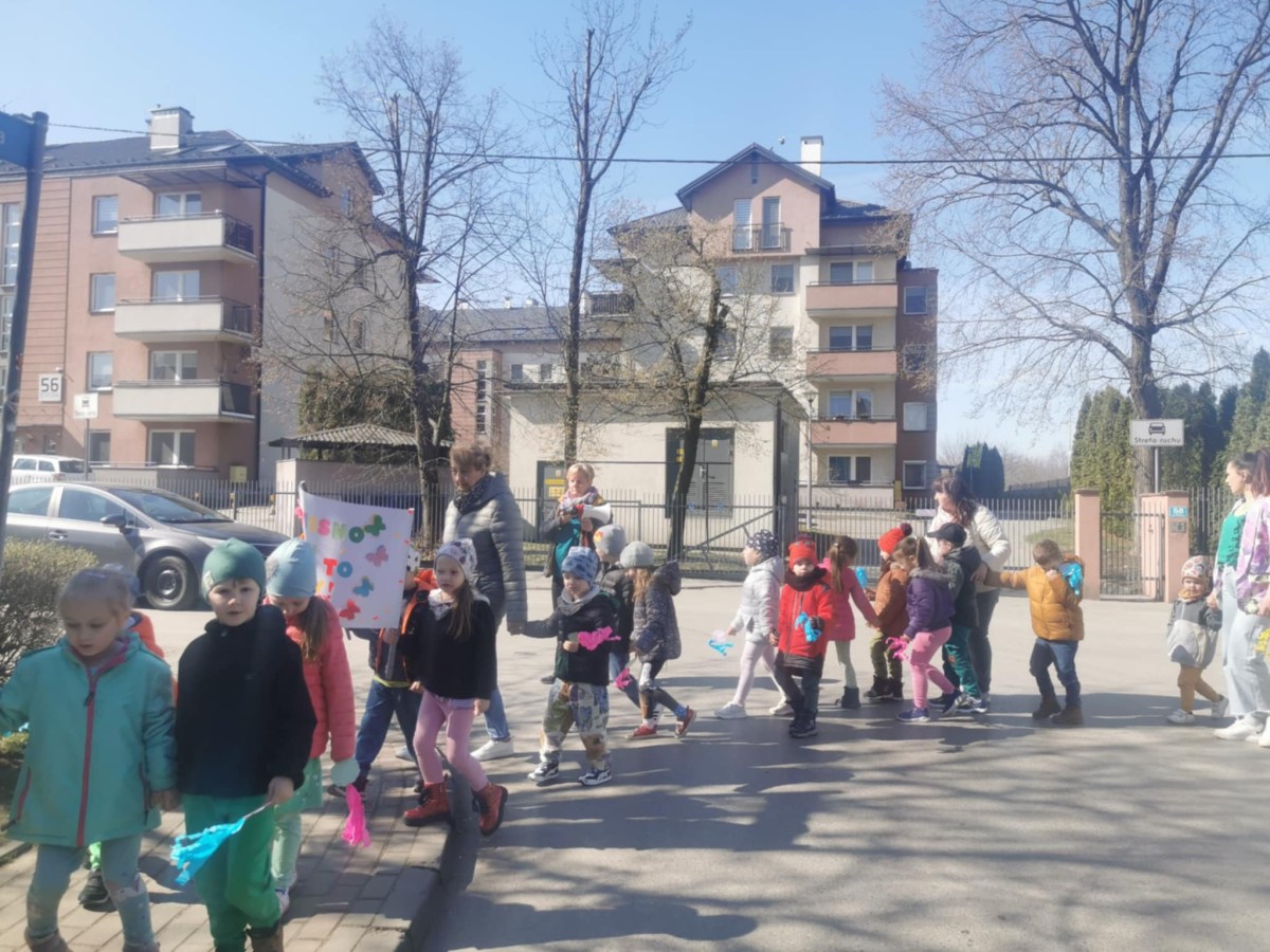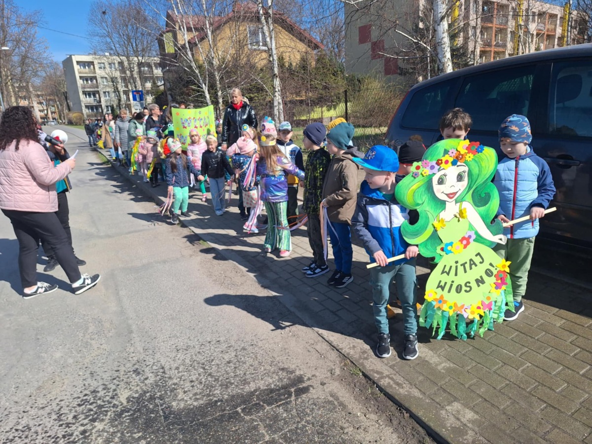 Dzień 21 marca w naszym przedszkolu był pełen był atrakcji i uśmiechów bowiem powitaliśmy nową porę roku – wiosnę. Pogoda od samego rana nam sprzyjała, więc ubrani na zielono, wyposażeni w opaski wiosenne, wianki i transparenty, wyruszyliśmy z barwnym pochodem po ulicach miasta. Poszukiwaliśmy oznak nowej pory roku. Dzieci z uśmiechem na twarzach szukały pierwszych pąków na drzewach, kwiatów, nasłuchiwały śpiewu ptaków. Nie zabrakło wiosennych piosenek oraz głośnych okrzyków, którymi pożegnaliśmy zimę. Uliczni przechodnie otrzymali od dzieci kwiatuszki z wiosennymi sentencjami Przyjście nowej pory roku jest doskonałą okazją do tego, by uzmysłowić dzieciom, jak wielkie bogactwo niesie ze sobą budząca się do życia przyroda. Do przedszkola wróciliśmy zmęczeni, ale szczęśliwi. Wiosna już tu jest, a my cieszymy się jej ciepłem i kolorami!