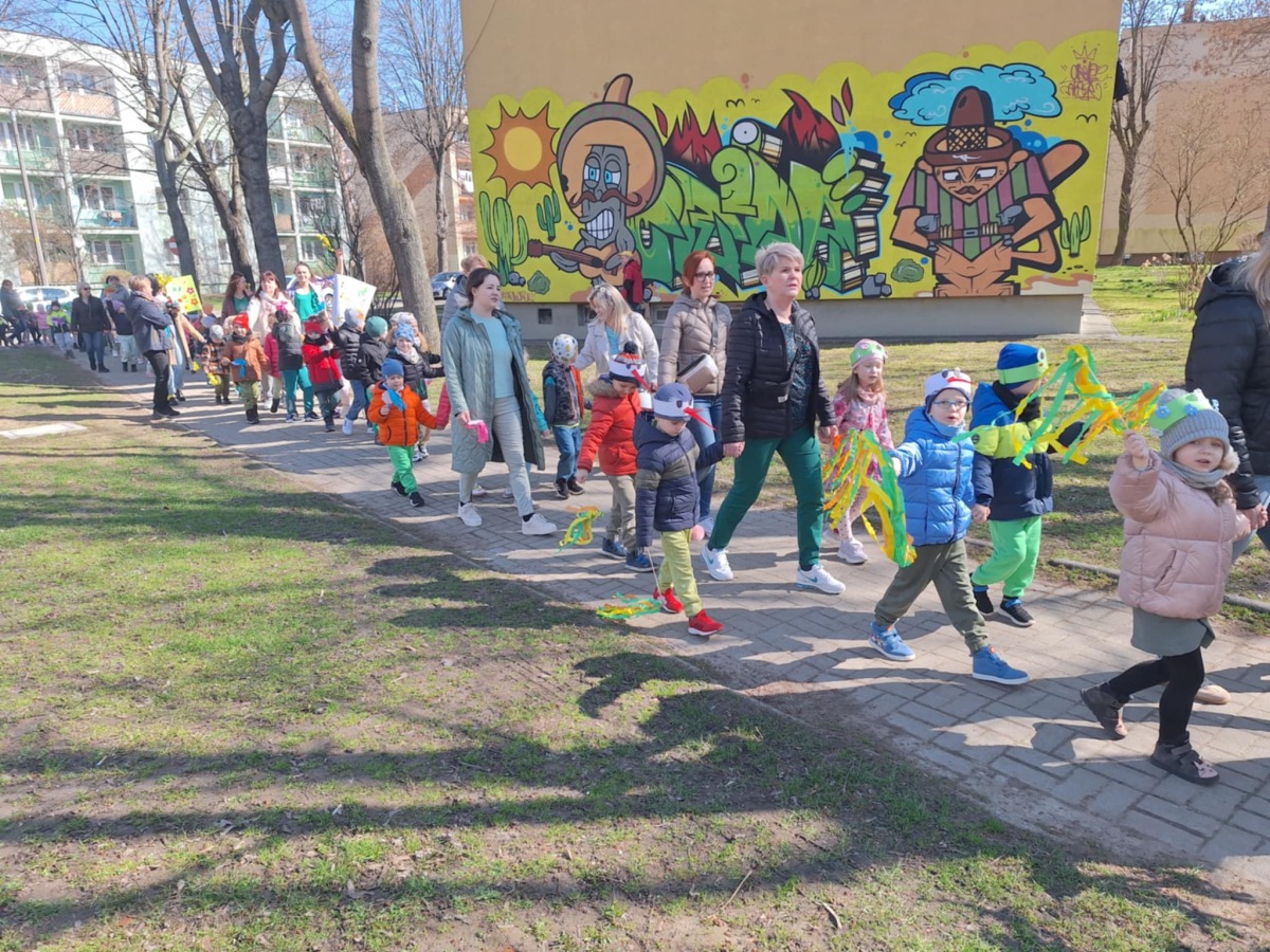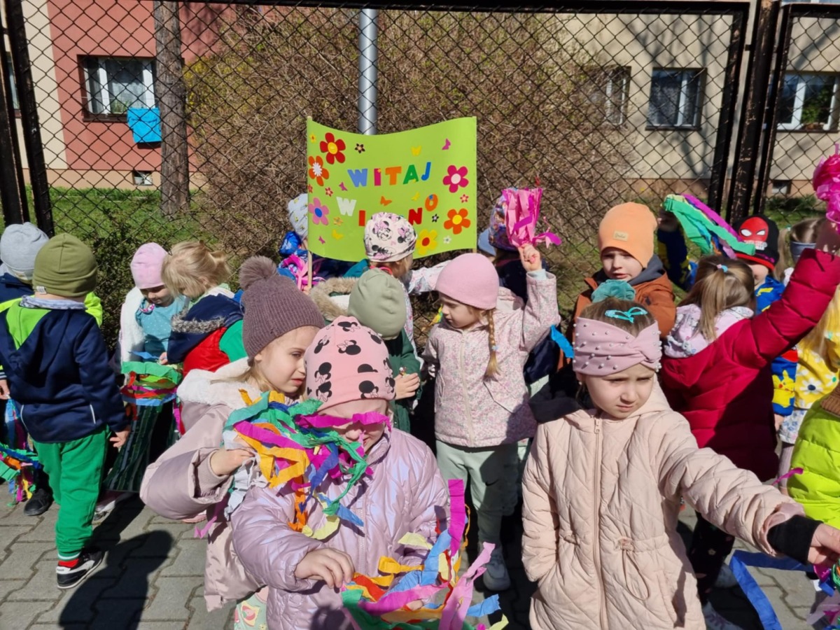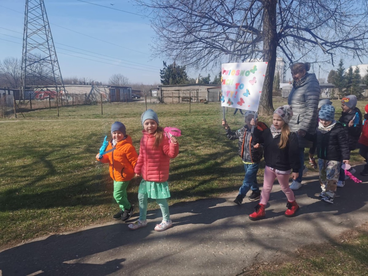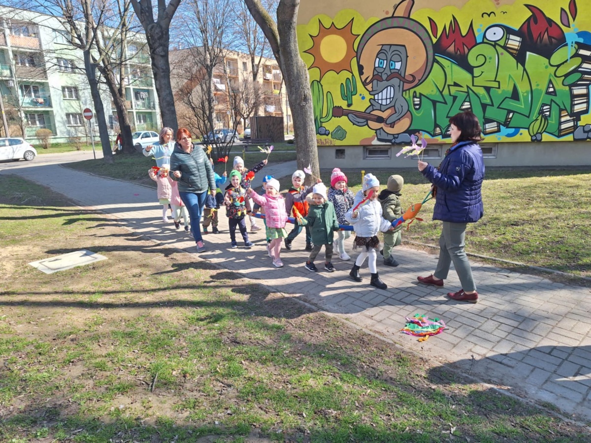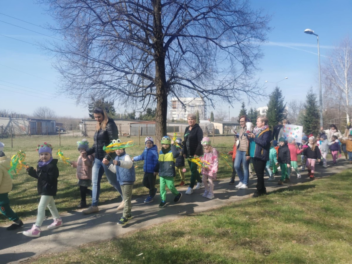 Dzień 21 marca w naszym przedszkolu był pełen był atrakcji i uśmiechów bowiem powitaliśmy nową porę roku – wiosnę. Pogoda od samego rana nam sprzyjała, więc ubrani na zielono, wyposażeni w opaski wiosenne, wianki i transparenty, wyruszyliśmy z barwnym pochodem po ulicach miasta. Poszukiwaliśmy oznak nowej pory roku. Dzieci z uśmiechem na twarzach szukały pierwszych pąków na drzewach, kwiatów, nasłuchiwały śpiewu ptaków. Nie zabrakło wiosennych piosenek oraz głośnych okrzyków, którymi pożegnaliśmy zimę. Uliczni przechodnie otrzymali od dzieci kwiatuszki z wiosennymi sentencjami Przyjście nowej pory roku jest doskonałą okazją do tego, by uzmysłowić dzieciom, jak wielkie bogactwo niesie ze sobą budząca się do życia przyroda. Do przedszkola wróciliśmy zmęczeni, ale szczęśliwi. Wiosna już tu jest, a my cieszymy się jej ciepłem i kolorami!