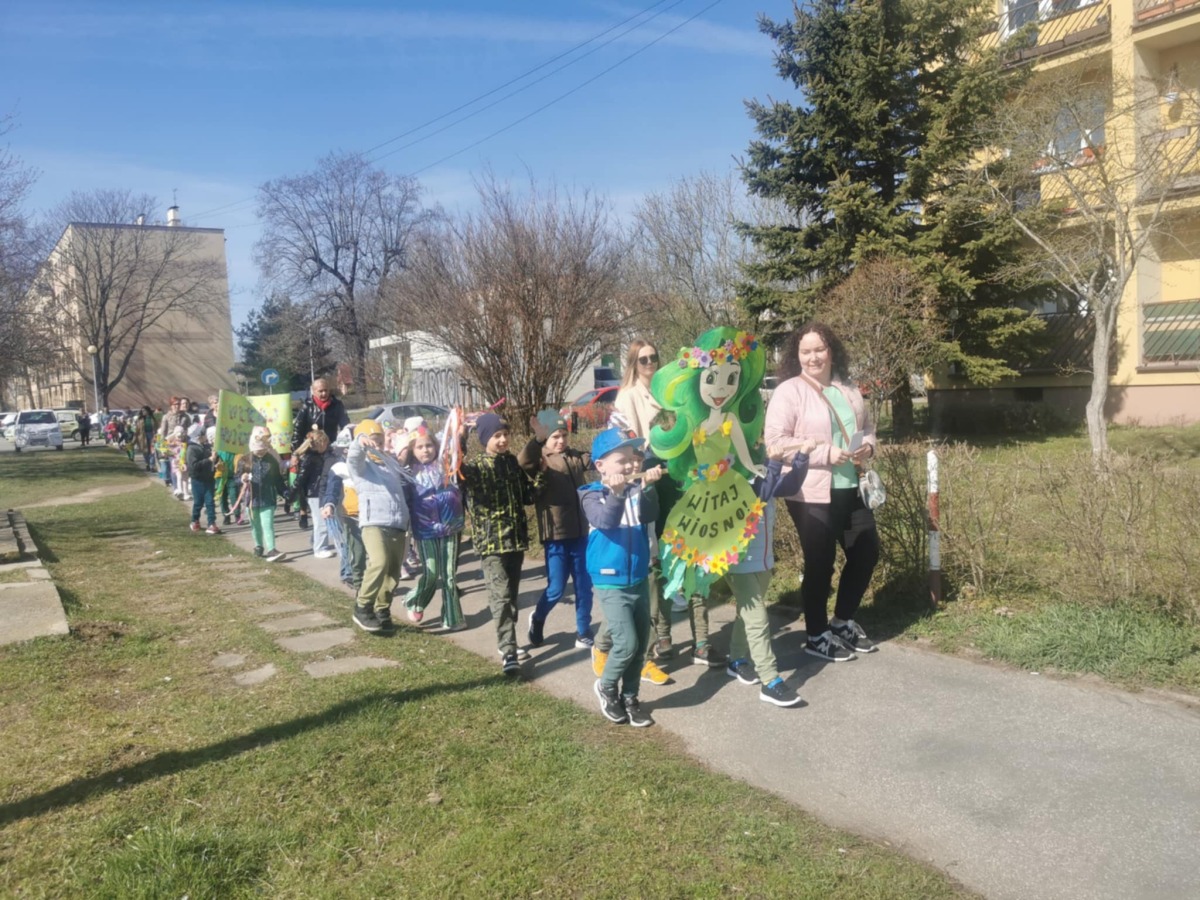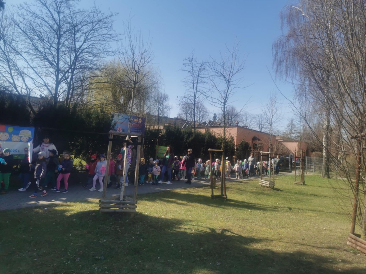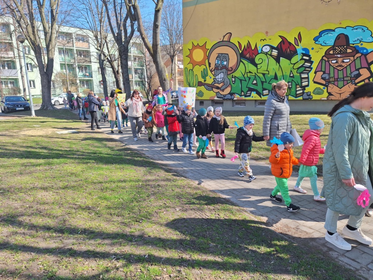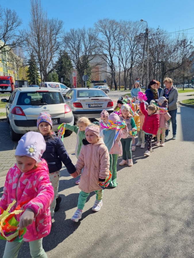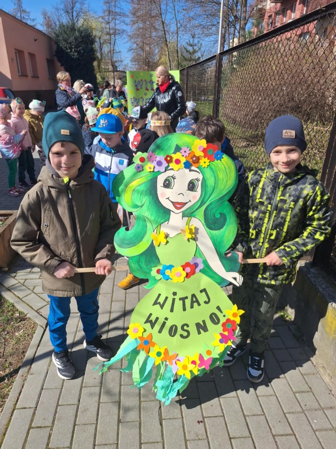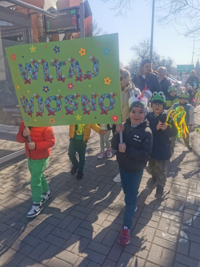 Dzień 21 marca w naszym przedszkolu był pełen był atrakcji i uśmiechów bowiem powitaliśmy nową porę roku – wiosnę. Pogoda od samego rana nam sprzyjała, więc ubrani na zielono, wyposażeni w opaski wiosenne, wianki i transparenty, wyruszyliśmy z barwnym pochodem po ulicach miasta. Poszukiwaliśmy oznak nowej pory roku. Dzieci z uśmiechem na twarzach szukały pierwszych pąków na drzewach, kwiatów, nasłuchiwały śpiewu ptaków. Nie zabrakło wiosennych piosenek oraz głośnych okrzyków, którymi pożegnaliśmy zimę. Uliczni przechodnie otrzymali od dzieci kwiatuszki z wiosennymi sentencjami Przyjście nowej pory roku jest doskonałą okazją do tego, by uzmysłowić dzieciom, jak wielkie bogactwo niesie ze sobą budząca się do życia przyroda. Do przedszkola wróciliśmy zmęczeni, ale szczęśliwi. Wiosna już tu jest, a my cieszymy się jej ciepłem i kolorami!