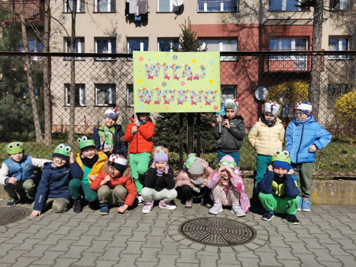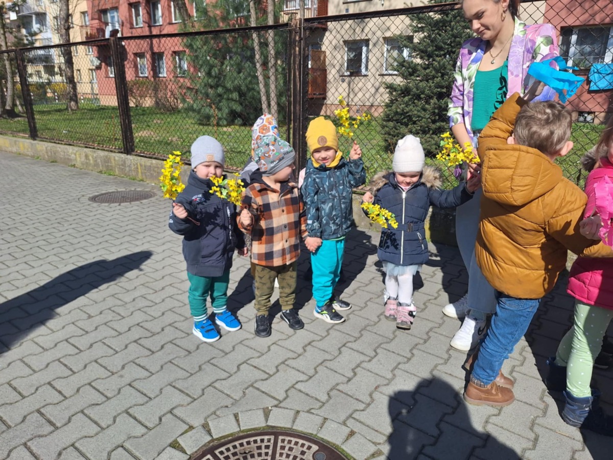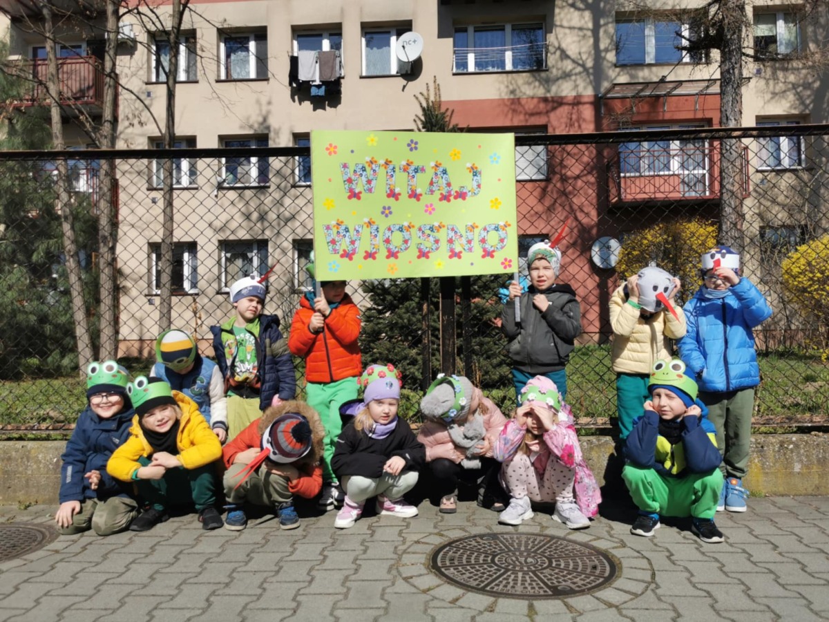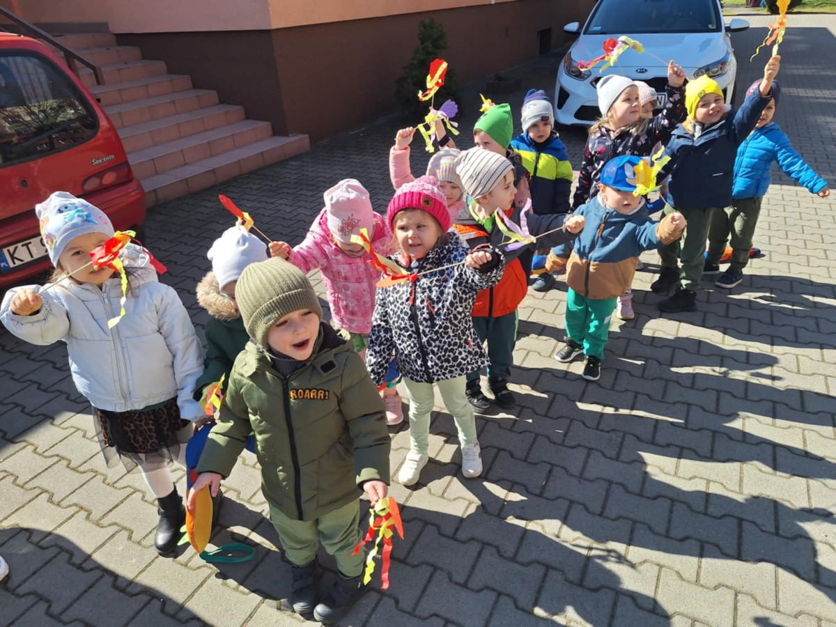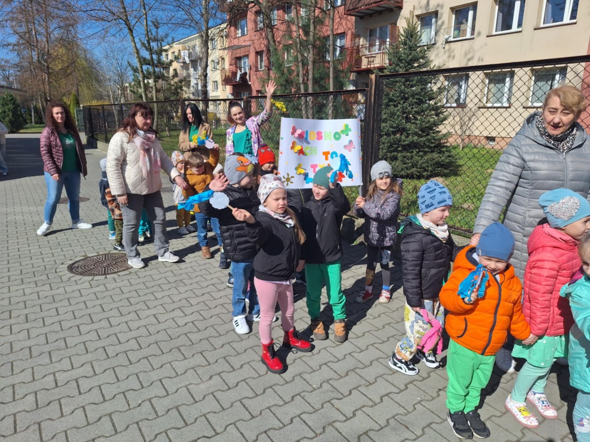 Dzień 21 marca w naszym przedszkolu był pełen był atrakcji i uśmiechów bowiem powitaliśmy nową porę roku – wiosnę. Pogoda od samego rana nam sprzyjała, więc ubrani na zielono, wyposażeni w opaski wiosenne, wianki i transparenty, wyruszyliśmy z barwnym pochodem po ulicach miasta. Poszukiwaliśmy oznak nowej pory roku. Dzieci z uśmiechem na twarzach szukały pierwszych pąków na drzewach, kwiatów, nasłuchiwały śpiewu ptaków. Nie zabrakło wiosennych piosenek oraz głośnych okrzyków, którymi pożegnaliśmy zimę. Uliczni przechodnie otrzymali od dzieci kwiatuszki z wiosennymi sentencjami Przyjście nowej pory roku jest doskonałą okazją do tego, by uzmysłowić dzieciom, jak wielkie bogactwo niesie ze sobą budząca się do życia przyroda. Do przedszkola wróciliśmy zmęczeni, ale szczęśliwi. Wiosna już tu jest, a my cieszymy się jej ciepłem i kolorami!