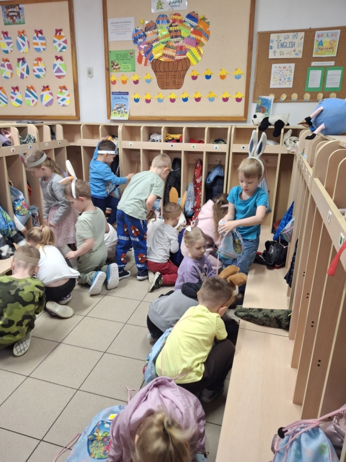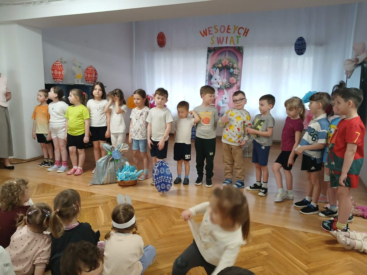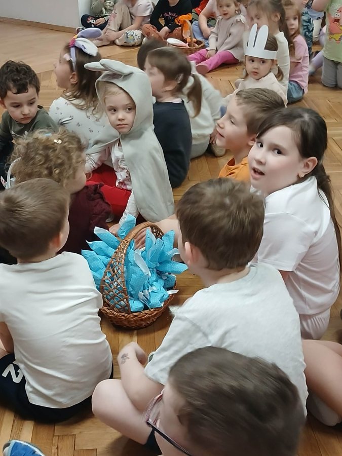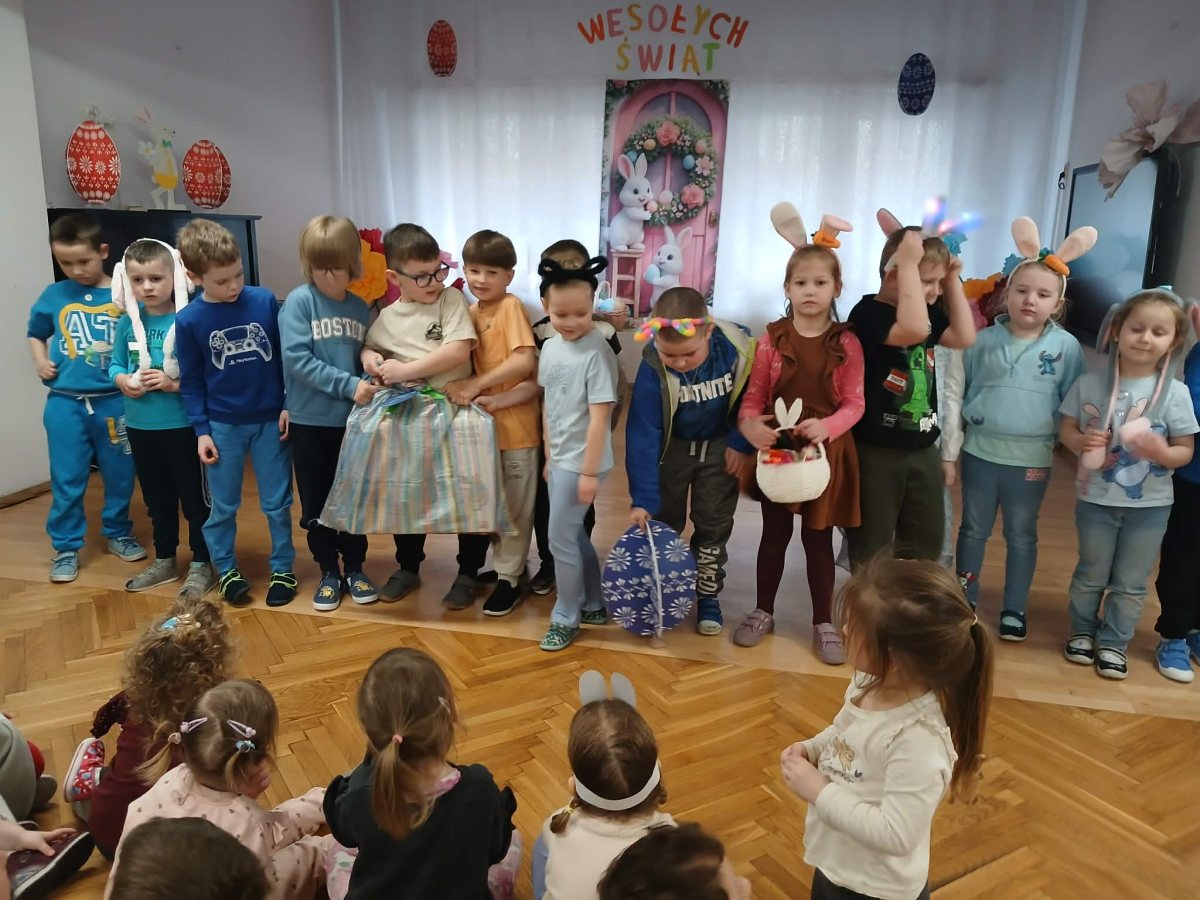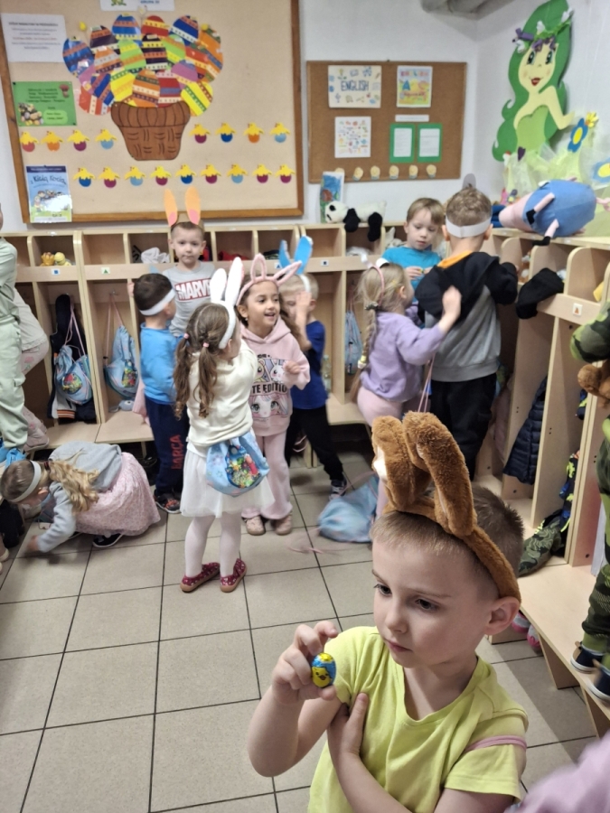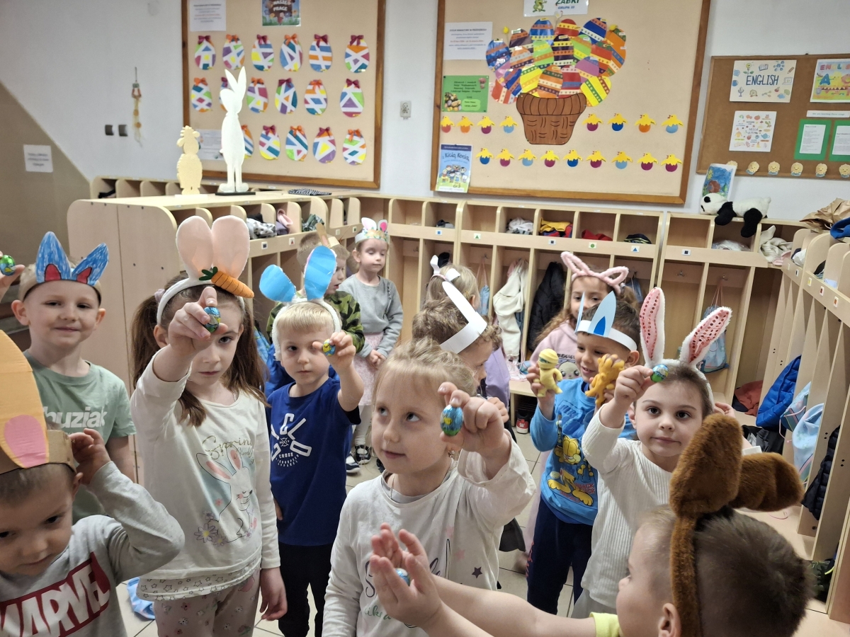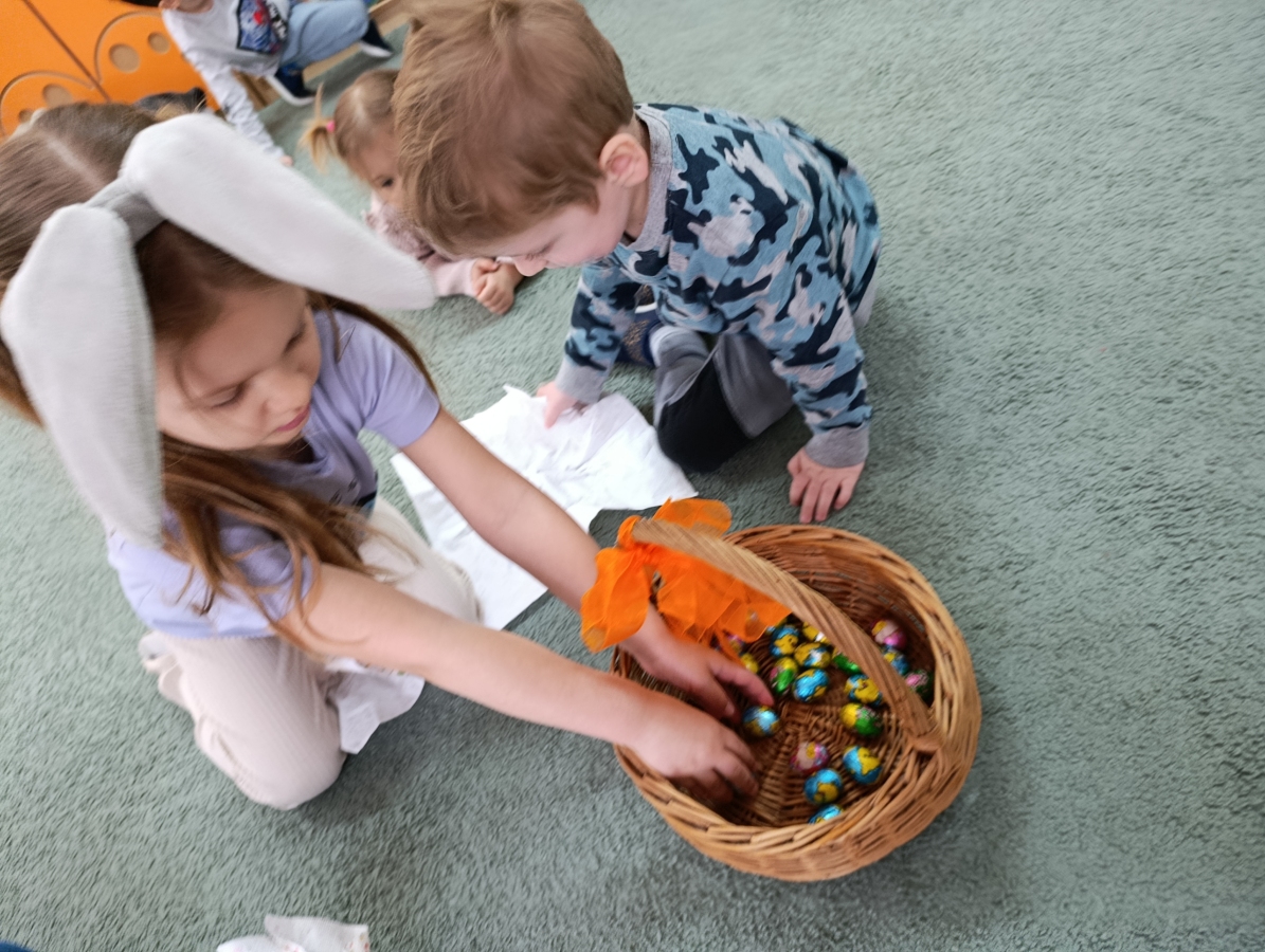 W naszym przedszkolu odbyła się wyjątkowa zabawa pod hasłem Tropem wielkanocnego zająca. W wydarzeniu wzięły udział wszystkie dzieci, które z ogromnym entuzjazmem uczestniczyły w przygotowanych aktywnościach. Głównym elementem zabawy były poszukiwania, polegające na odnajdywaniu ukrytych w salach oraz innych pomieszczeniach przedszkola drobnych upominków – czekoladowych jajek pozostawionych przez zajączka. Wskazówką był specjalny list od wielkanocnego zajączka, który wprowadził je w magiczny nastrój zabawy. W trakcie wydarzenia przedszkolaki rozwiązywały zagadki oraz śpiewały wesołe piosenki, nie zabrakło również rozmów na temat zwyczajów świątecznych. Każde poprawnie wykonane zadanie przybliżało je do otrzymania przygotowanych niespodzianek. Dzieci z ochotą angażowały się w aktywności, wykazując się dużą kreatywnością i współpracą. Na zakończenie zabawy wysłuchały od pani dyrektor świątecznych życzeń, a odnalezione drobne niespodzianki oraz otrzymane grupowe upominki sprawiły im wiele radości. Wydarzenie dostarczyło wielu pozytywnych emocji oraz wprowadziło dzieci w atmosferę nadchodzących Świąt Wielkanocnych. Zabawa była doskonałą okazją do pielęgnowania świątecznych tradycji w sposób radosny, atrakcyjny i pełen magii.