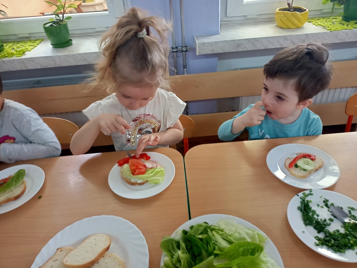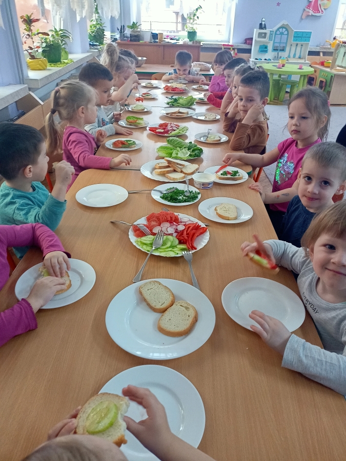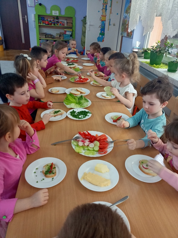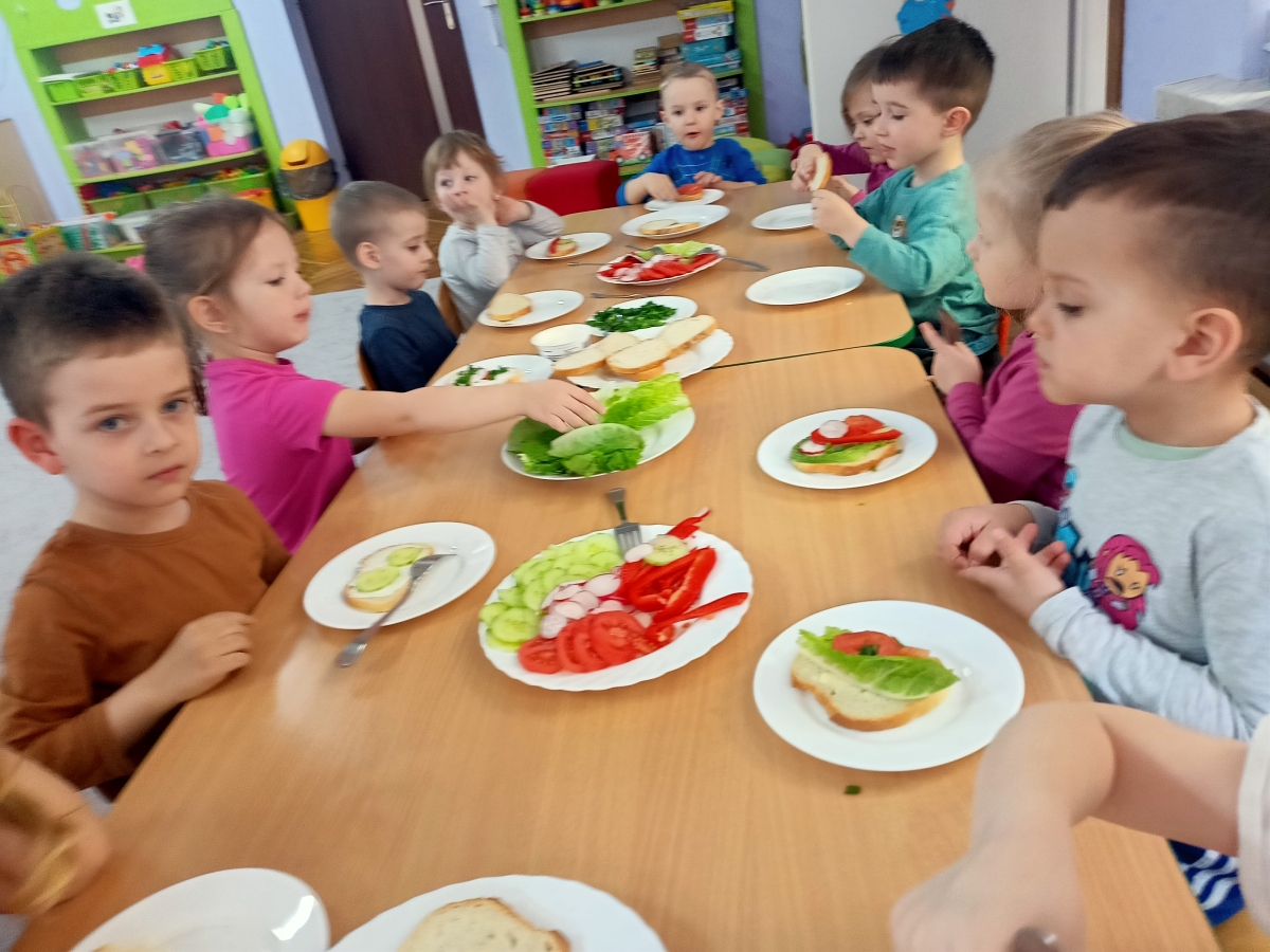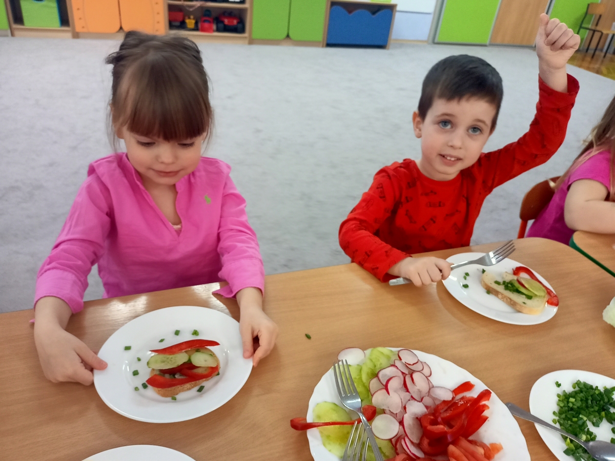 Dzieci z grupy Stokrotki przygotowały kanapki. Samodzielnie do spożycia dobierały składniki z użyciem masła, sera, pomidorów, ogórków, papryki, rzodkiewki, szczypiorku i innych zdrowych produktów. Wykonanie i degustowanie potraw pozwala na kształtowanie odpowiednich nawyków żywieniowych oraz rozwijanie kreatywności i doskonalenie samodzielności u dzieci. Zachęcamy również najmłodszych od pomocy rodzicom w przygotowaniu posiłków.