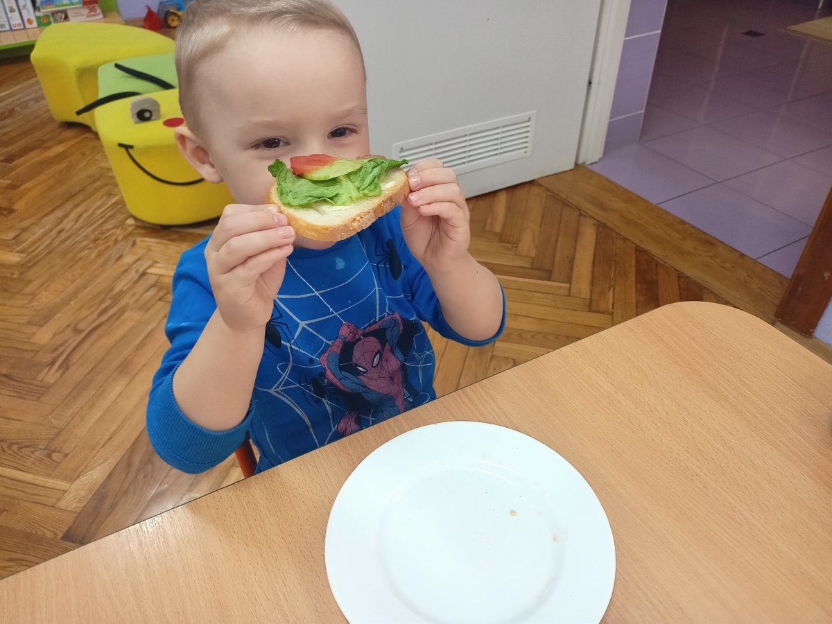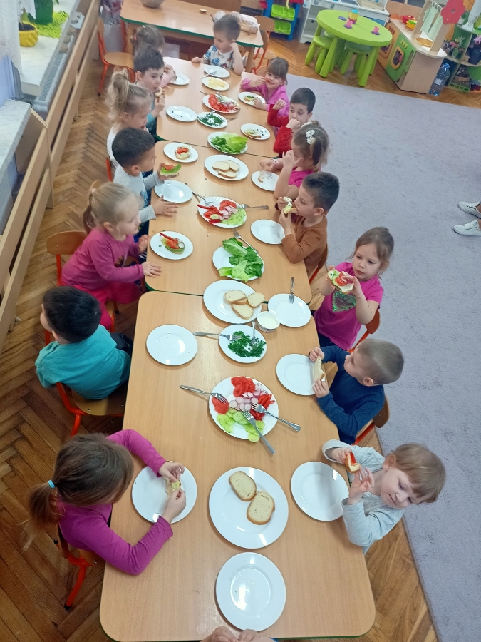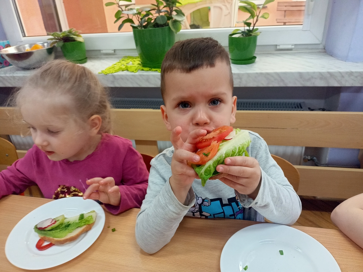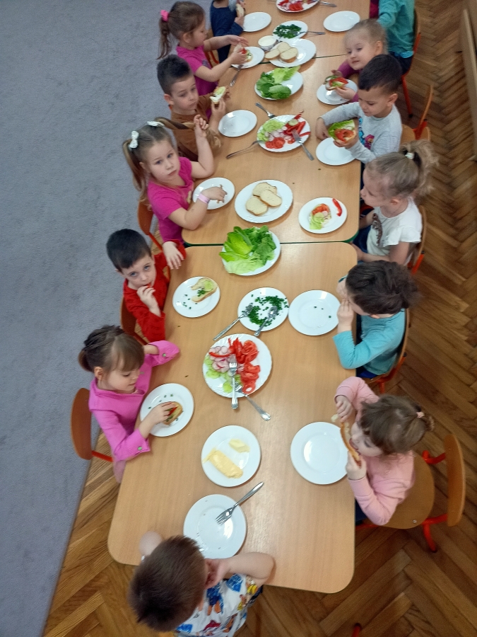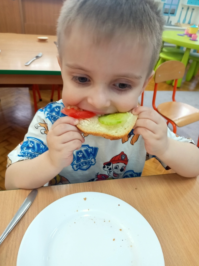 Dzieci z grupy Stokrotki przygotowały kanapki. Samodzielnie do spożycia dobierały składniki z użyciem masła, sera, pomidorów, ogórków, papryki, rzodkiewki, szczypiorku i innych zdrowych produktów. Wykonanie i degustowanie potraw pozwala na kształtowanie odpowiednich nawyków żywieniowych oraz rozwijanie kreatywności i doskonalenie samodzielności u dzieci. Zachęcamy również najmłodszych od pomocy rodzicom w przygotowaniu posiłków.