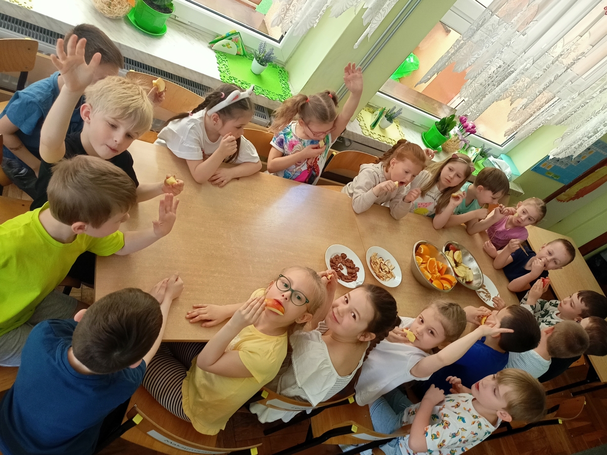 W dniach od 29.04 do 30.04.2024 r. w grupie V realizowaliśmy ogólnopolski program edukacyjny dla przedszkoli pt.,,Skąd się biorą produkty ekologiczne”. Zgodnie z celem programu zwiększaliśmy świadomość i wiedzę na temat rolnictwa ekologicznego oraz budowaliśmy właściwe nawyki żywieniowe u dzieci. Podczas zajęć edukacyjnych przedszkolaki nauczyły się skąd się biorą produkty ekologiczne, dlaczego warto je wybierać, jakie są zalecenia zdrowego stylu życia oraz jak przestrzegać zasad higieny. Dzieci aktywnie brały udziału w ciekawych zajęciach. Oglądały film animowany, poznały niskoprzetworzone produkty, żywność ekologiczną i piramidę zdrowego żywienia. Samodzielnie wykonały i degustowały szaszłyki owocowe. W naszym przedszkolu było zdrowo, ekologicznie i przyjaźnie.