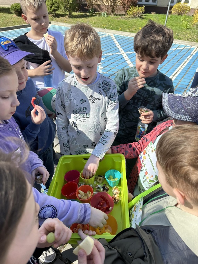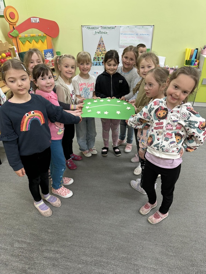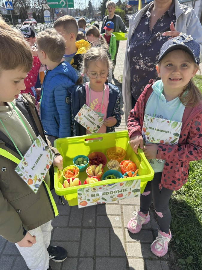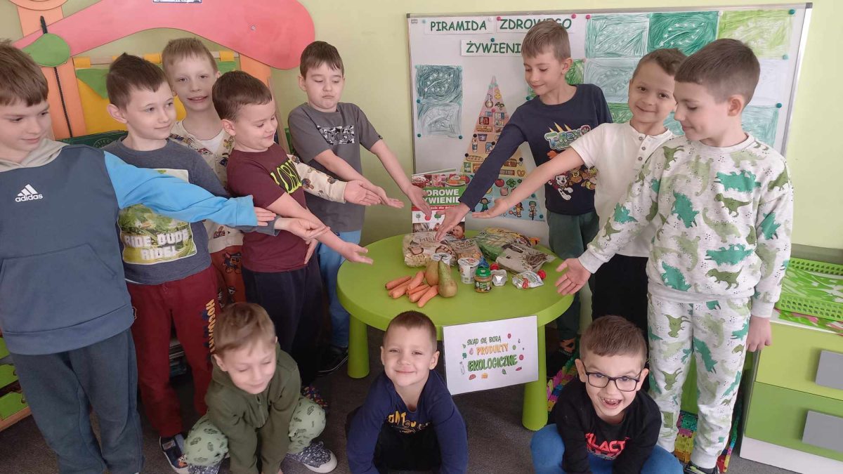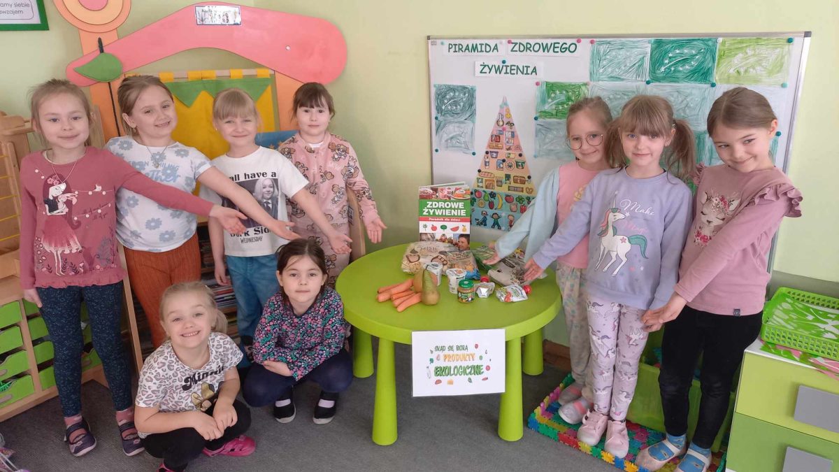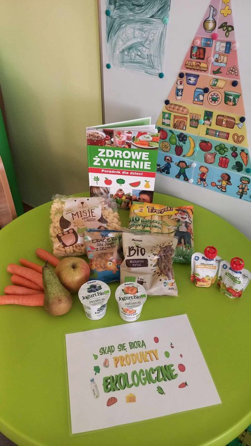 Dzieci z grupy Kotki przystąpiły do realizacji programu ekologicznego „Skąd się biorą produkty ekologiczne”. Na początku obejrzały film, ich zadaniem było zaobserwowanie skąd pochodzą takie produkty, na które przyklejane są znaczki. Usłyszały, że EKO oznacza naturalne, czyli takie, które nie ma żadnych sztucznych, niezdrowych dodatków. Zapoznały się z Piramidą Zdrowego Żywienia, przypomniały sobie co należy robić, aby prowadzić zdrowy styl życia. Miały okazje poznać i posmakować produktów ekologicznych. Kolejnym krokiem było wykonanie zdrowych, kolorowych i smacznych kanapek. Spotkały się też z panią intendentką i wspólnie spróbowały opracować zdrowy jadłospis. Na koniec Kotki wzięły udział w Paradzie Zdrowia, której celem było propagowanie idei zdrowego stylu życia wśród lokalnej społeczności, w trakcie spotkania dzieci częstowały przechodniów zdrowymi przekąskami: jabłkiem, gruszką, marchewką, papryką wykrzykując wymyślone wspólnie hasło: JEDZ ZDROWO – ŻYJ KOLOROWO.