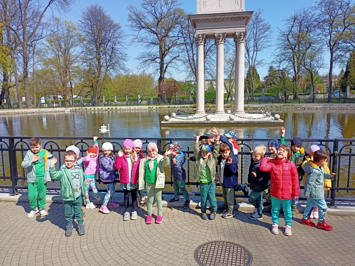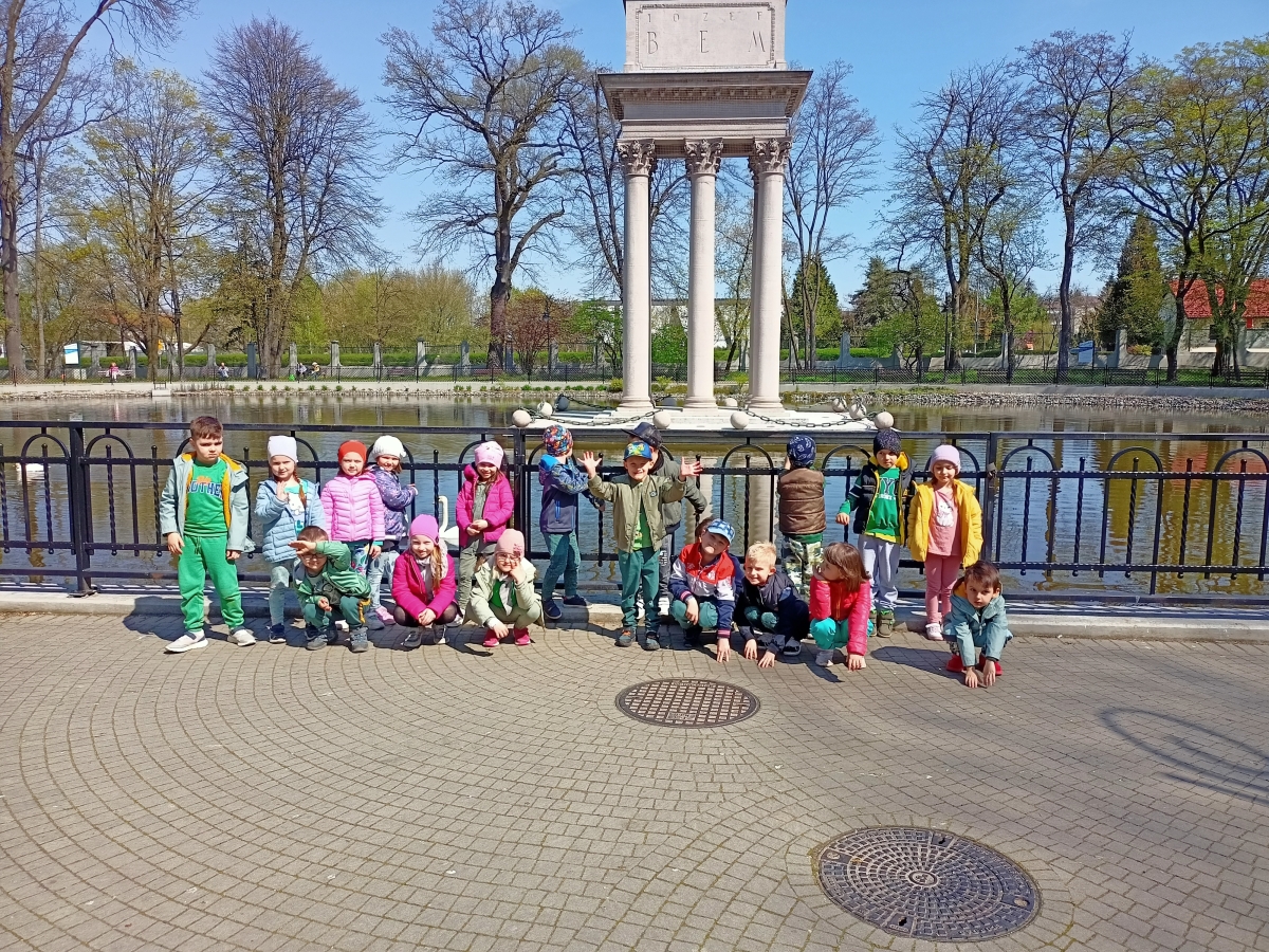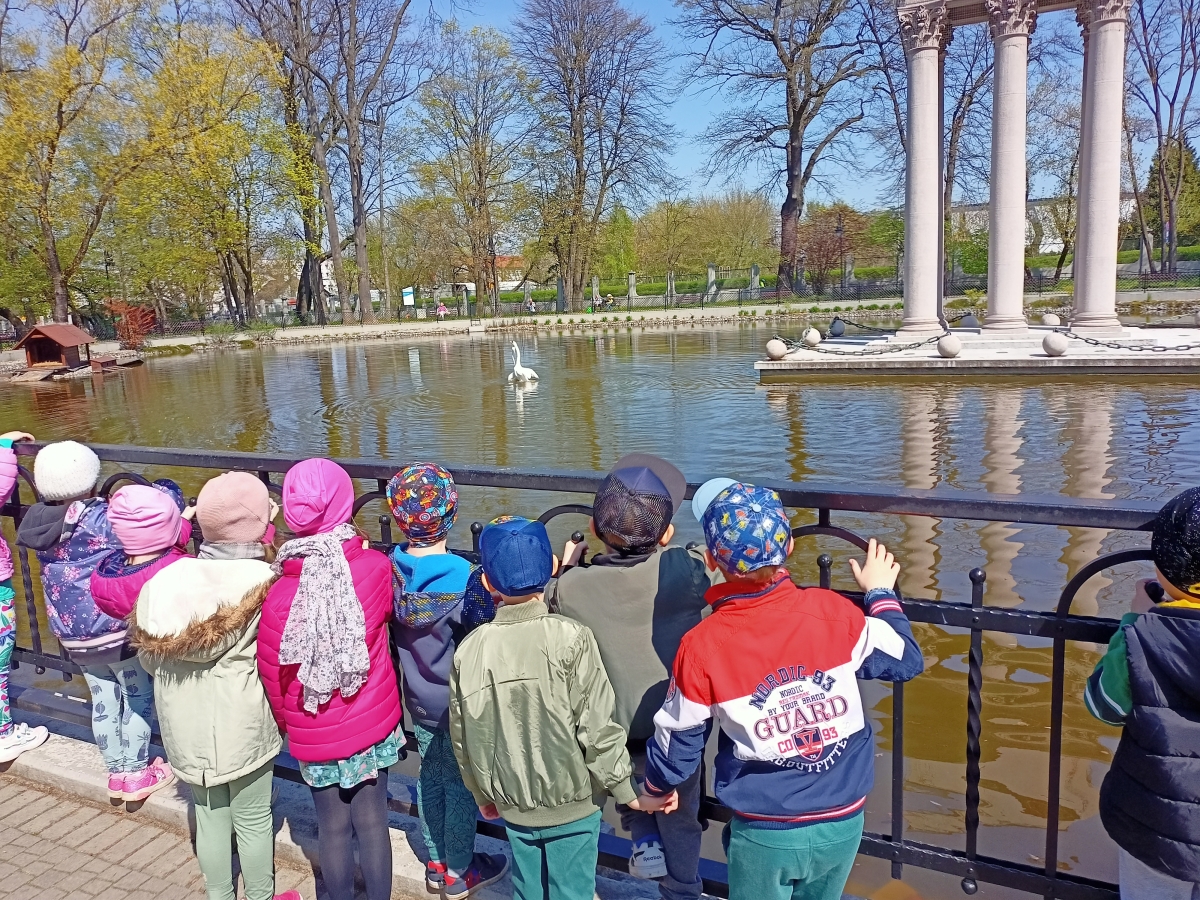 Spacerując po Parku Strzeleckim wokół Mauzoleum Józefa Bema dzieci z grupy IV Stokrotki obserwowały łabędzie na stawie oraz oglądały głazy narzutowe Trojaczki obok basenu.
