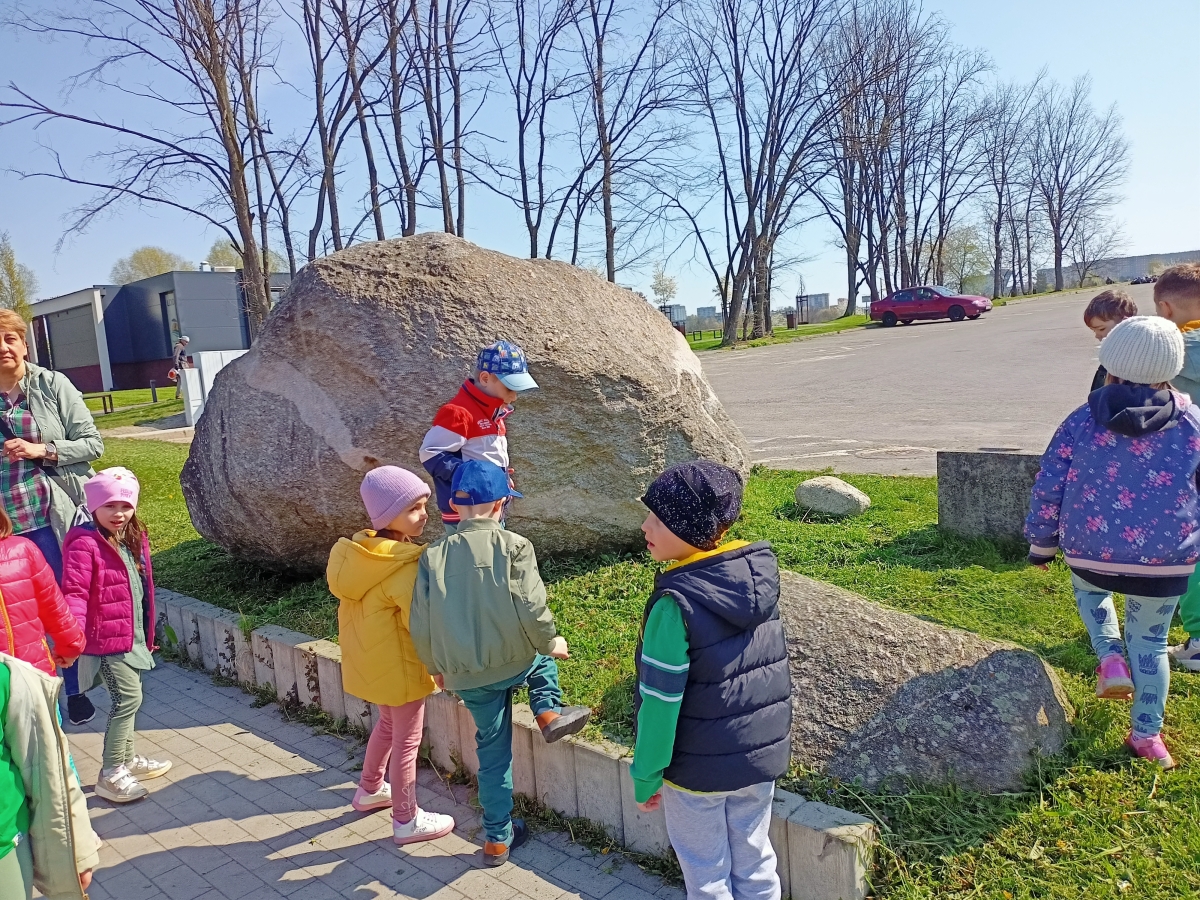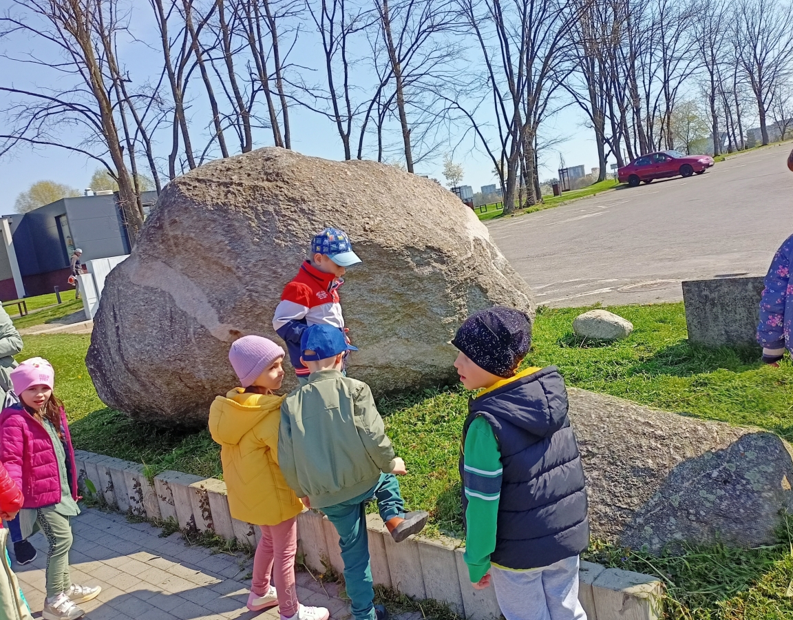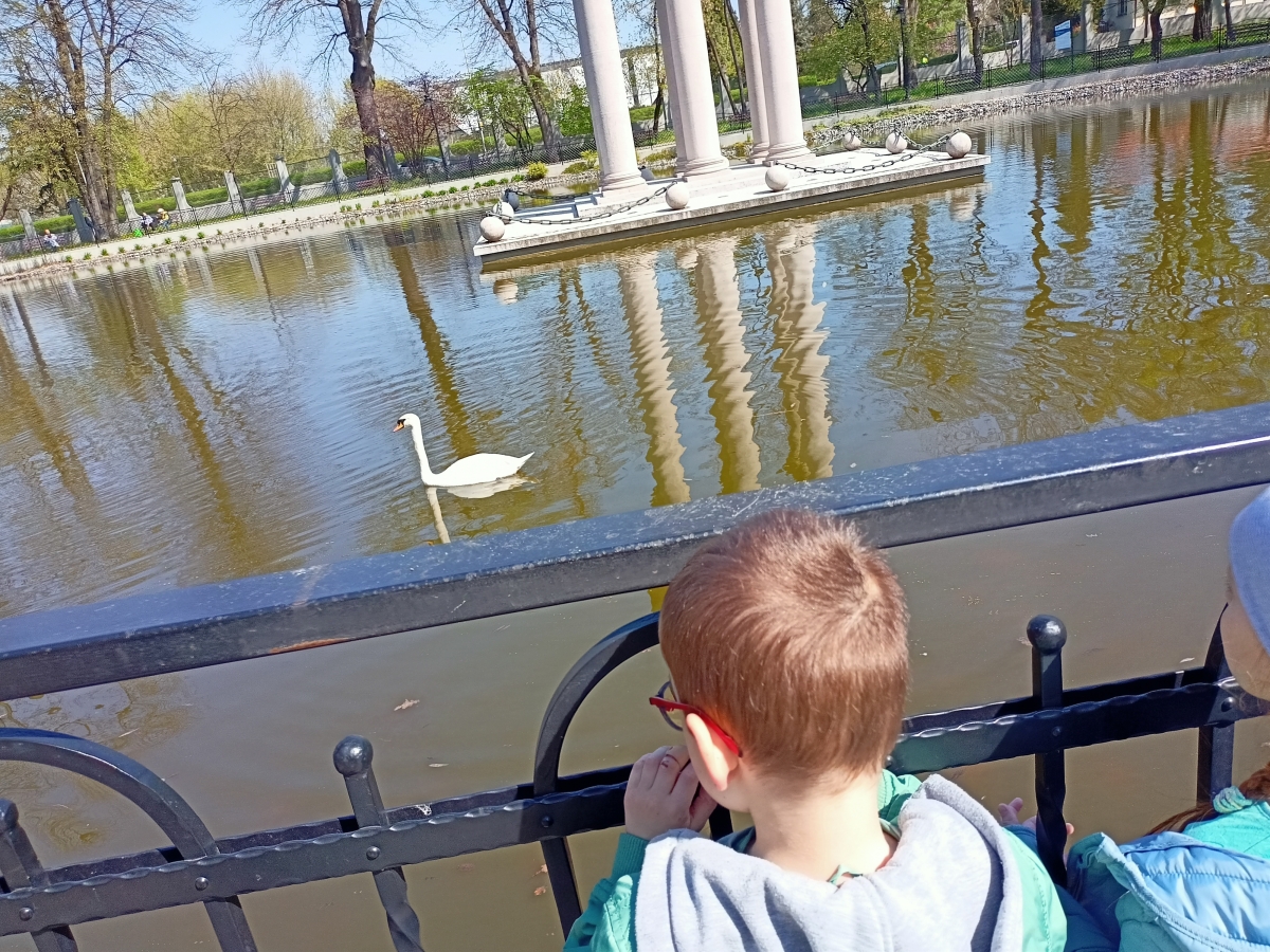 Spacerując po Parku Strzeleckim wokół Mauzoleum Józefa Bema dzieci z grupy IV Stokrotki obserwowały łabędzie na stawie oraz oglądały głazy narzutowe Trojaczki obok basenu.