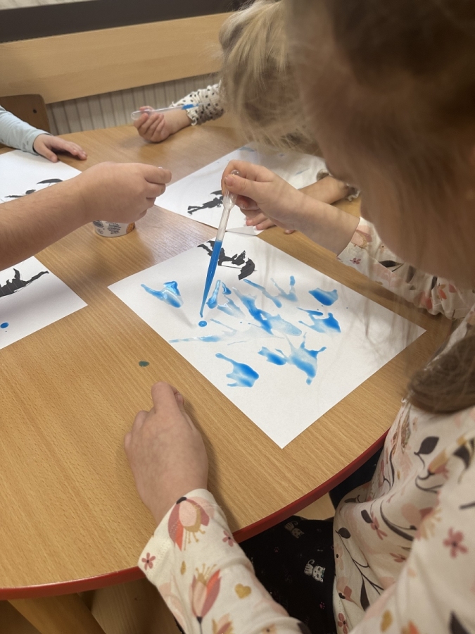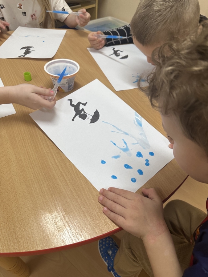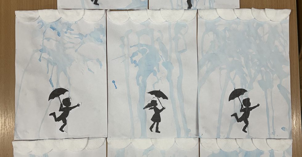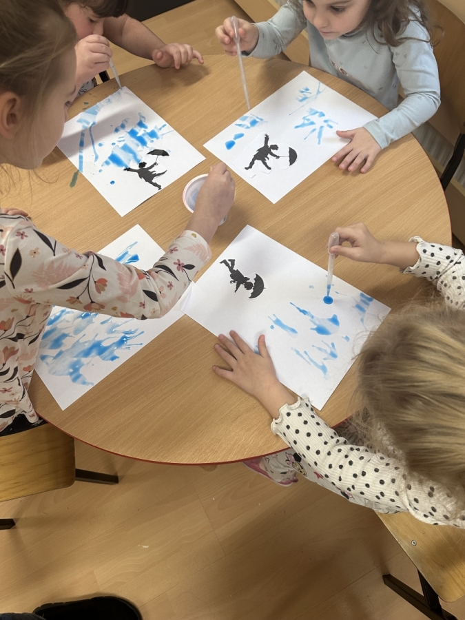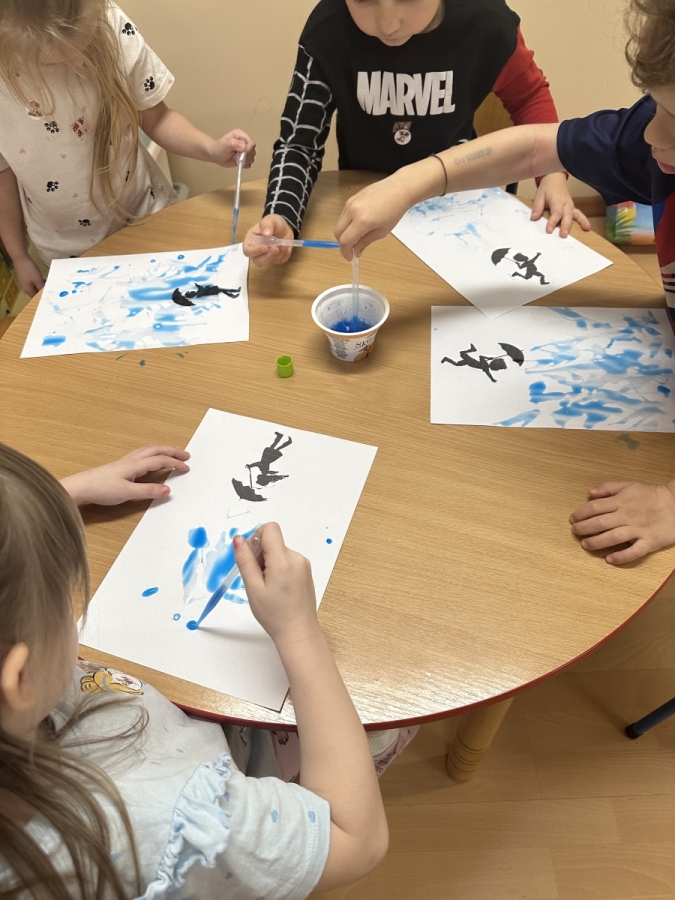 „Spacer w deszczu” – to temat ostatnich jesiennych kompozycji malarskich. Tym razem dzieci tworzyły kolorowe strugi deszczu, nanosząc barwnik pipetą i dmuchając na krople. Powstały wyjątkowe, kreatywne i pełne ruchu prace!