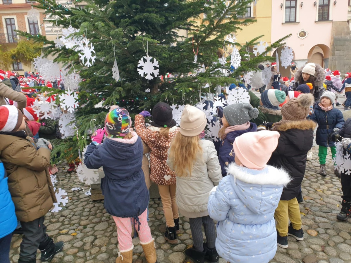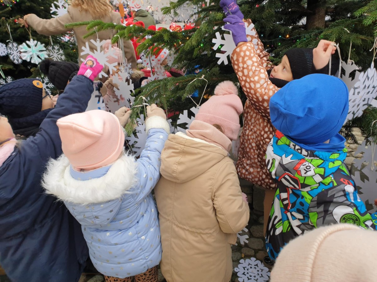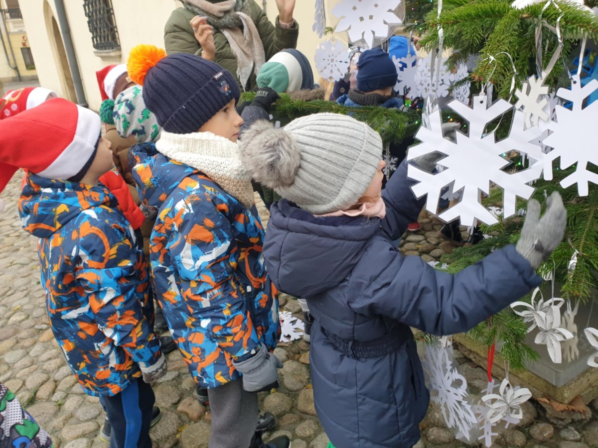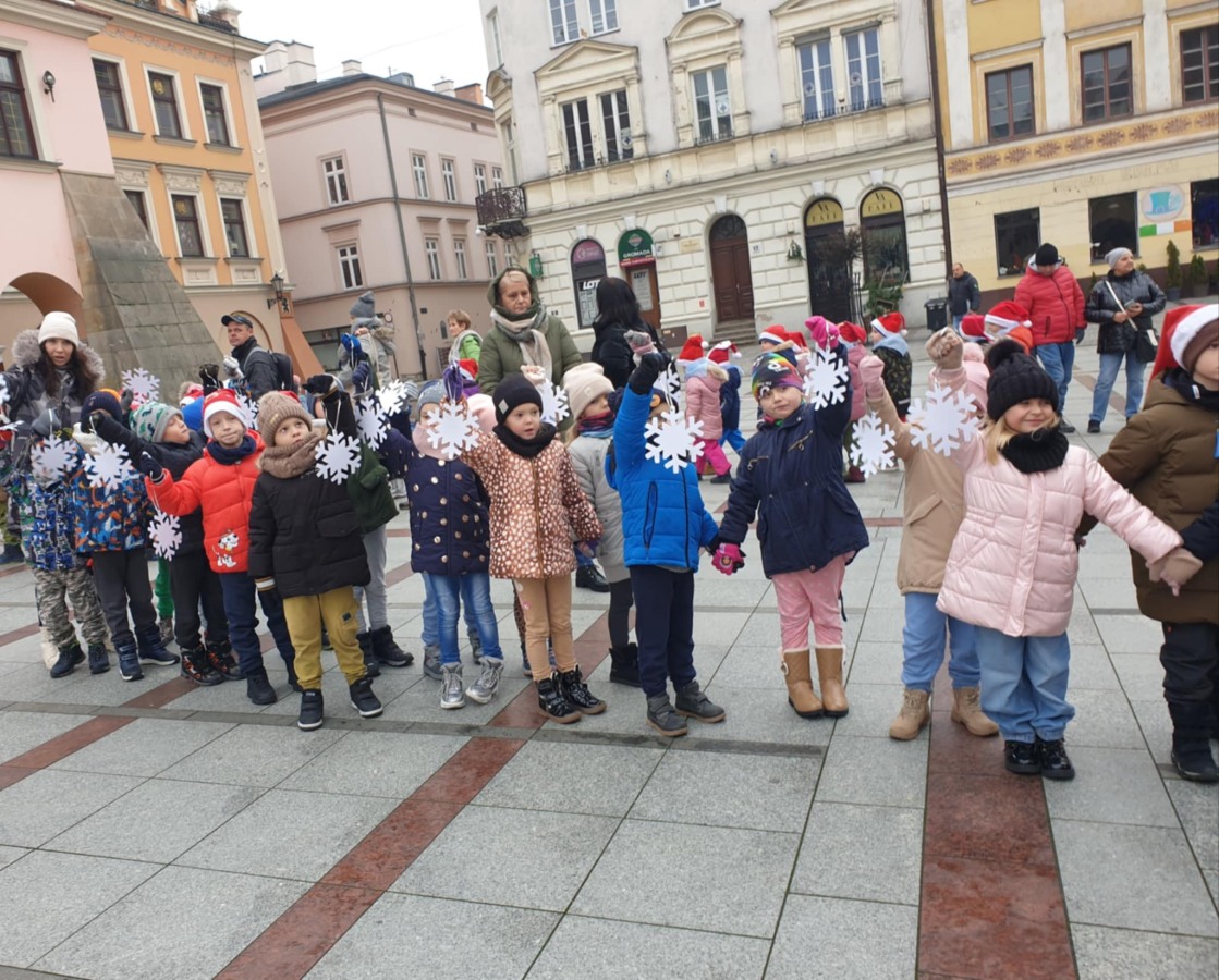 Dzisiaj na Rynku naszego miasta grupa V Kotki uczestniczyła w spotkaniu ze Św. Mikołajem. Razem z dziećmi z tarnowskich przedszkoli udekorowaliśmy białymi śnieżynkami choinki, a także w atmosferze wspólnej radości i zabawy zaśpiewaliśmy Mikołajowi piosenki w podziękowaniu za prezenty. Spotkanie to było początkiem magii zbliżających się Świąt.