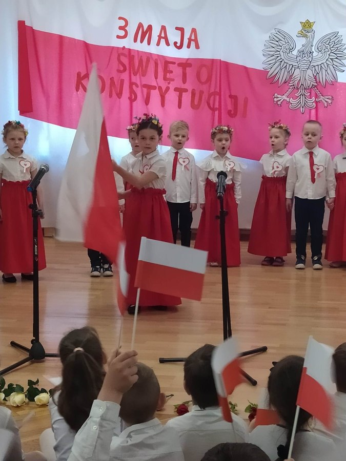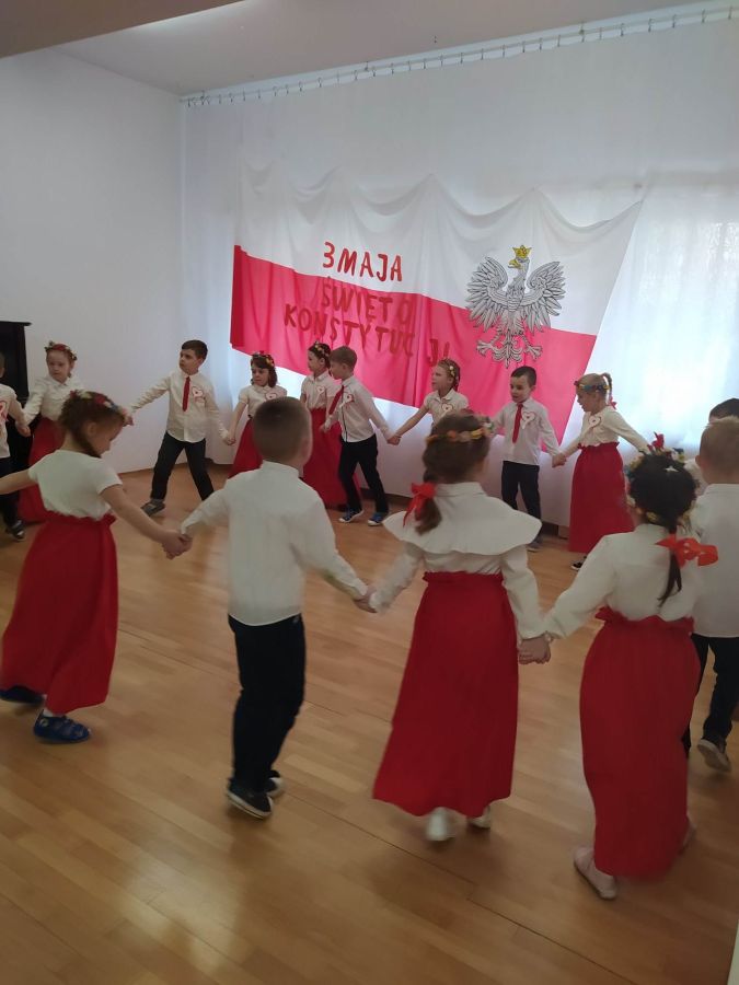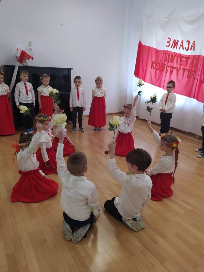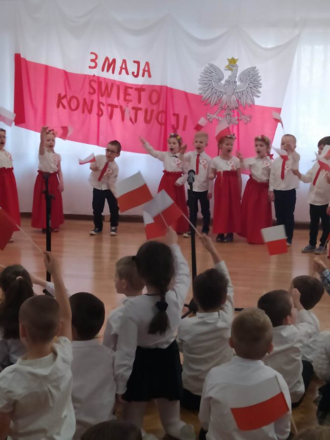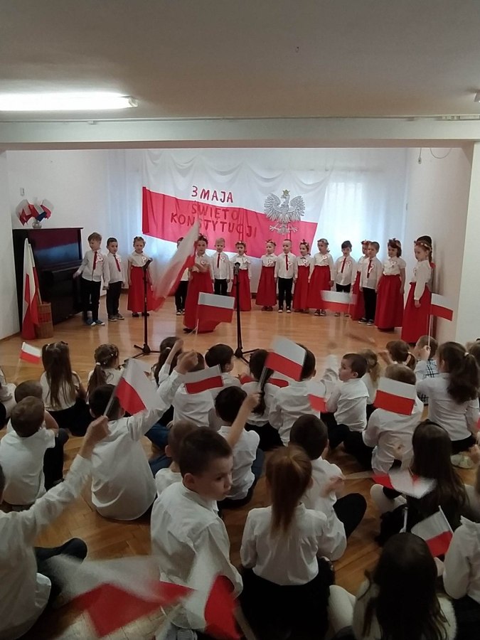 Dnia 27.04. 2023 r. w naszym przedszkolu obyła się uroczysta akademia z okazji Święta Konstytucji 3Maja. Wszyscy odświętnie ubrani z powagą obejrzeli program przygotowany przez grupę IV Stokrotki. Dzieci zaprezentowały piosenki i wiersze o tematyce patriotycznej oraz układy taneczne z kwiatami i do piosenki “Płynie Wisła płynie”. Podkreślono znaczenie naszych symboli narodowych. Przedszkolaki z dumą i powagą odśpiewały wszystkie zwrotki naszego Hymnu. Było odświętnie i uroczyście. Wszyscy przeżyli piękna lekcję patriotyzmu.