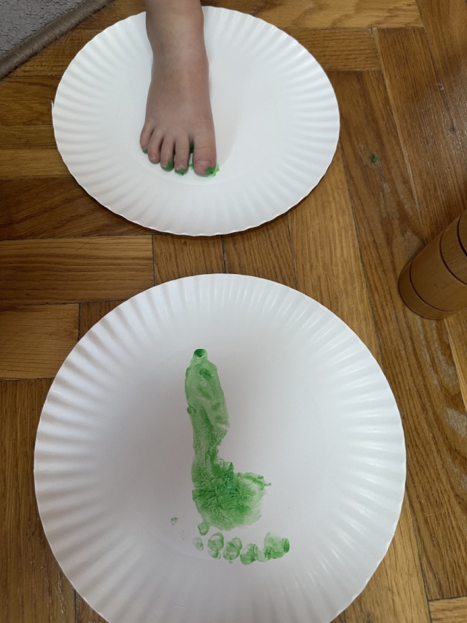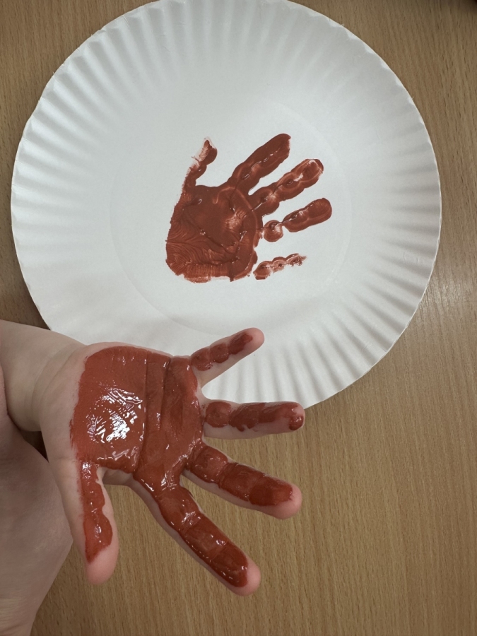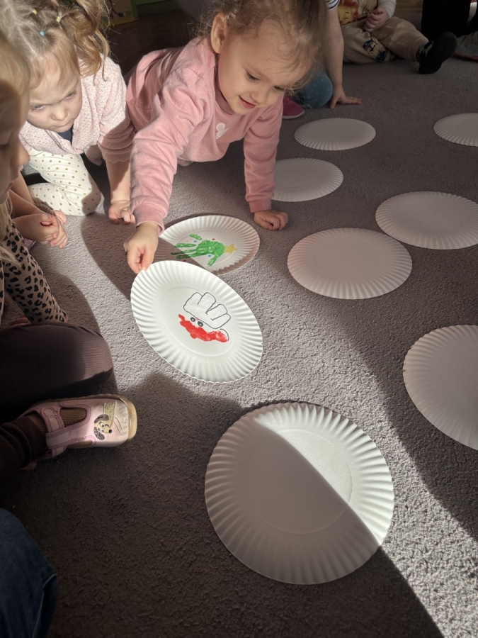 Najmłodsza grupa przedszkolna zdecydowała wziąć po raz kolejny udział w konkursie programu „Wszyscy grają-nikt się nie nudzi” w ramach kółka plastycznego. Tym razem zadanie polegało na stworzeniu talii kart do gry memory na świąteczny czas. Z ogromnym zaangażowaniem i zaciekawieniem powstawały odbicia dłoni i stóp, które po dodaniu flamastrowych detali tworzyły nietypowe karty świąteczne. Dodatkowo dzieci rozwijały wyobraźnię, nabierały nowych doświadczeń sensorycznych oraz utrwalały świadomość swojego ciała.