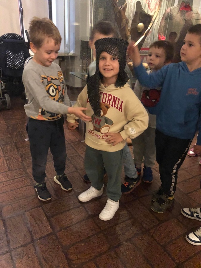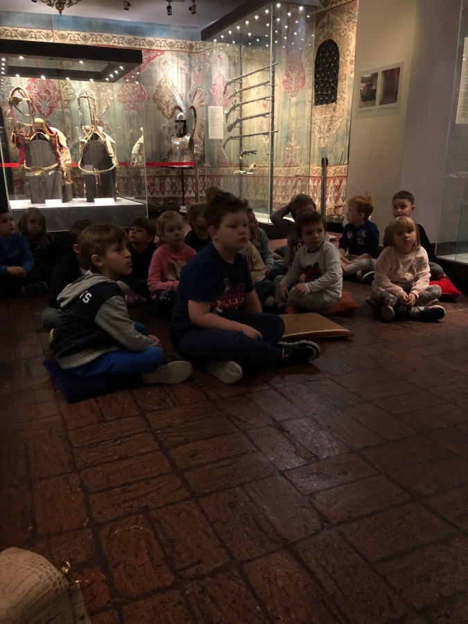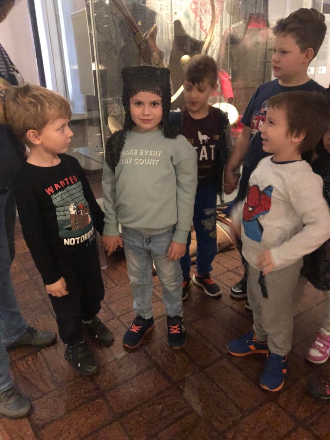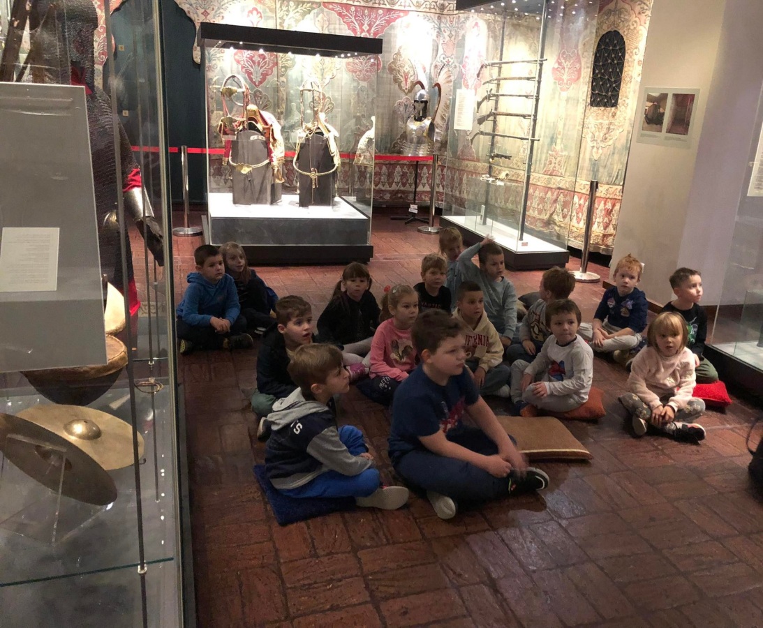 W dniu 06.10.2022 grupa VI wzięła udział w zajęciach edukacyjnych pt.” Zbrojownia” z cyklu lekcji muzealnych „Akademia pod maszkaronem” w Ratuszu. Miejsce w jakim odbywają się zajęcia pomogło przenieść się w czasy, kiedy rycerze jeździli na koniach i dzielnie walczyli mieczami. Mogliśmy zobaczyć repliki uzbrojenia oraz broni. Na koniec spotkania dzieci wykonały zadanie plastyczne. Dzięki zajęciom przedszkolaki poznały wiele ciekawostek oraz informacji związanych z rycerzami.