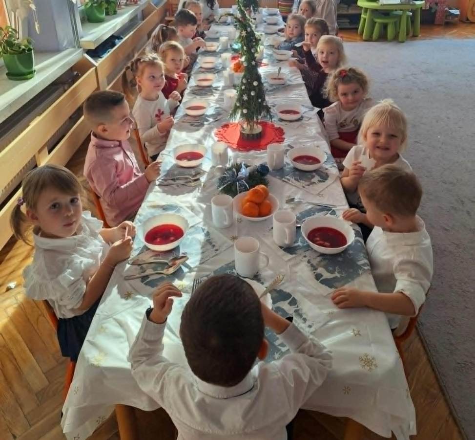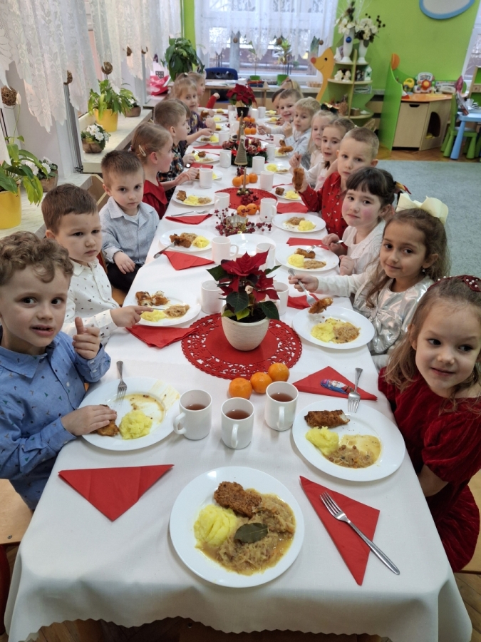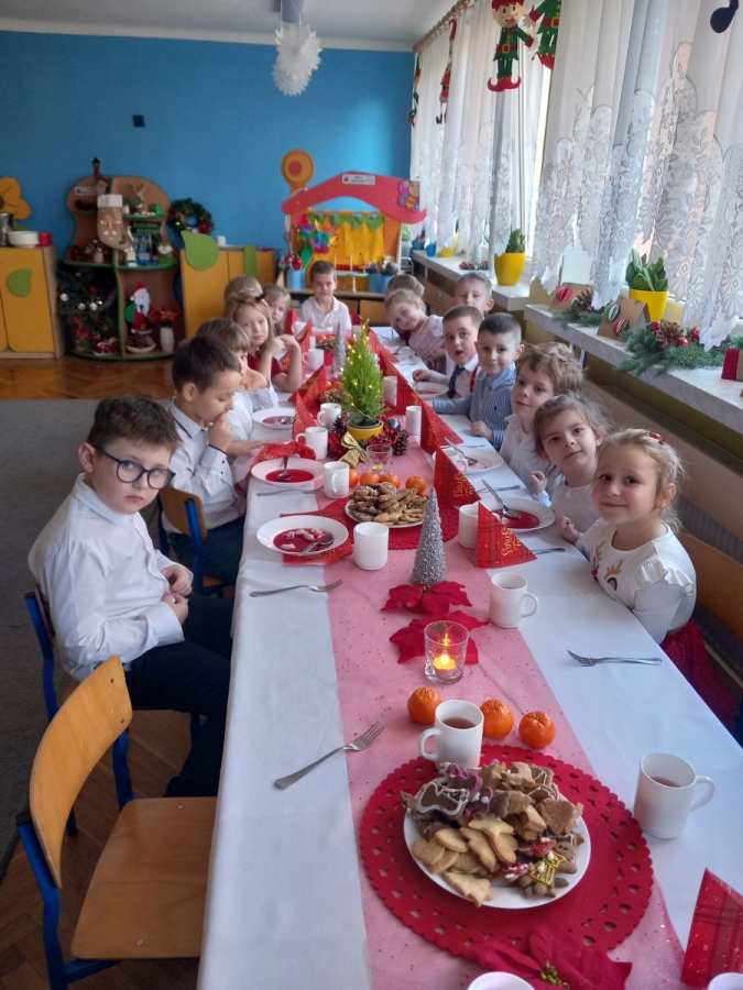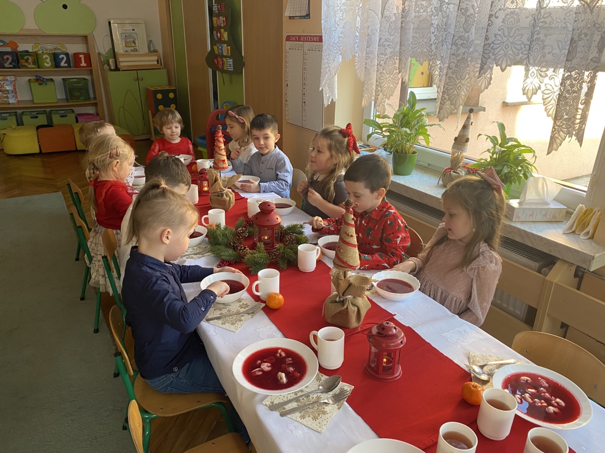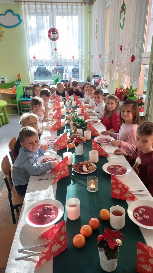 Jest taki dzień, bardzo ciepły, choć zimowy. Dzień, w którym spotkała się cała przedszkolna rodzina, aby przeżyć Wigilię zbliżających się Świąt. Tego dnia wspólne Kolędowanie, życzenia świąteczne, prezenty pod choinką towarzyszyły przedszkolakom. Finałem był obiad wigilijny przy pięknie udekorowanych stołach.