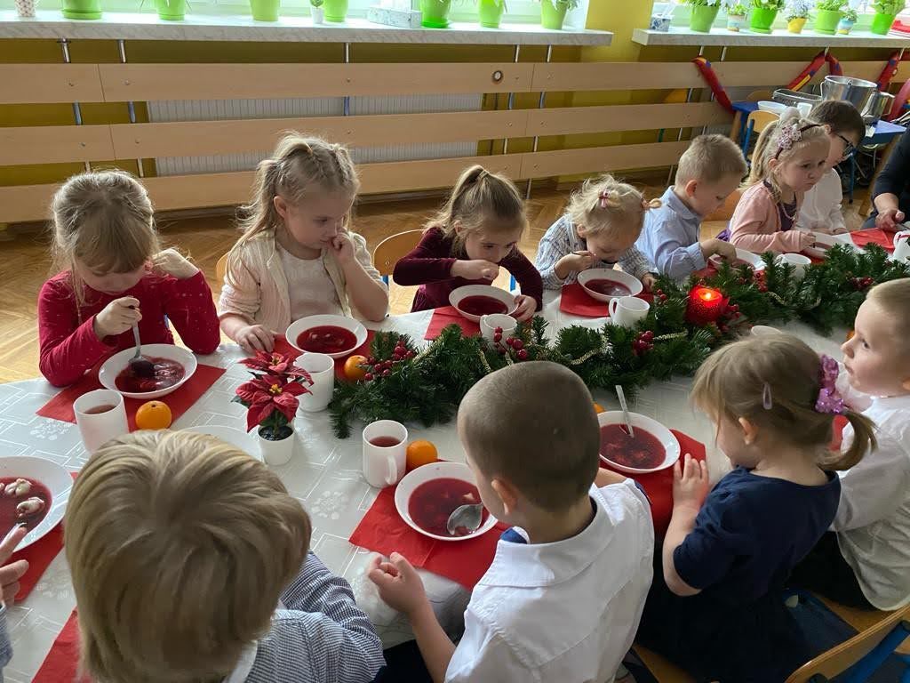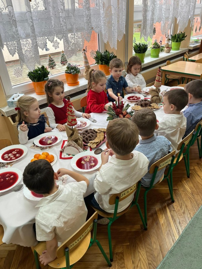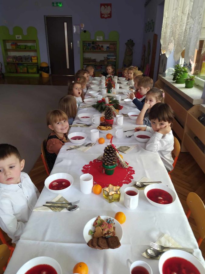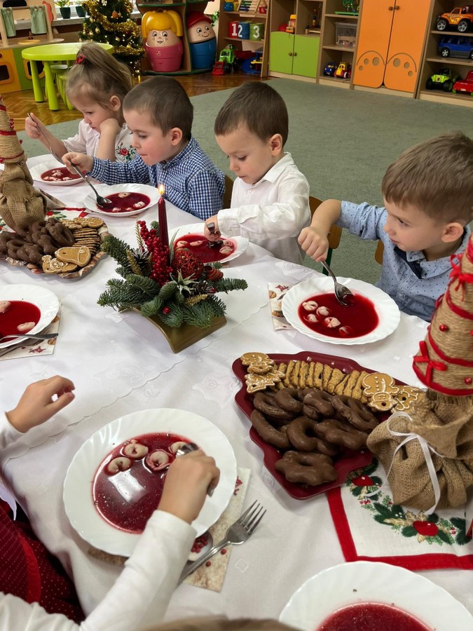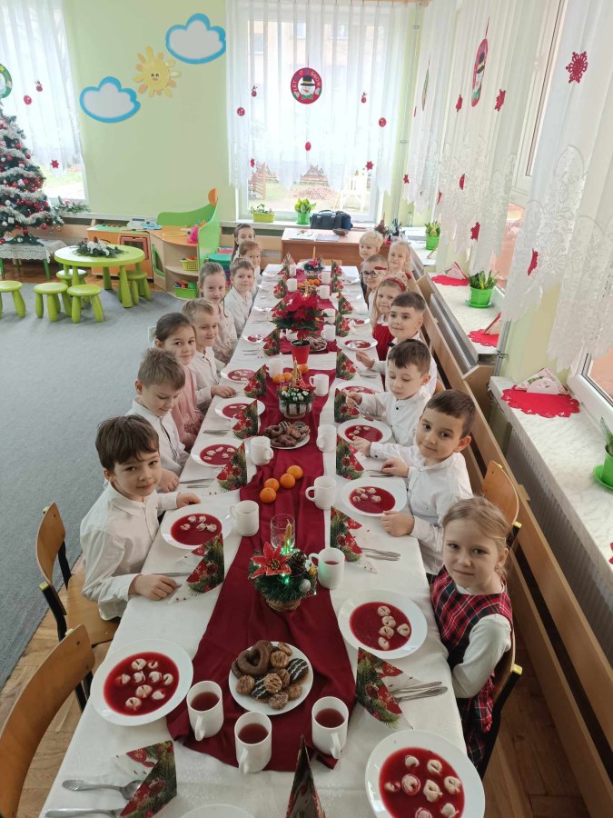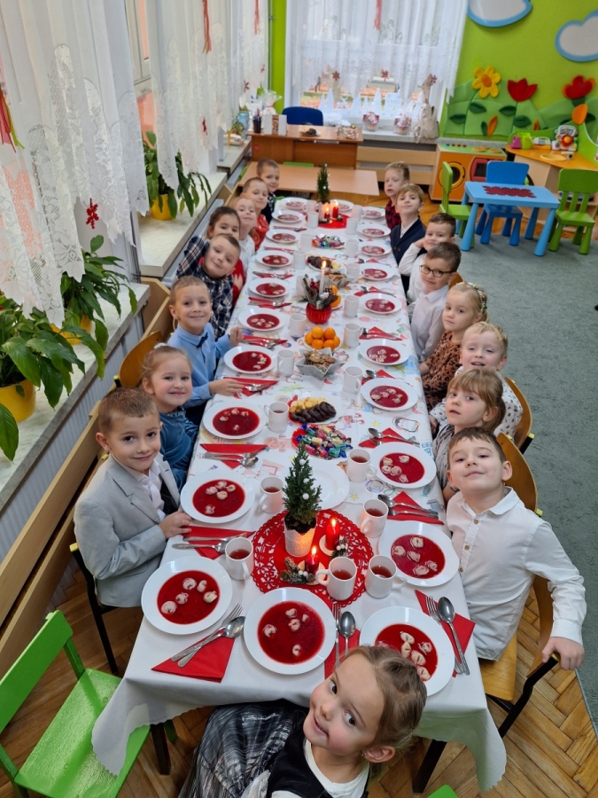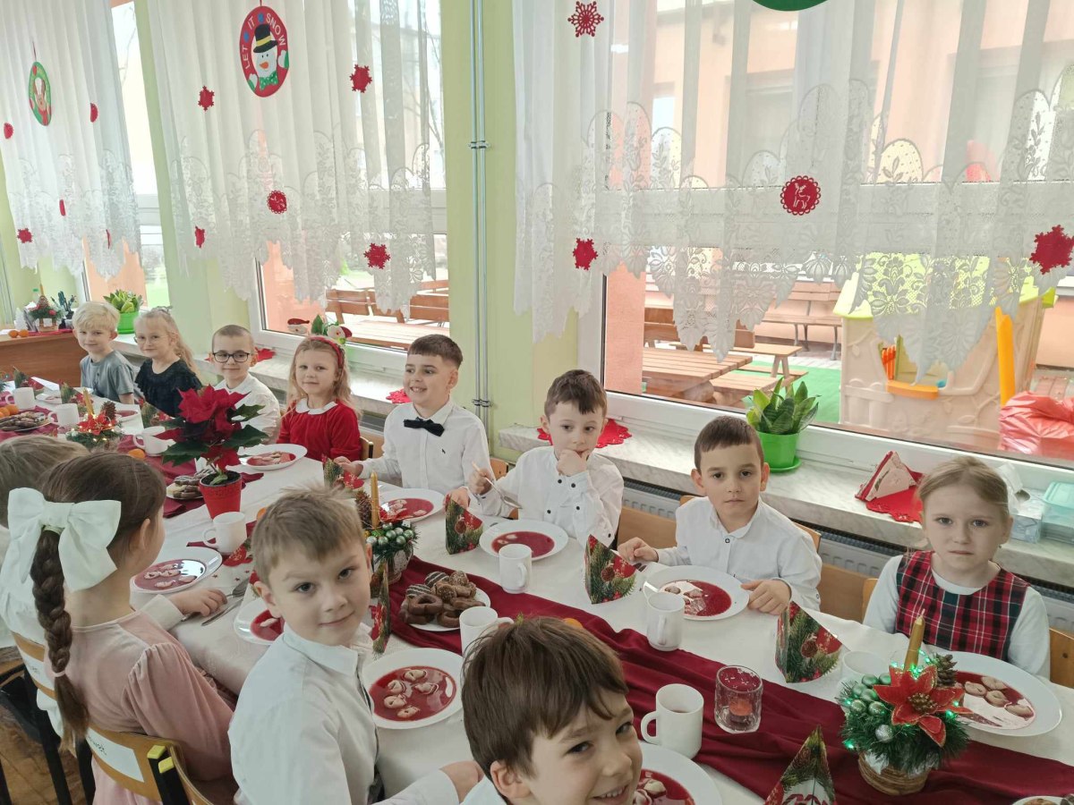 Jest taki dzień tylko jeden raz do roku to Wigilia Świąt Bożego Narodzenia. Jest jednym z najpiękniejszych dni w roku. W naszym przedszkolu 15 grudnia już od rana słychać było kolędy. Bo właśnie w tym dniu cała społeczność uczestniczyła w spotkaniu wigilijnym. Najpierw był wspaniały występ, który przygotowała grupa IV. Potem wspólnie zaśpiewaliśmy kolędę. Pani dyrektor złożyła wszystkim życzenia świąteczne. Następnie przedszkolaki w swoich grupach łamały się opłatkiem i przy pięknie udekorowanych stołach zasiadły do wigilijnego obiadu. Atmosfera była świąteczna, pełna nadziei, życzliwości, czuć było magię i radość.
