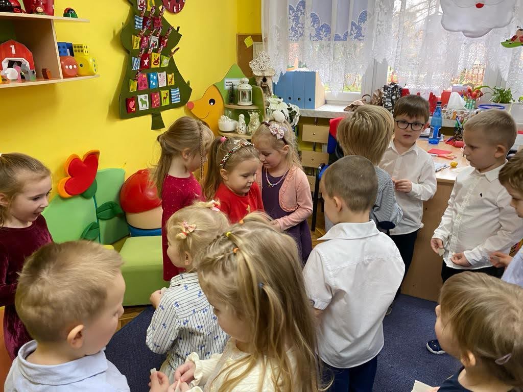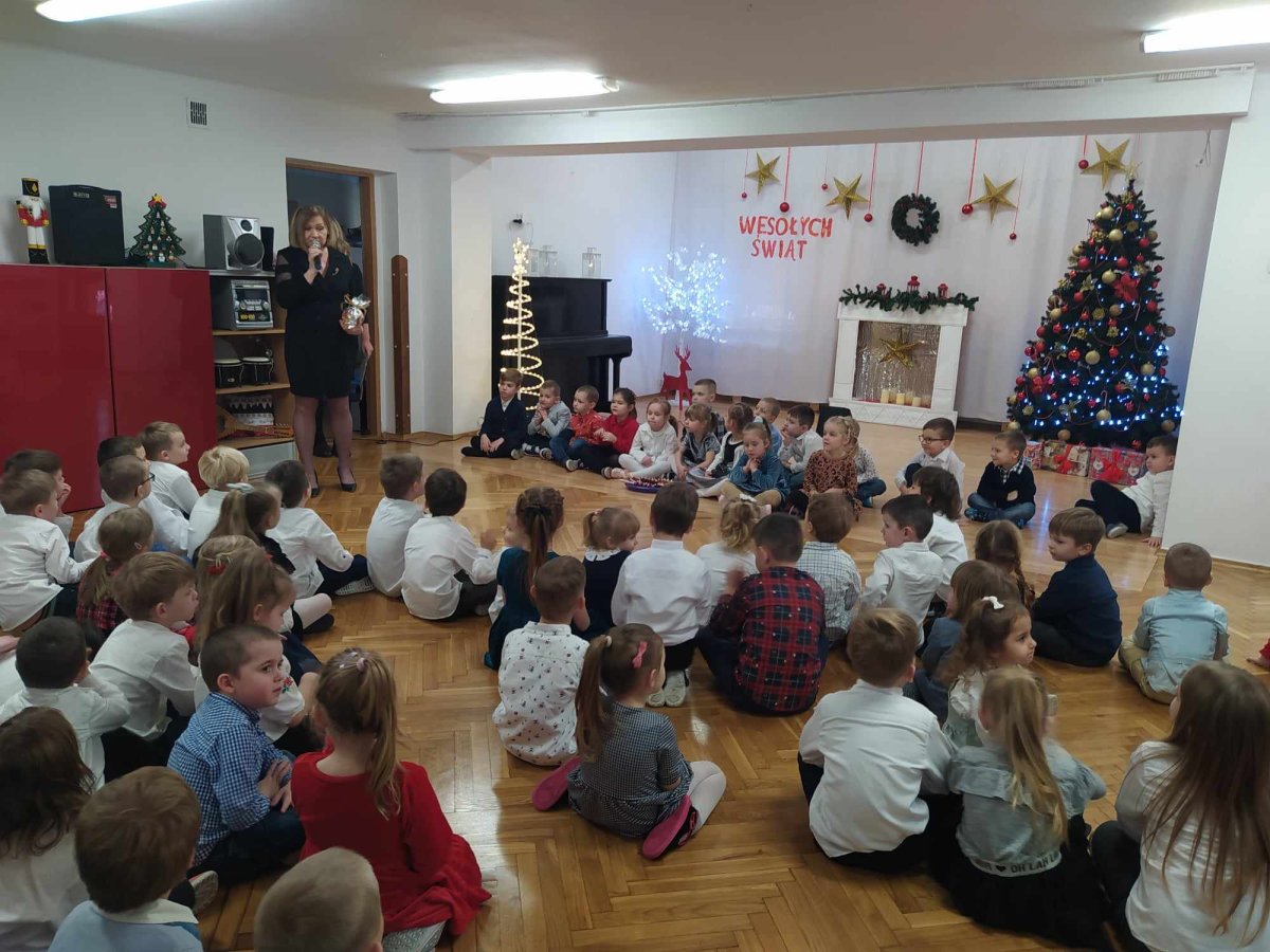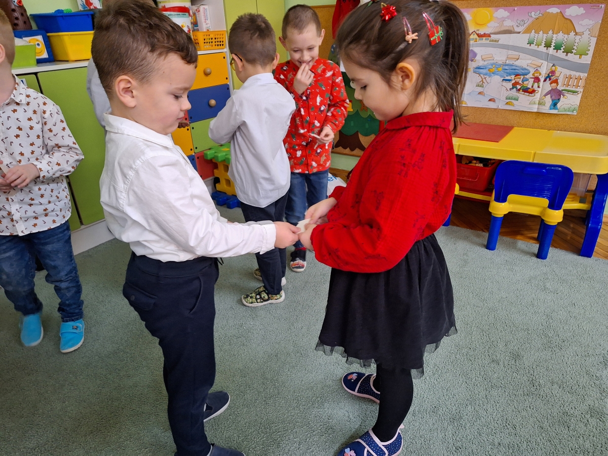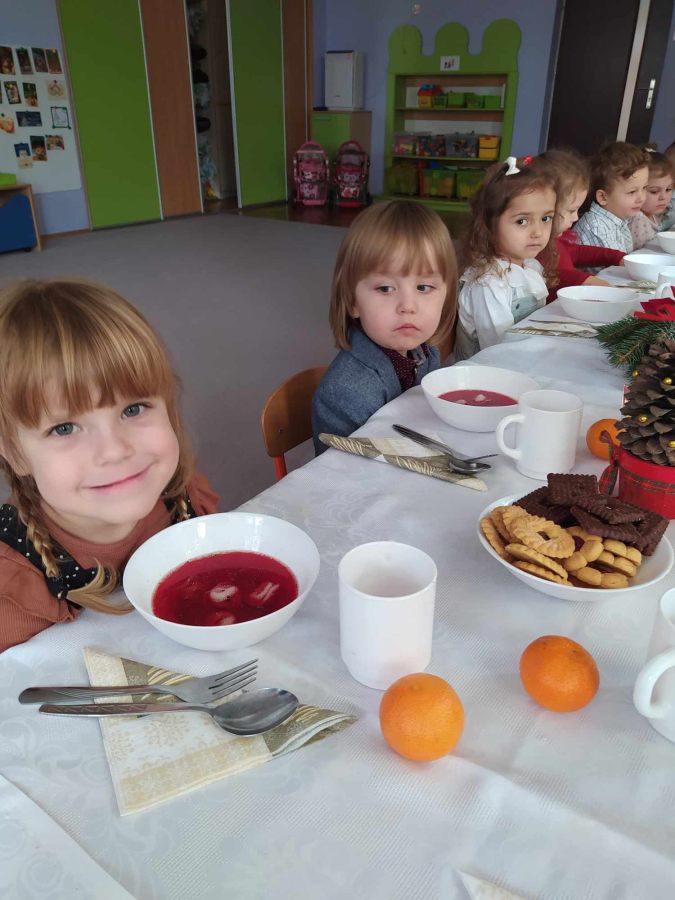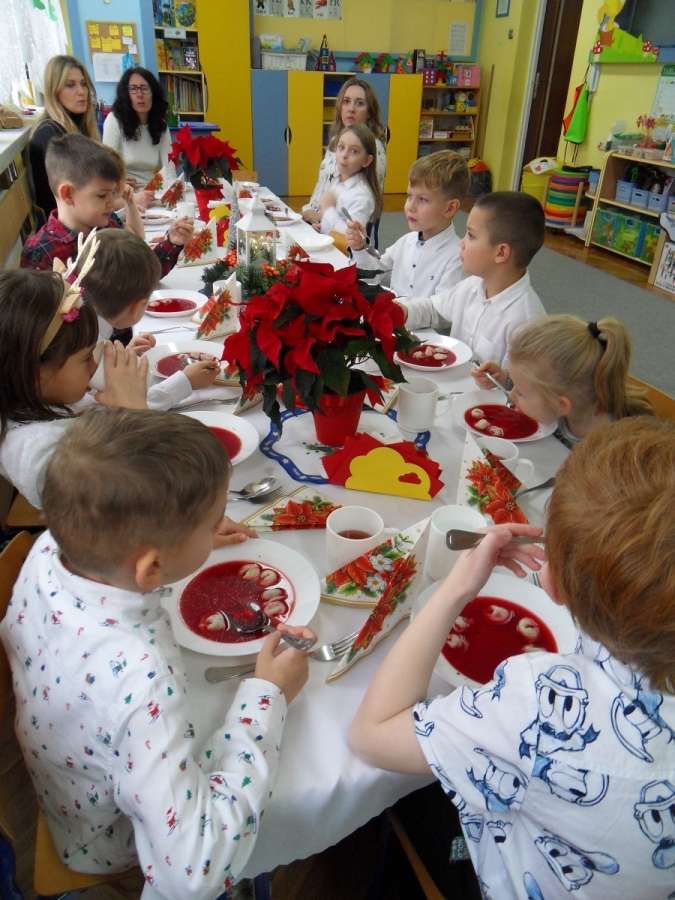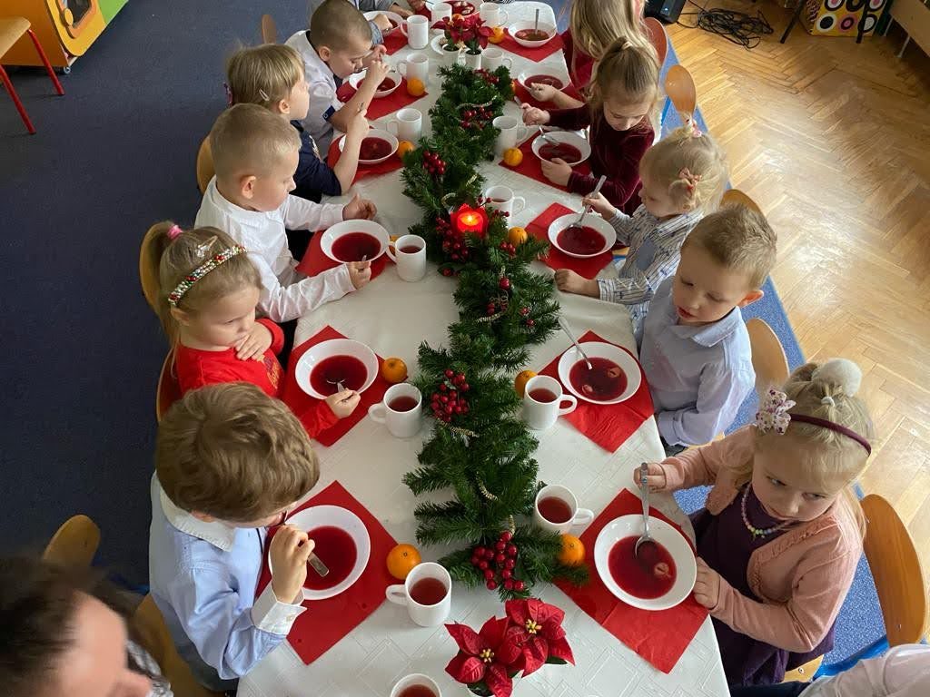 Jest taki dzień tylko jeden raz do roku to Wigilia Świąt Bożego Narodzenia. Jest jednym z najpiękniejszych dni w roku. W naszym przedszkolu 15 grudnia już od rana słychać było kolędy. Bo właśnie w tym dniu cała społeczność uczestniczyła w spotkaniu wigilijnym. Najpierw był wspaniały występ, który przygotowała grupa IV. Potem wspólnie zaśpiewaliśmy kolędę. Pani dyrektor złożyła wszystkim życzenia świąteczne. Następnie przedszkolaki w swoich grupach łamały się opłatkiem i przy pięknie udekorowanych stołach zasiadły do wigilijnego obiadu. Atmosfera była świąteczna, pełna nadziei, życzliwości, czuć było magię i radość.