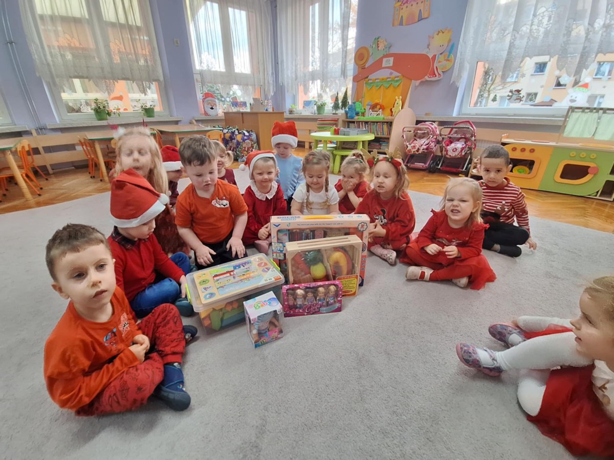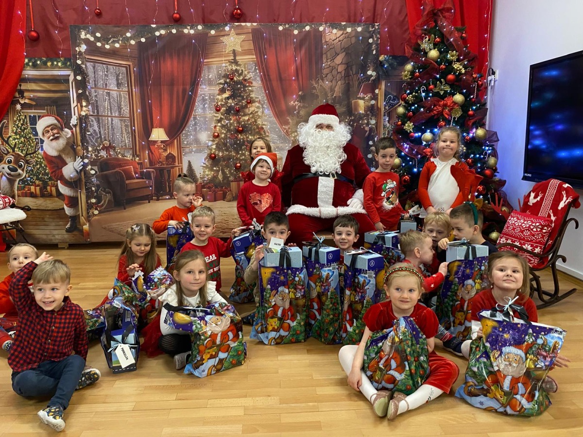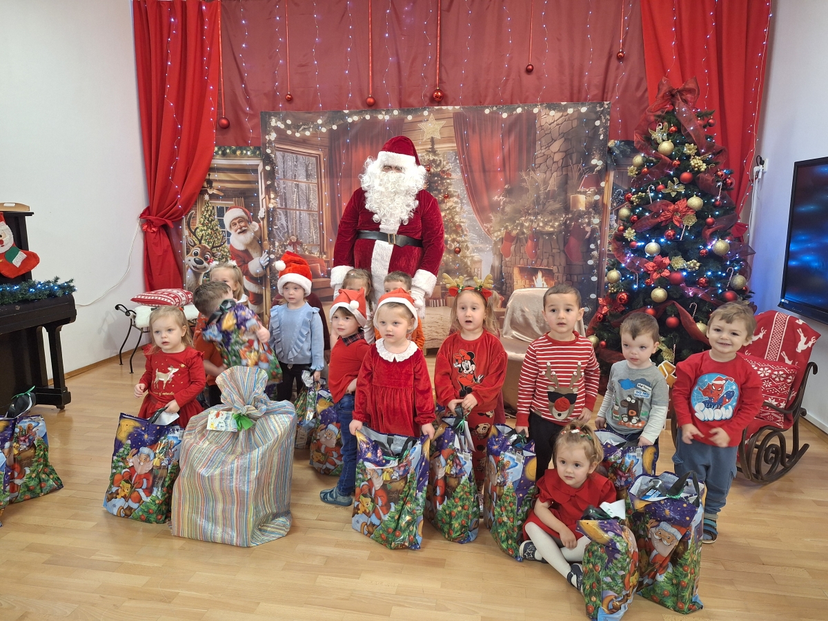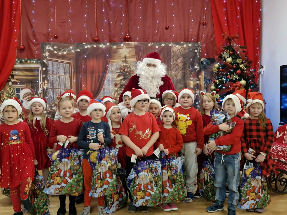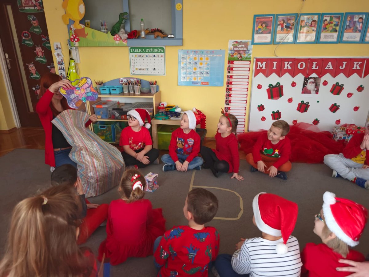 Dziś w naszym przedszkolu pojawił się wyjątkowy gość – Święty Mikołaj. Dzieci powitały go z wielką radością, a na ich twarzach widać było ogromne emocje i podekscytowanie. Przedszkolaki zaśpiewały dla Mikołaja przygotowane piosenki i zaprosiły go do wspólnego tańca. W sali panowała radosna, świąteczna atmosfera. Na koniec wszystkie dzieci z niecierpliwością doczekały się upragnionych prezentów, które Mikołaj wręczał każdemu z uśmiechem. To był dzień pełen niezapomnianych chwil.