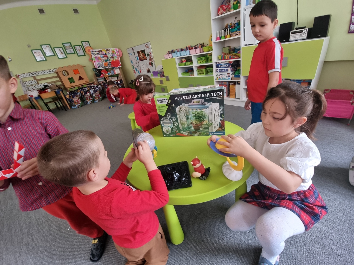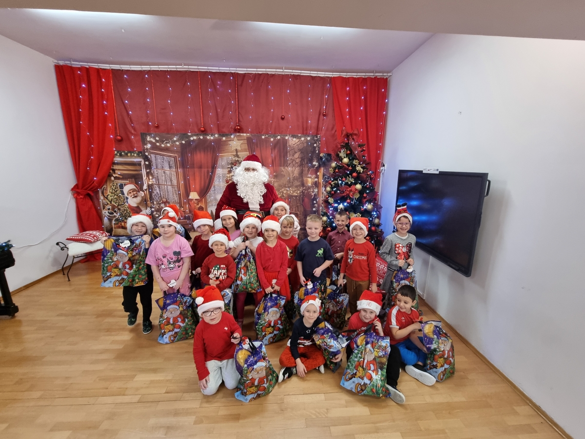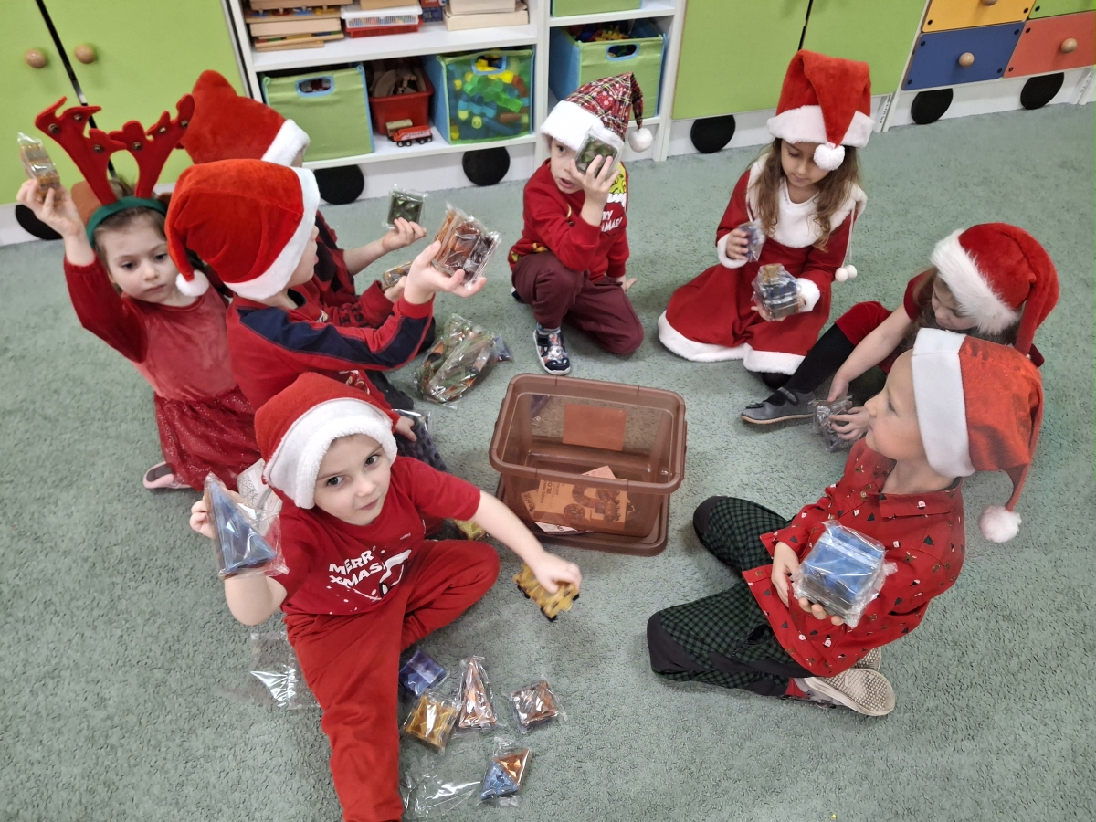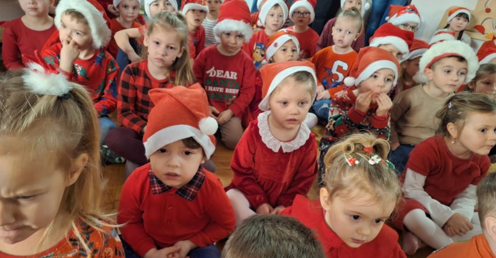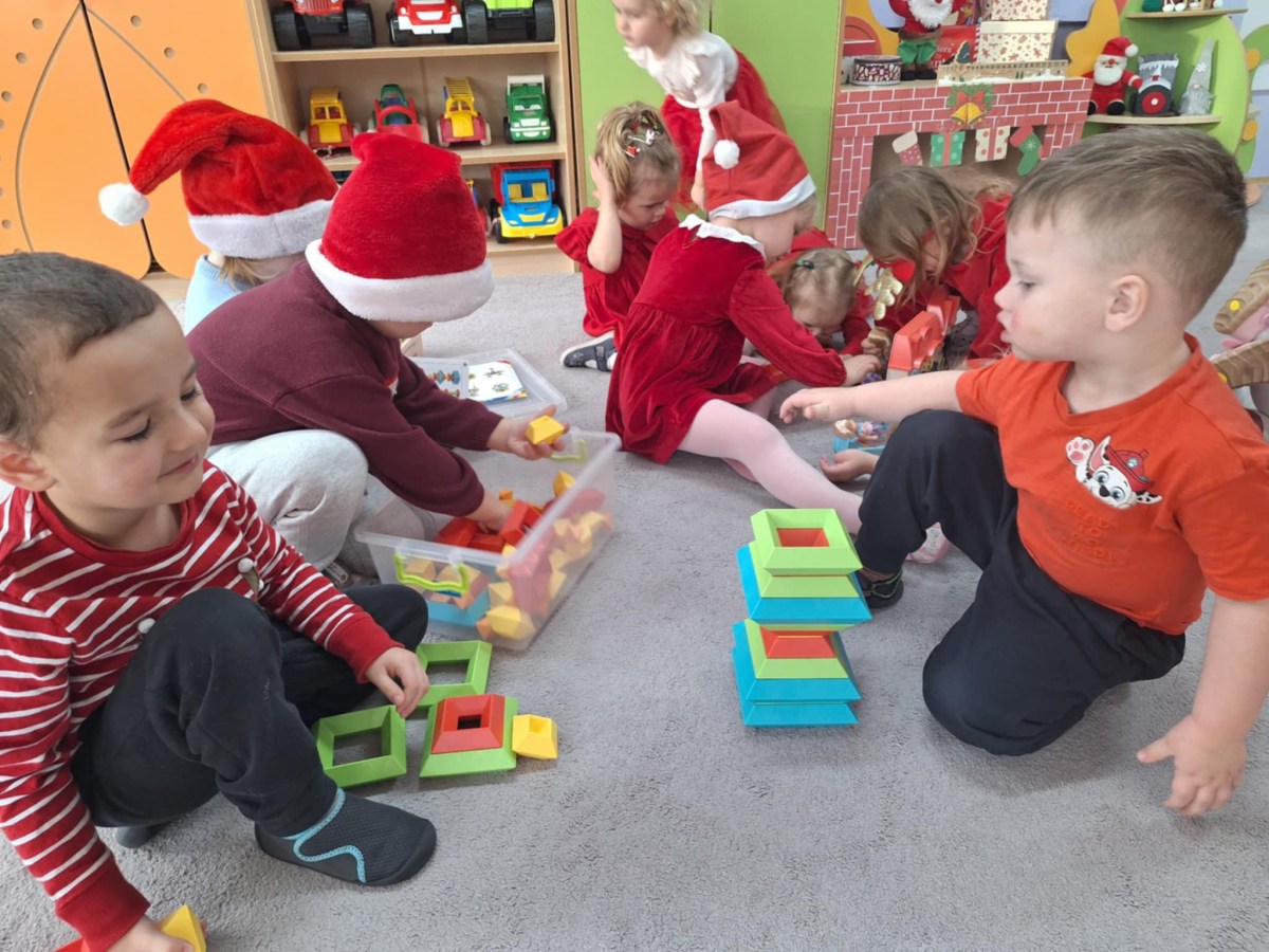 Dziś w naszym przedszkolu pojawił się wyjątkowy gość – Święty Mikołaj. Dzieci powitały go z wielką radością, a na ich twarzach widać było ogromne emocje i podekscytowanie. Przedszkolaki zaśpiewały dla Mikołaja przygotowane piosenki i zaprosiły go do wspólnego tańca. W sali panowała radosna, świąteczna atmosfera. Na koniec wszystkie dzieci z niecierpliwością doczekały się upragnionych prezentów, które Mikołaj wręczał każdemu z uśmiechem. To był dzień pełen niezapomnianych chwil.