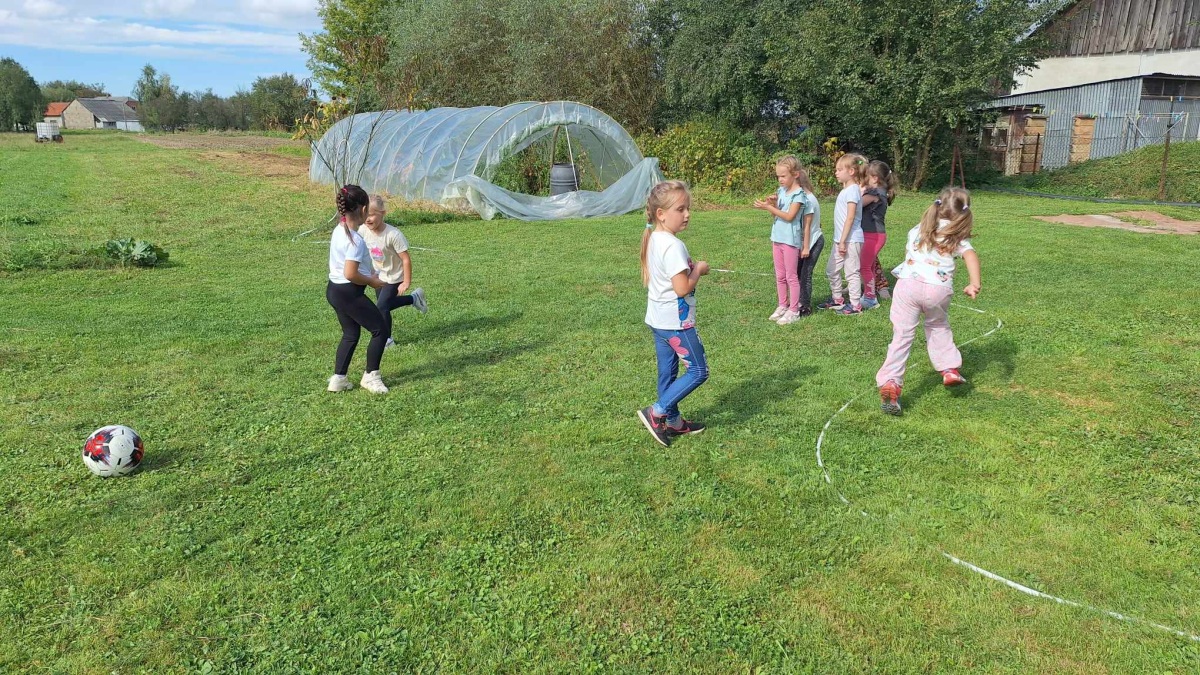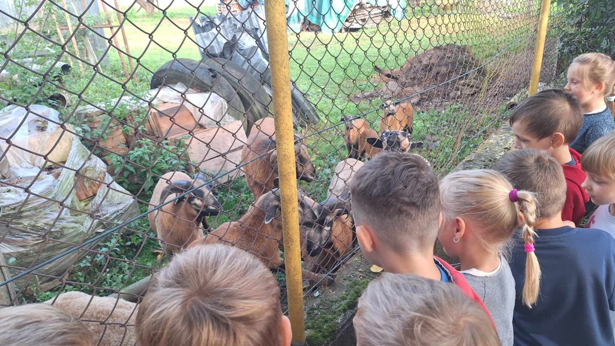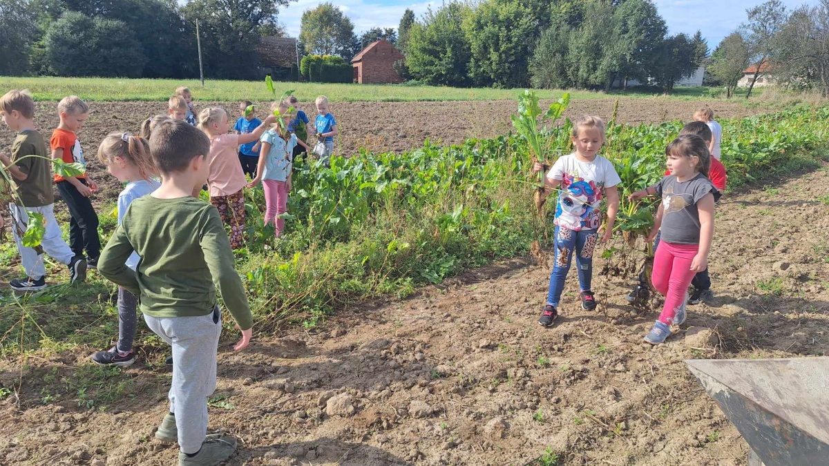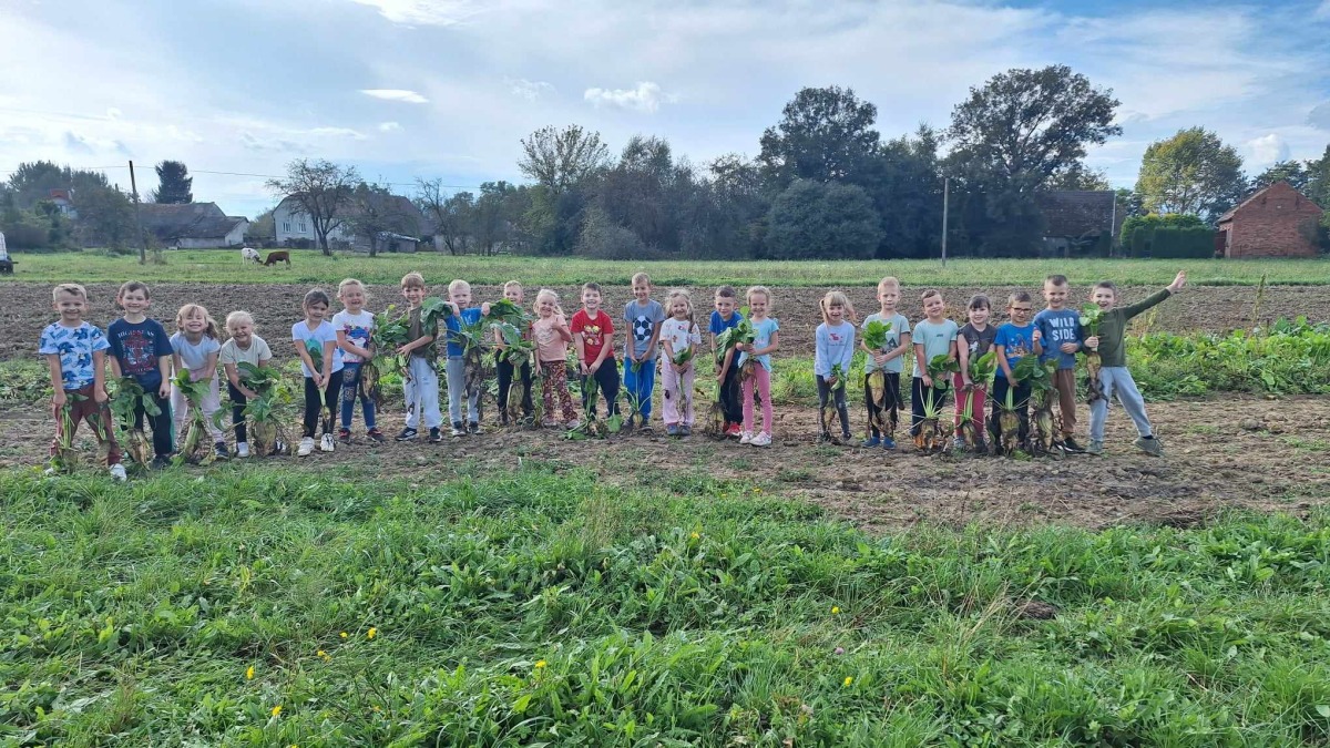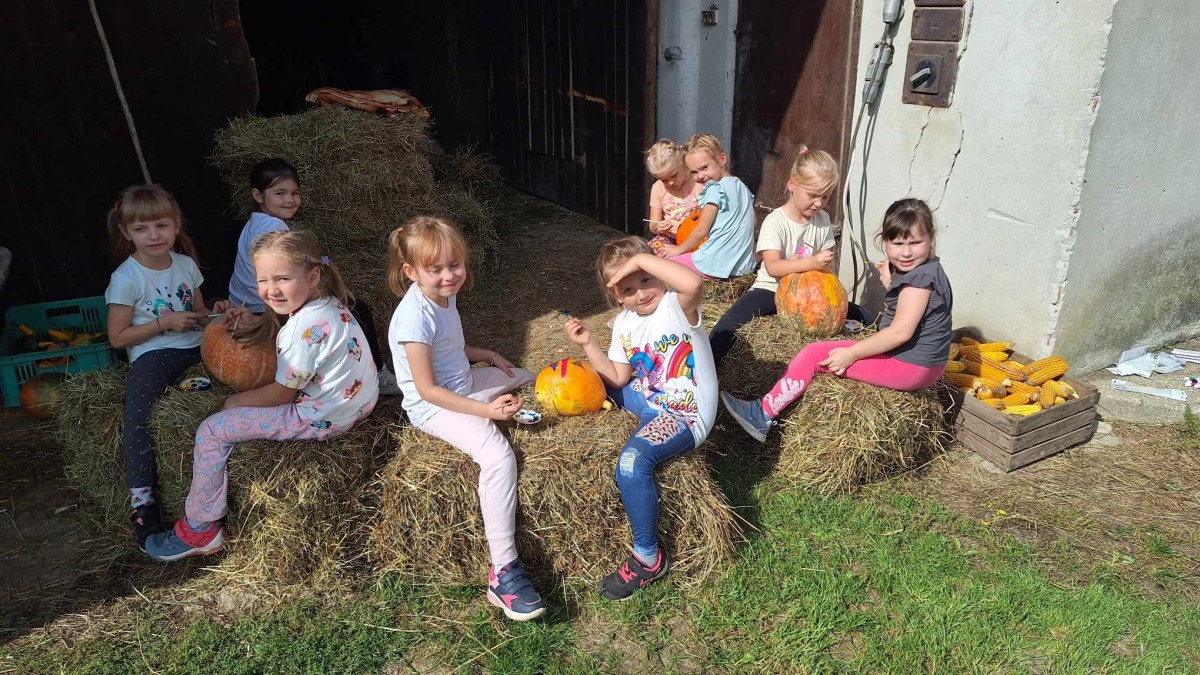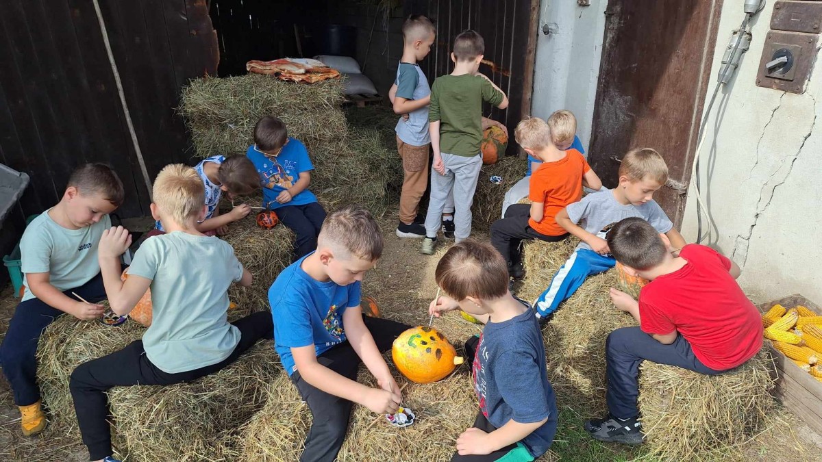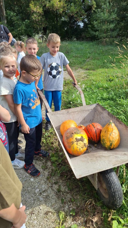 Na zaproszenie naszego kolegi Olka i jego Dziadziusia pojechaliśmy na wspaniałą wycieczkę. Odwiedziliśmy piękne gospodarstwo na wsi, poznaliśmy i karmiliśmy wszelkie zwierzątka (barany kameruńskie, króliki, krowy, byki, kaczki i kury). Wykopywaliśmy buraki, jeździliśmy taczkami, byliśmy na polu pełnym dyń. Graliśmy w piłkę, chowaliśmy się w bazie na drzewie, łupaliśmy orzechy laskowe kamieniami! A na koniec malowaliśmy farbami piękne okazy dyń, które można podziwiać w naszej szatni. Na zakończenie, podczas wsiadania do autokaru Pan Dziadziuś wręczył każdemu odznakę “SUPER FARMERA”