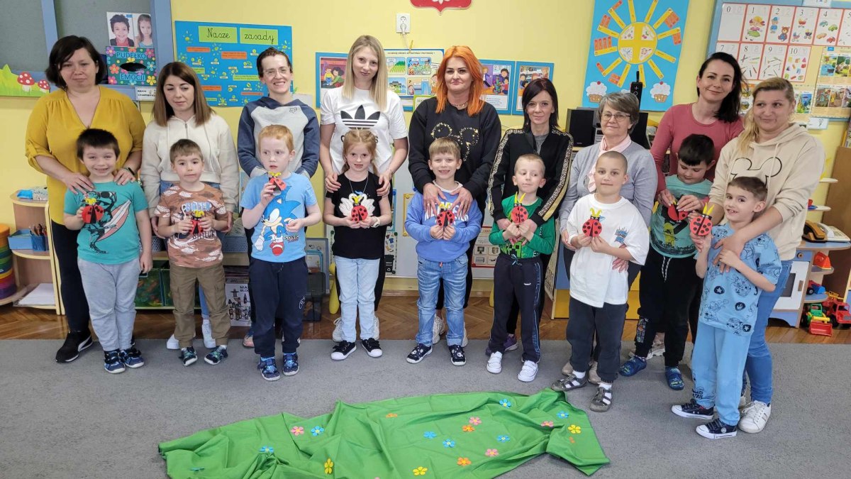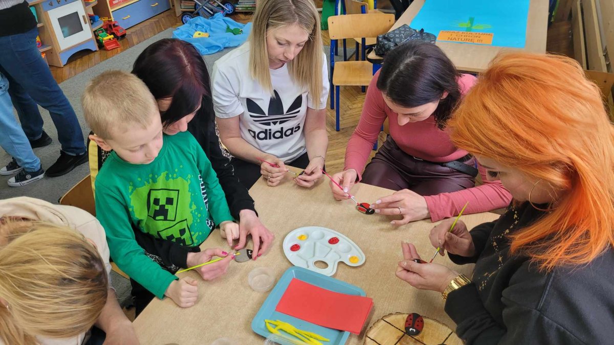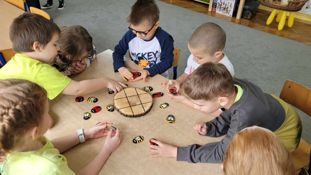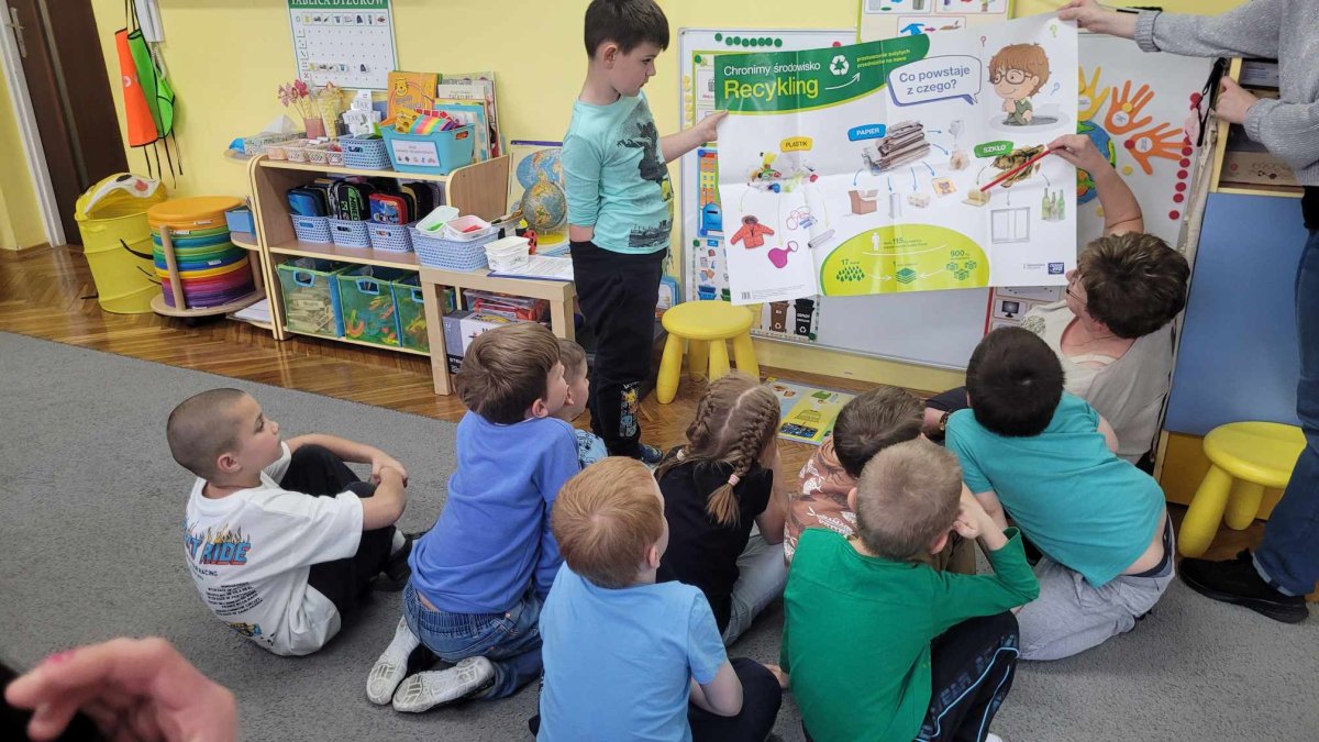 Podczas zabaw z Rodzicami dzieci utrwaliły sobie wiadomości dotyczące segregowania odpadów i możliwości ich ponownego przetwarzania na nowe przedmioty. Wspólnie przypomnieliśmy sobie zasady dbania o nasze najbliższe środowisko. Na zakończenie dzieci razem z Rodzicami zrobiły EKO -ZABAWKĘ z rurki po papierze toaletowym- “Szczęśliwą Biedronkę “, a z pomalowanych farbami kamyków biedronki i pszczółki do EKO – GRY – “Na łące”. Wszystkim Rodzicom DZIĘKUJEMY !!! za wspólną, wesołą zabawę”.