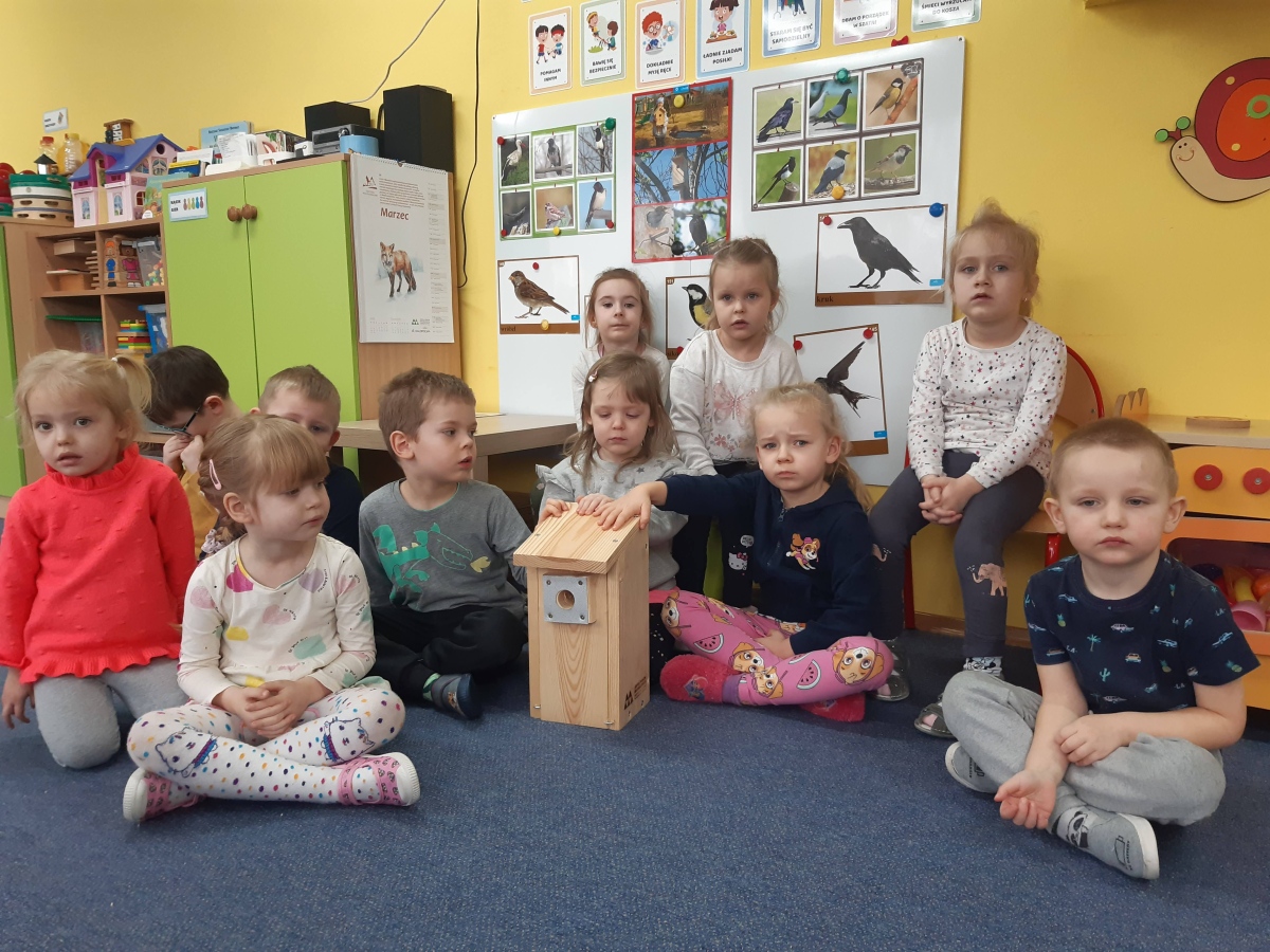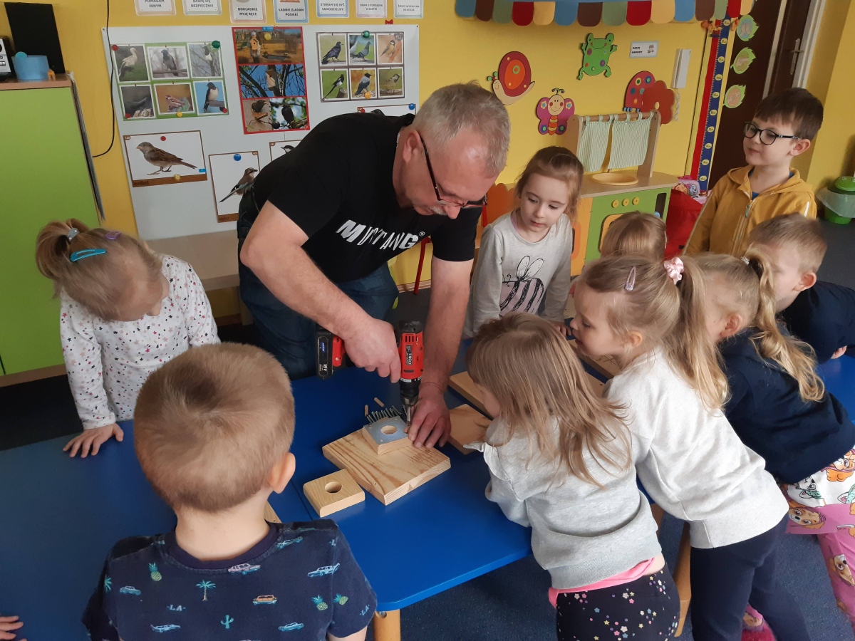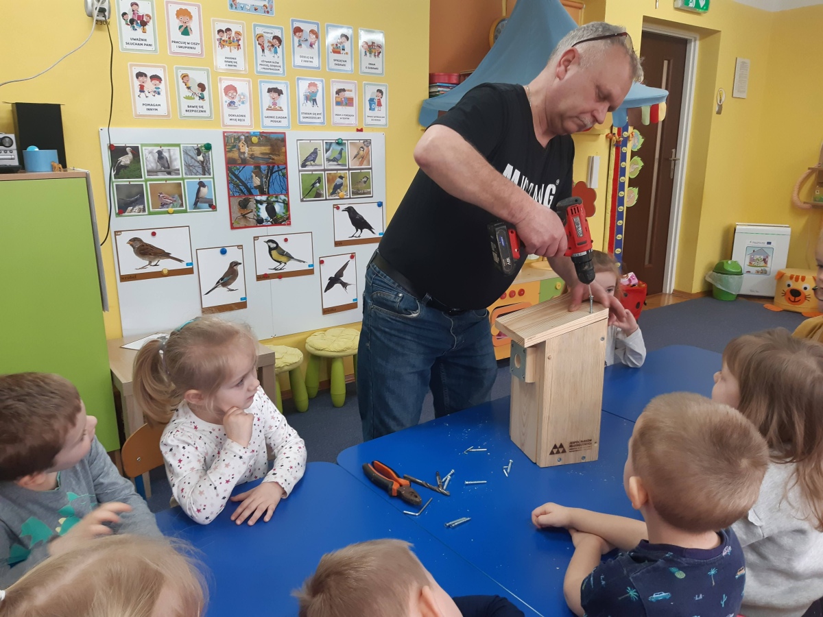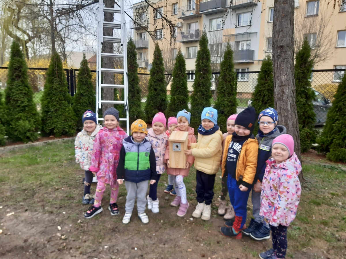 W dniu 04.03.2024 dzieci z gr III Biedronki wykonały z pomocą pań i pana konserwatora budkę lęgową dla sikorki, w ramach konkursu „Zaprośmy ptaki do Tarnowa”. Dzieci na wstępie zapoznały się z różnymi gatunkami ptaków, które zamieszkują Polskę , jak również nasze miasto Tarnów, na podstawie filmu edukacyjnego „Ptaki polskie”. W kolejnej części dzieci brały udział w wykonaniu budki lęgowej – zapoznały się z etapem wykonywania, z jakich materiałów powinna być wykonana oraz brały czynny udział w wykonaniu domku dla sikorki. Następnie wspólnie wybraliśmy miejsce w ogrodzie przedszkolnym, w którym zamontowana została budka lęgowa. Dzieci z ogromnym zaangażowaniem obserwowały ptaki w ogrodzie, które zainteresowały się nowym domkiem.