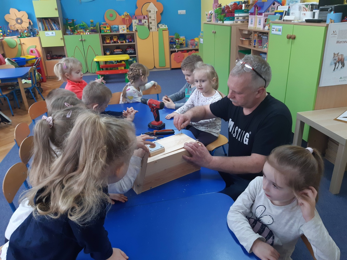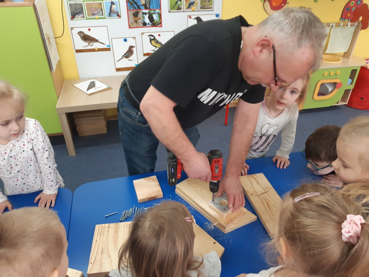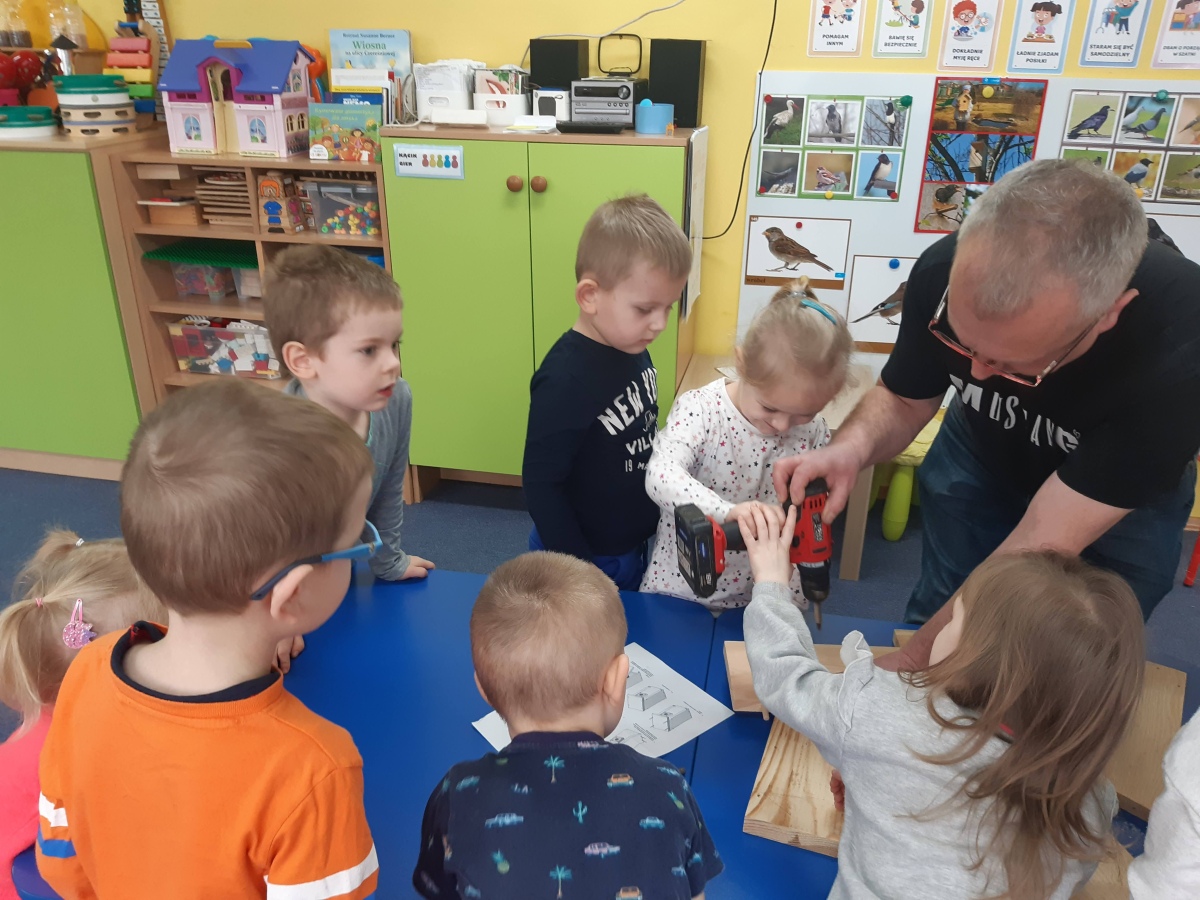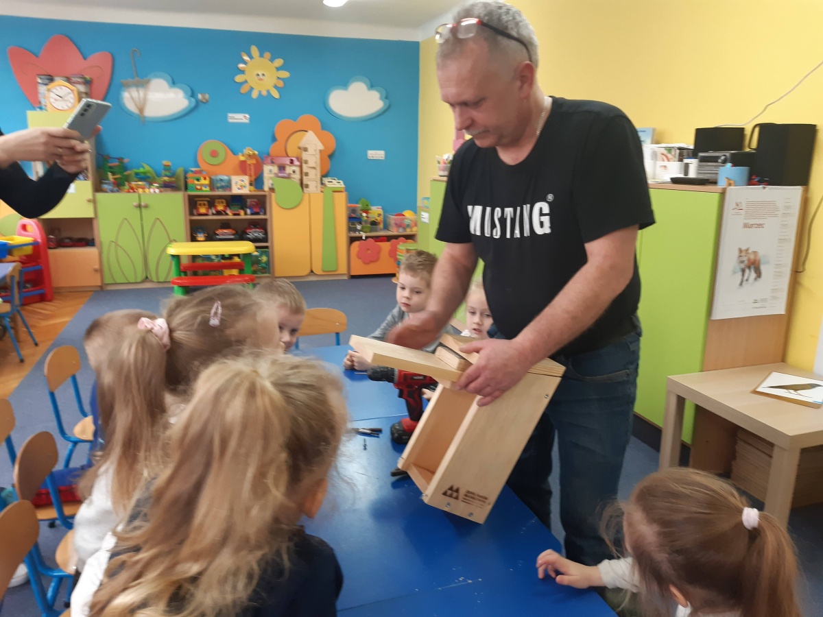 W dniu 04.03.2024 dzieci z gr III Biedronki wykonały z pomocą pań i pana konserwatora budkę lęgową dla sikorki, w ramach konkursu „Zaprośmy ptaki do Tarnowa”. Dzieci na wstępie zapoznały się z różnymi gatunkami ptaków, które zamieszkują Polskę , jak również nasze miasto Tarnów, na podstawie filmu edukacyjnego „Ptaki polskie”. W kolejnej części dzieci brały udział w wykonaniu budki lęgowej – zapoznały się z etapem wykonywania, z jakich materiałów powinna być wykonana oraz brały czynny udział w wykonaniu domku dla sikorki. Następnie wspólnie wybraliśmy miejsce w ogrodzie przedszkolnym, w którym zamontowana została budka lęgowa. Dzieci z ogromnym zaangażowaniem obserwowały ptaki w ogrodzie, które zainteresowały się nowym domkiem.