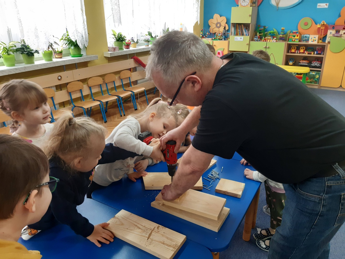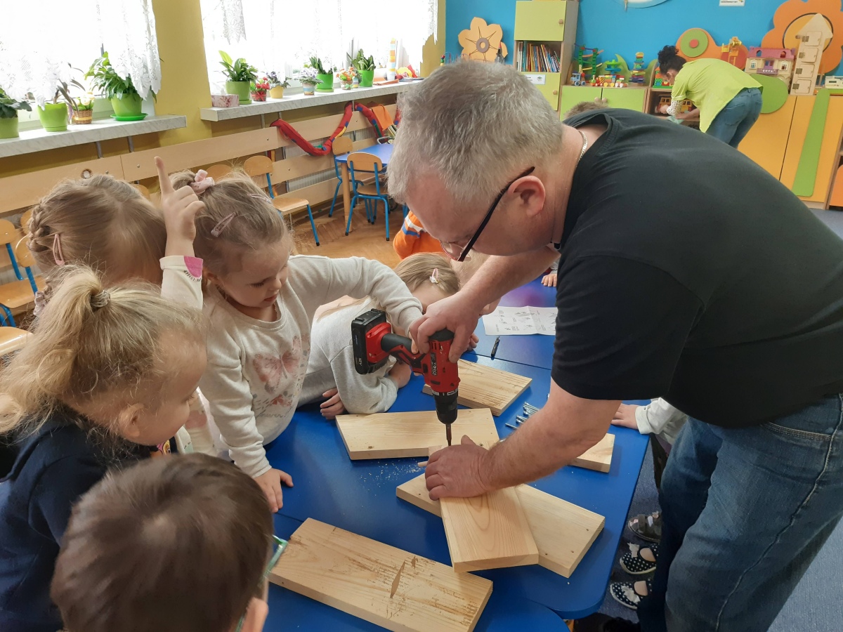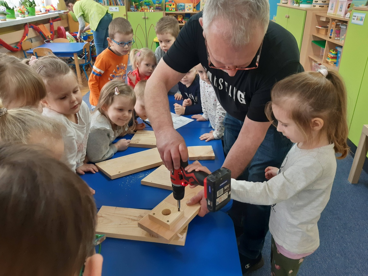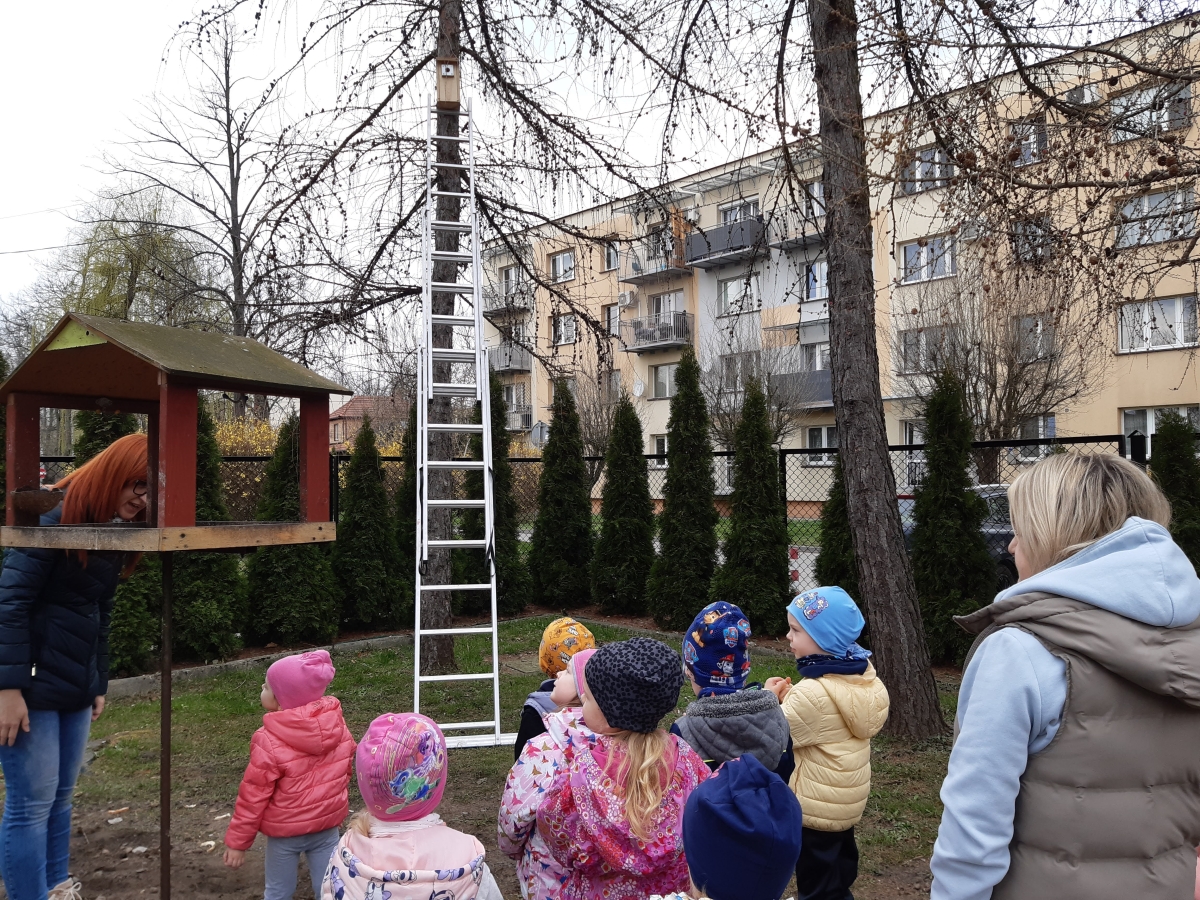 W dniu 04.03.2024 dzieci z gr III Biedronki wykonały z pomocą pań i pana konserwatora budkę lęgową dla sikorki, w ramach konkursu „Zaprośmy ptaki do Tarnowa”. Dzieci na wstępie zapoznały się z różnymi gatunkami ptaków, które zamieszkują Polskę , jak również nasze miasto Tarnów, na podstawie filmu edukacyjnego „Ptaki polskie”. W kolejnej części dzieci brały udział w wykonaniu budki lęgowej – zapoznały się z etapem wykonywania, z jakich materiałów powinna być wykonana oraz brały czynny udział w wykonaniu domku dla sikorki. Następnie wspólnie wybraliśmy miejsce w ogrodzie przedszkolnym, w którym zamontowana została budka lęgowa. Dzieci z ogromnym zaangażowaniem obserwowały ptaki w ogrodzie, które zainteresowały się nowym domkiem.