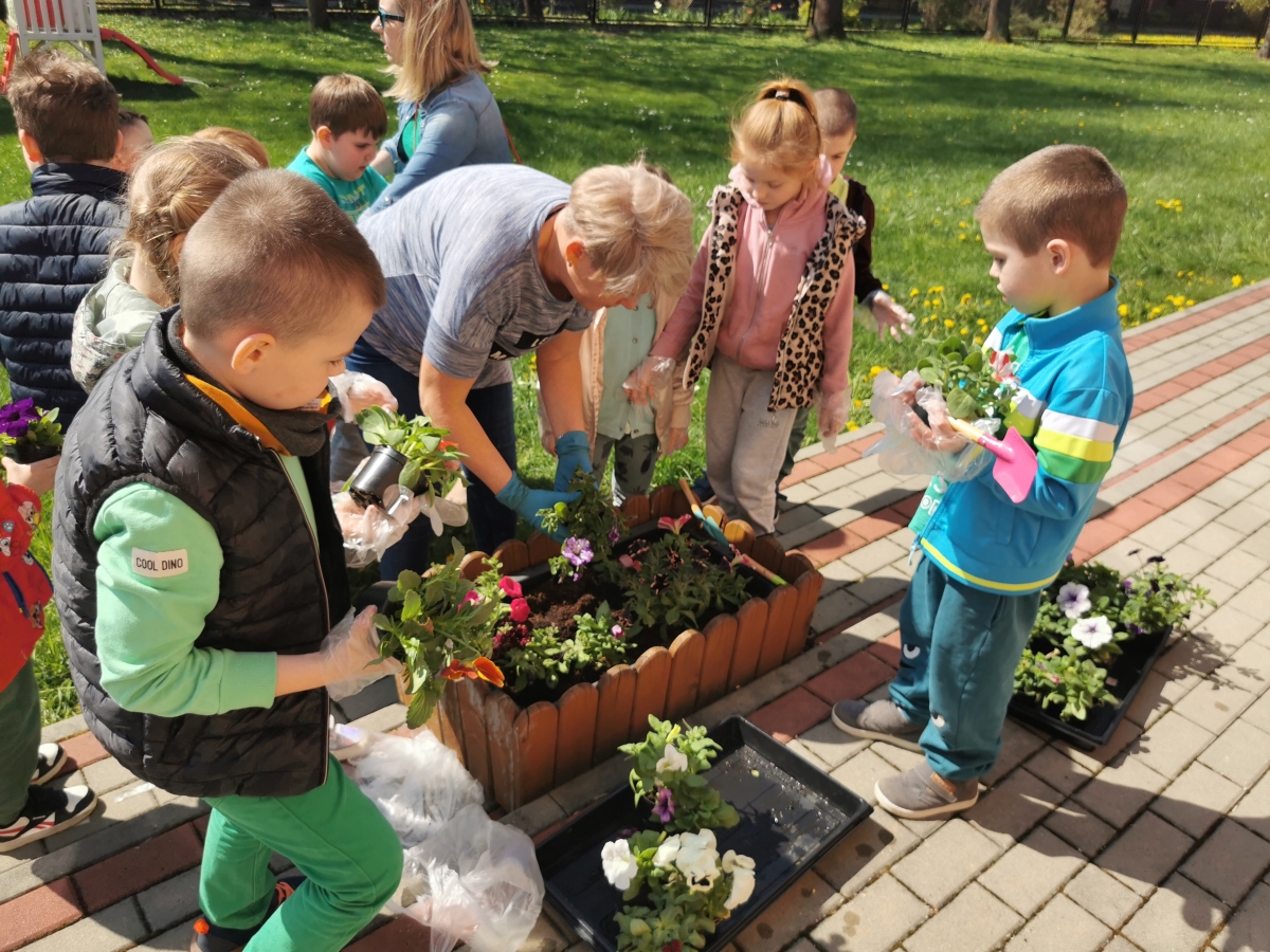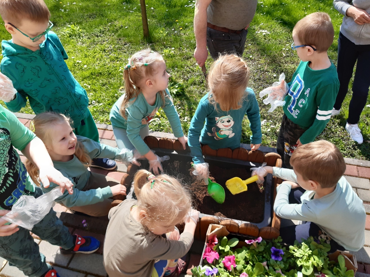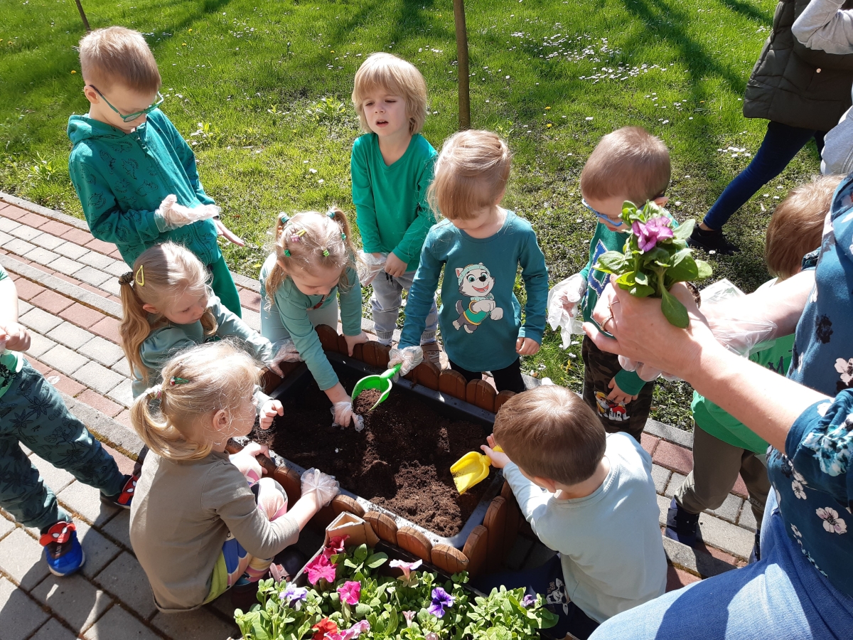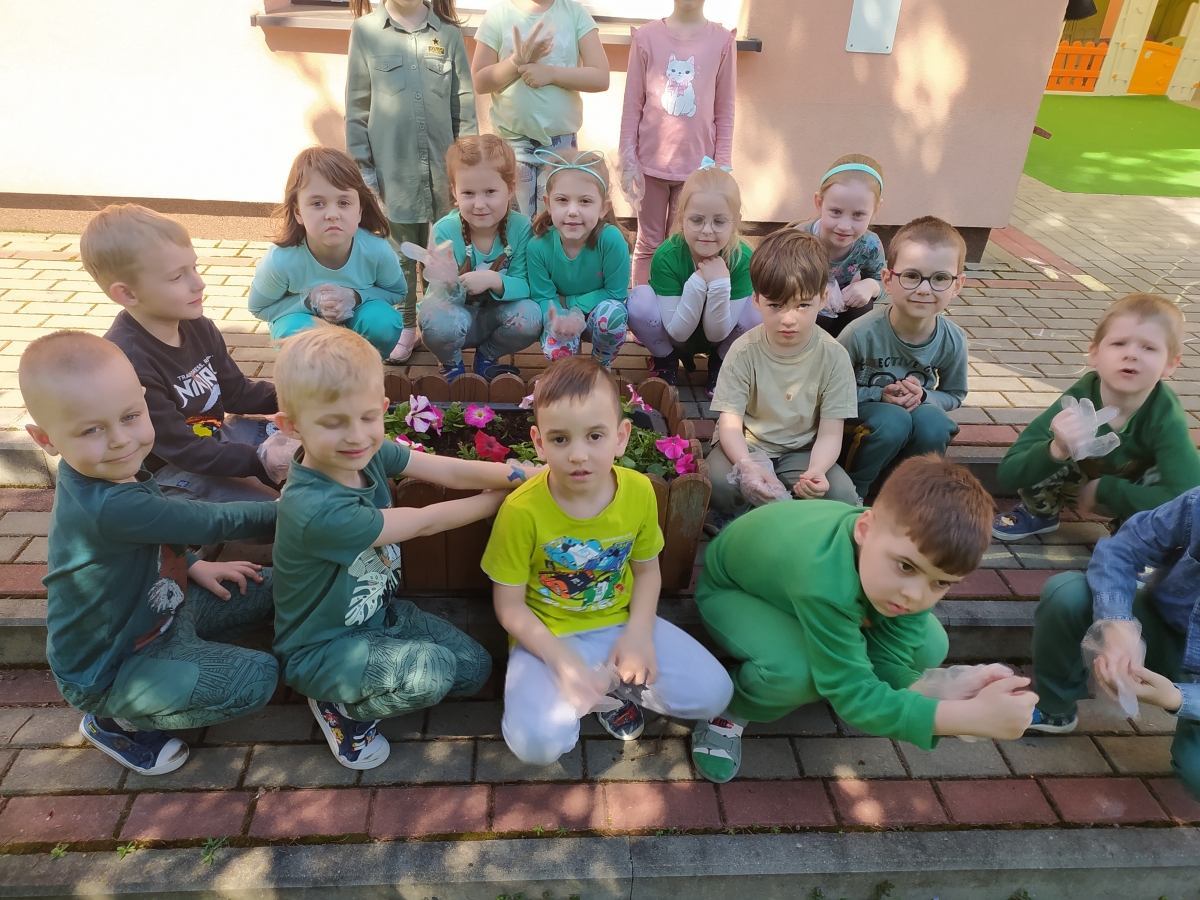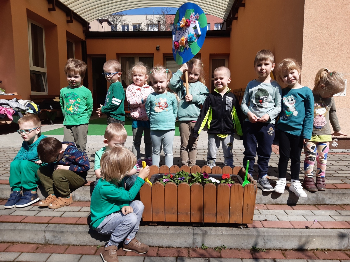 21 kwietnia w naszym przedszkolu obchodziliśmy Międzynarodowy Dzień Ziemi. W tym dniu dominował kolor zielony. Podczas spotkania dzieci dowidziały się jak dbać o środowisko i otaczającą nas przyrodę. Uczestniczyliśmy w happeningu w pobliżu naszego przedszkola, którego celem było promowanie m. in. segregacji odpadów dla społeczności lokalnej. Celem tego wydarzenia jest kształtowanie postaw proekologicznych, rozwijanie wrażliwości na otaczający świat. Na zakończenie włączyliśmy się w akcję sadzenia kwiatów (petunii) w naszym ogrodzie przedszkolnym. Rodzicom dziękujemy za pomoc!